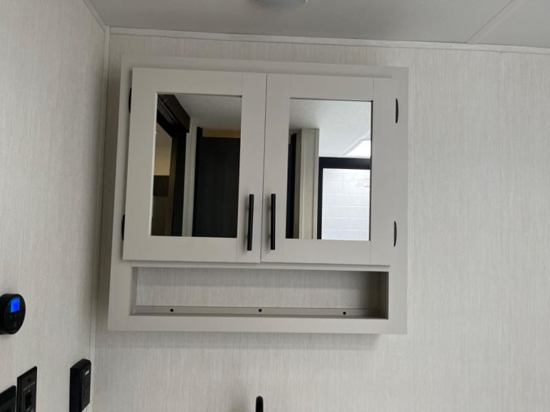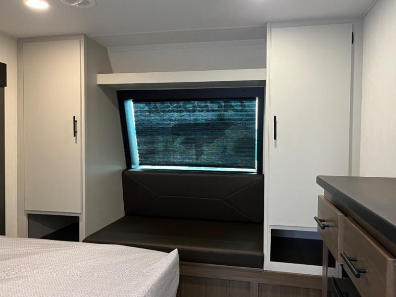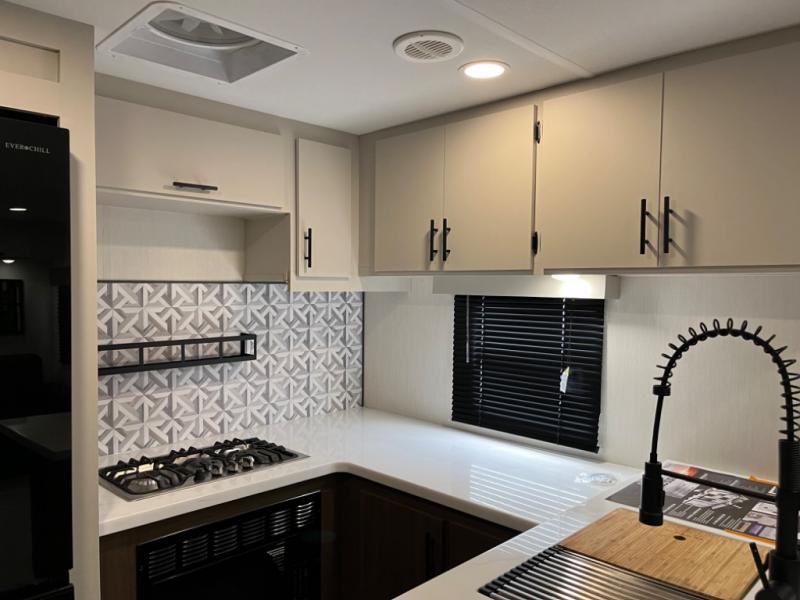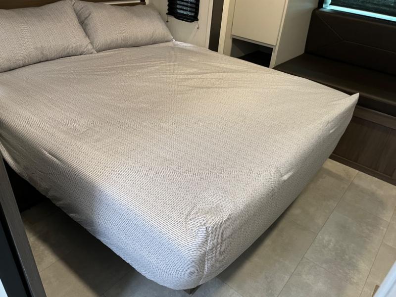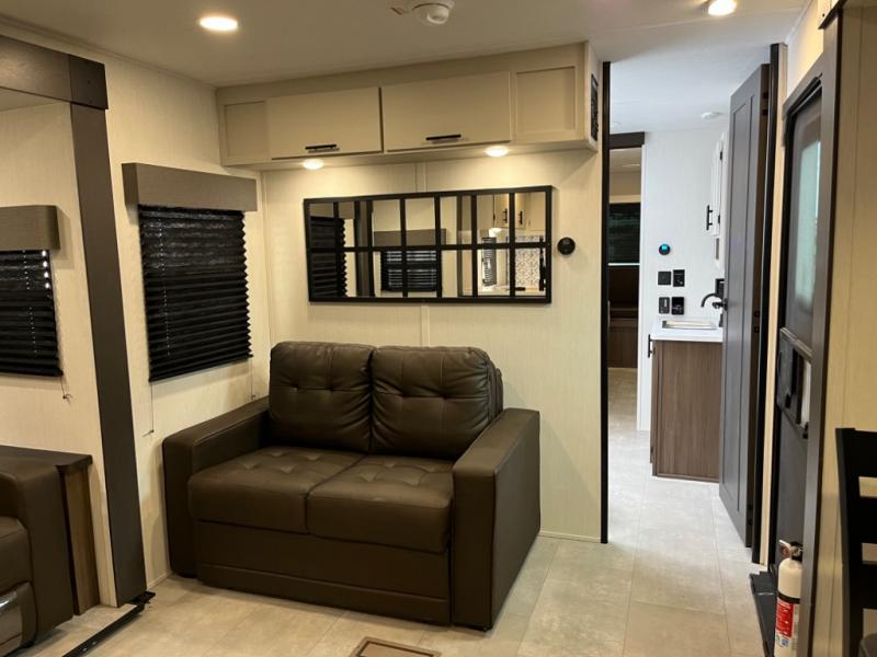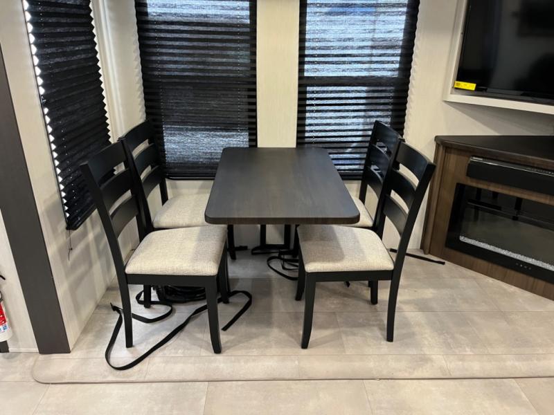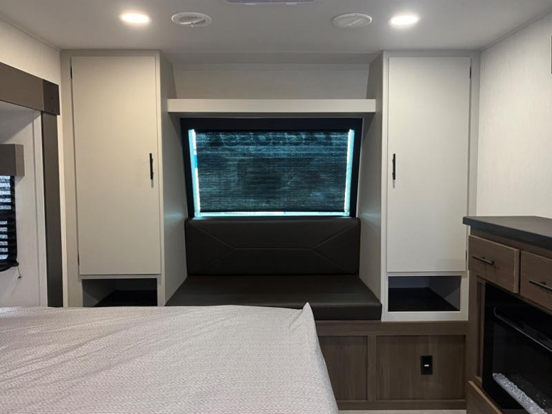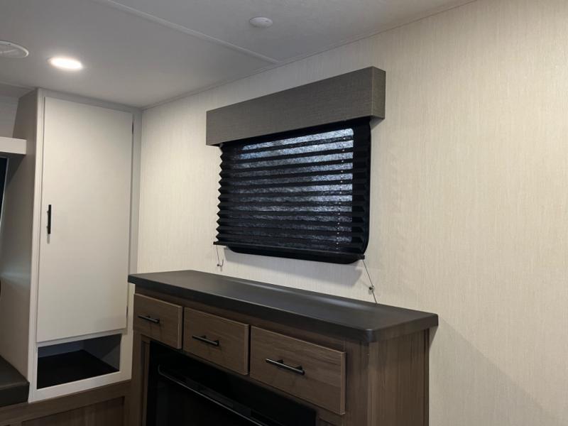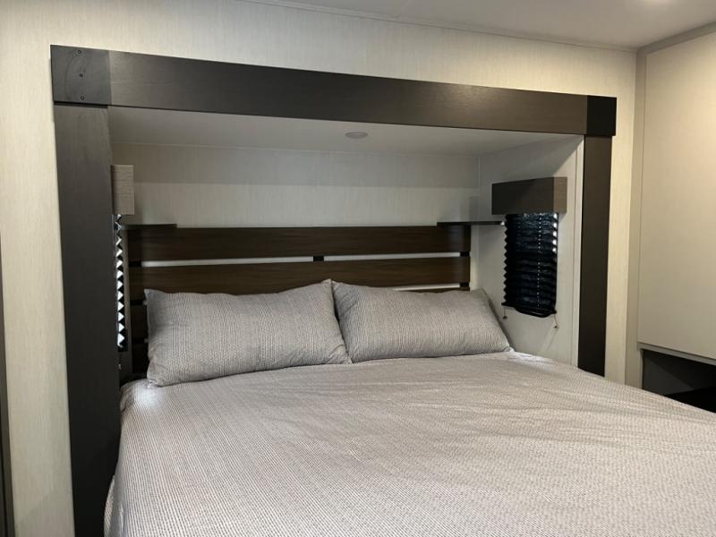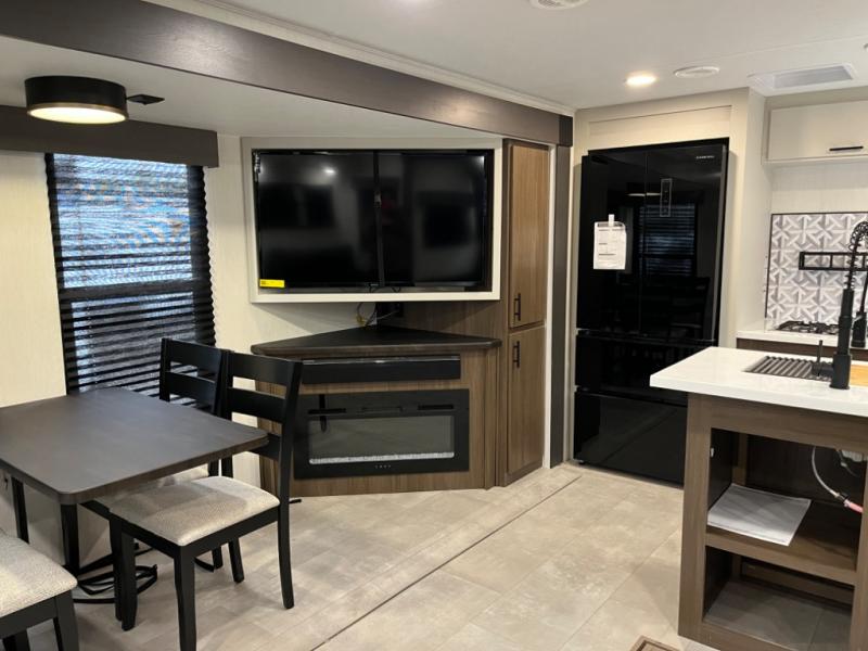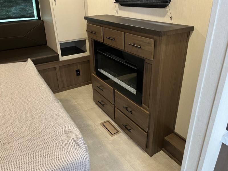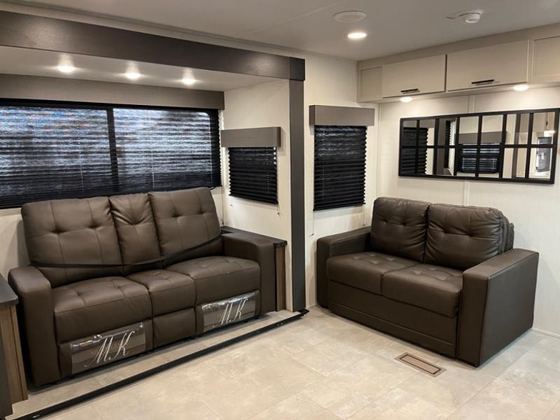 You will be ultra impressed by this LaCrosse travel trailer! First, the interior is made to feel just like your own home with its theater seating, hide-a-bed sofa, free-standing table with chairs, and entertainment center with 50" LED TV and fireplace. Second, you'll find even more residential comfort in the rear kitchen that has a three burner cooktop, a 30" microwave oven, and a 16.2 cubic foot 12V refrigerator. And lastly, the walk-through bathroom has two doors on either side with one of those doors leading directly into the front private bedroom, so you know you'll enjoy great comfort in this space each night. There is also a bedroom bench at the front of this trailer which gives you an enjoyable place to relax as you take in the views from the front windshield.