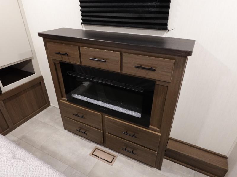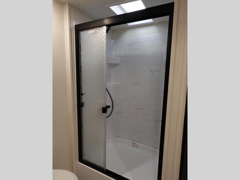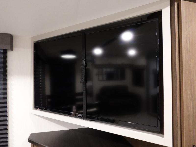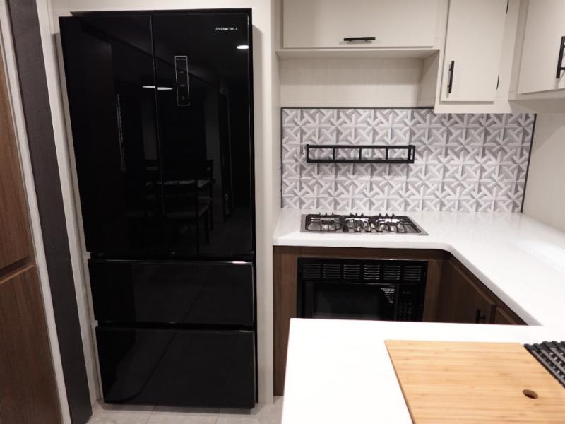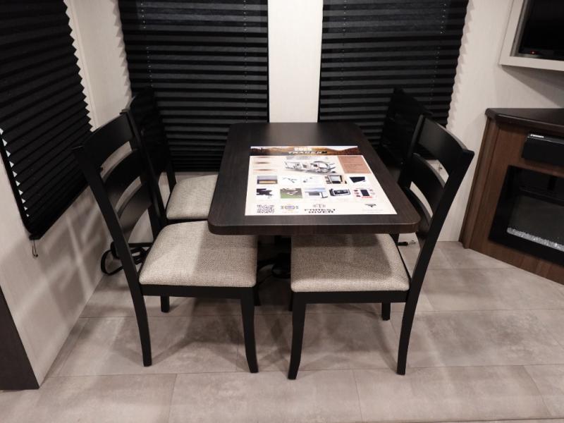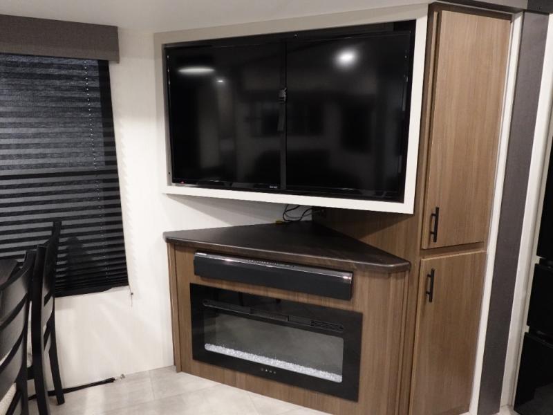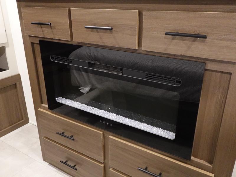 You will be ultra impressed by this LaCrosse travel trailer! First, the interior is made to feel just like your own home with its theater seating, hide-a-bed sofa, free-standing table with chairs, and entertainment center with 50" LED TV and fireplace. Second, you'll find even more residential comfort in the rear kitchen that has a three burner cooktop, a 30" microwave oven, and a 16.2 cubic foot 12V refrigerator. And lastly, the walk-through bathroom has two doors on either side with one of those doors leading directly into the front private bedroom, so you know you'll enjoy great comfort in this space each night. There is also a bedroom bench at the front of this trailer which gives you an enjoyable place to relax as you take in the views from the front windshield.