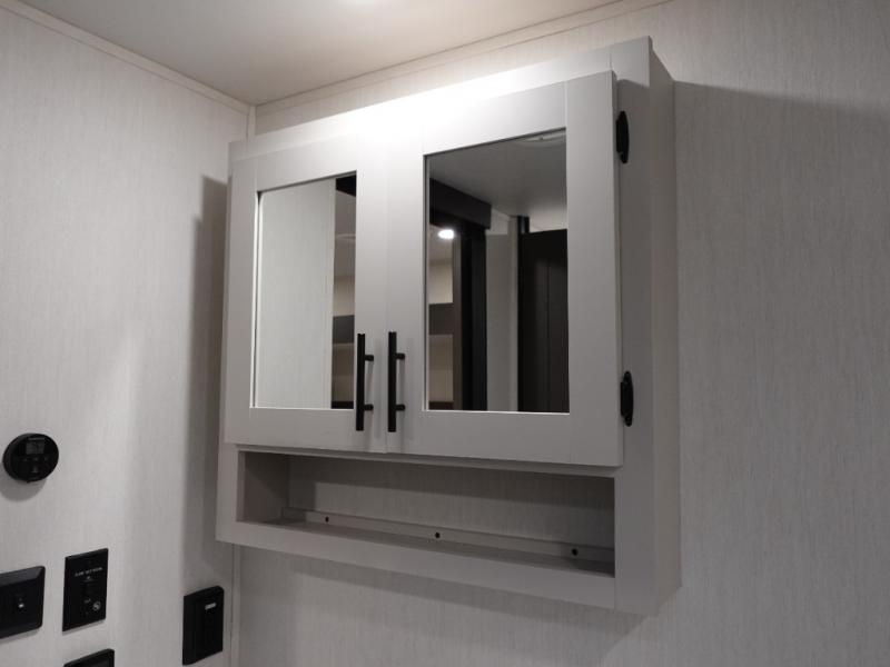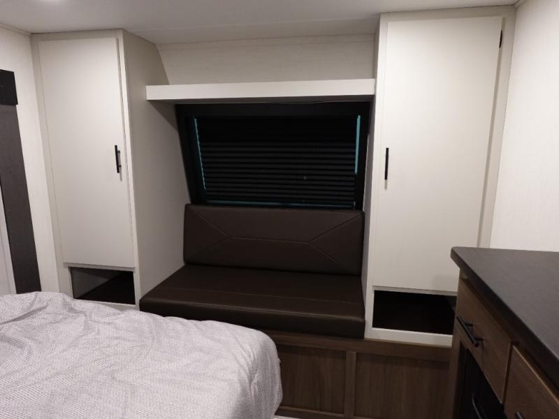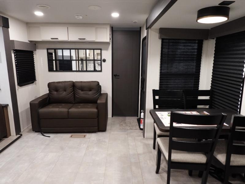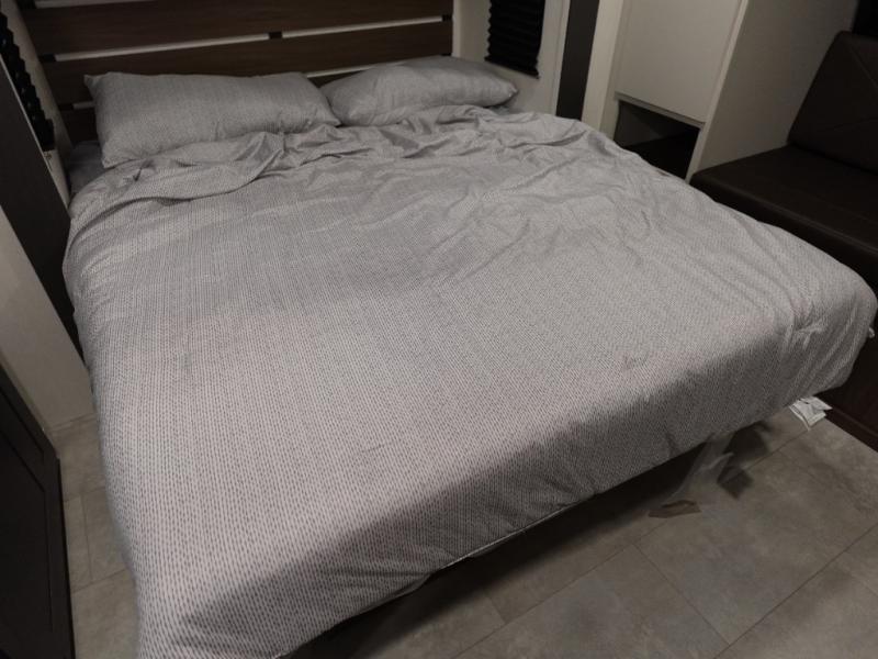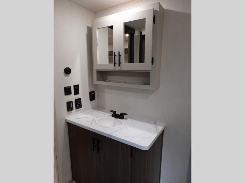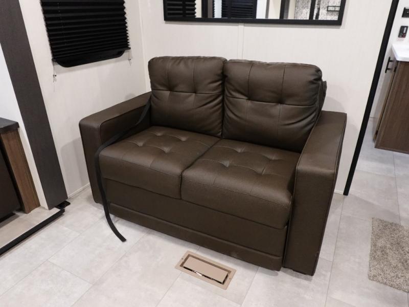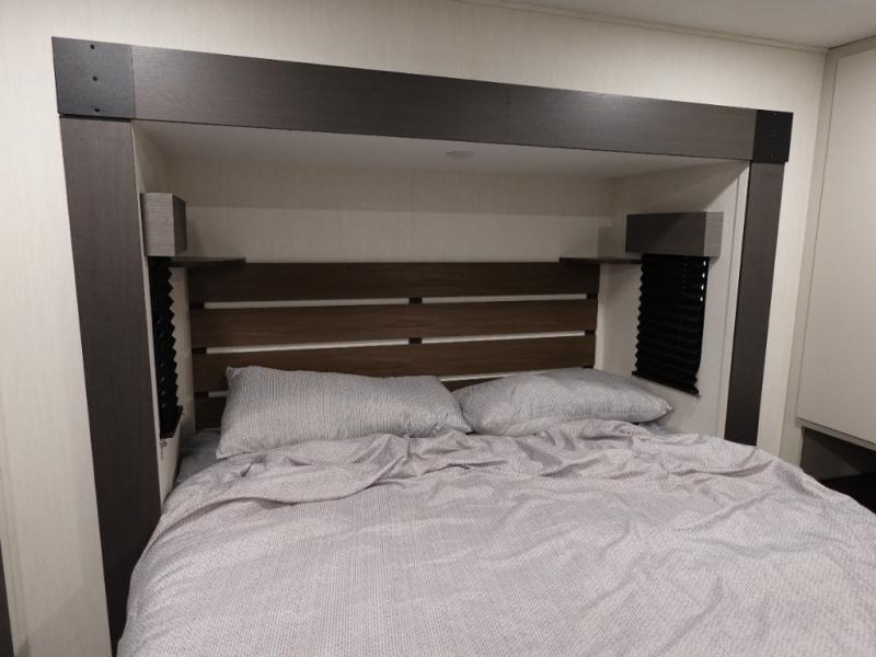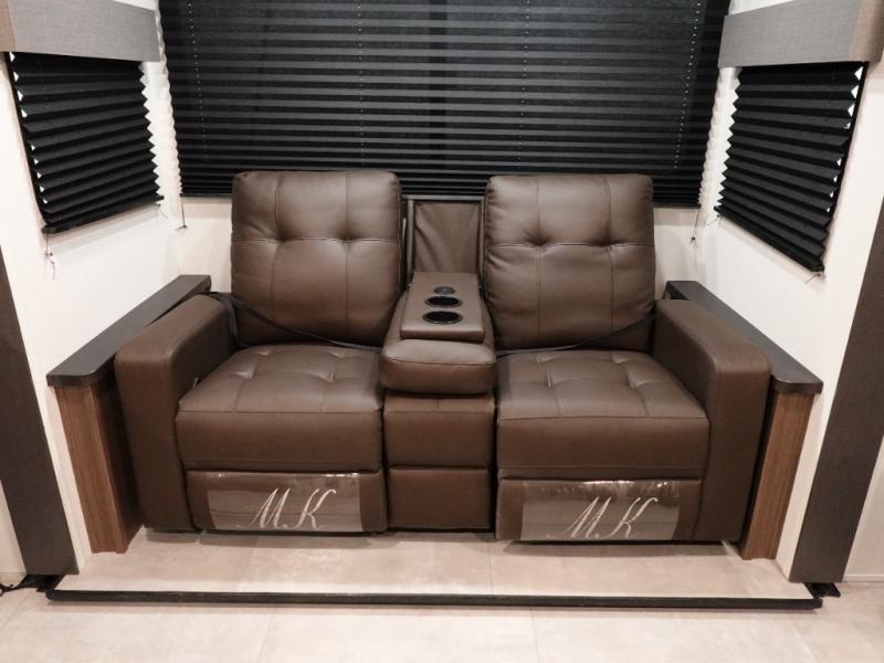 You will be ultra impressed by this LaCrosse travel trailer! First, the interior is made to feel just like your own home with its theater seating, hide-a-bed sofa, free-standing table with chairs, and entertainment center with 50" LED TV and fireplace. Second, you'll find even more residential comfort in the rear kitchen that has a three burner cooktop, a 30" microwave oven, and a 16.2 cubic foot 12V refrigerator. And lastly, the walk-through bathroom has two doors on either side with one of those doors leading directly into the front private bedroom, so you know you'll enjoy great comfort in this space each night. There is also a bedroom bench at the front of this trailer which gives you an enjoyable place to relax as you take in the views from the front windshield.