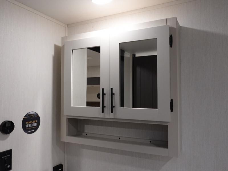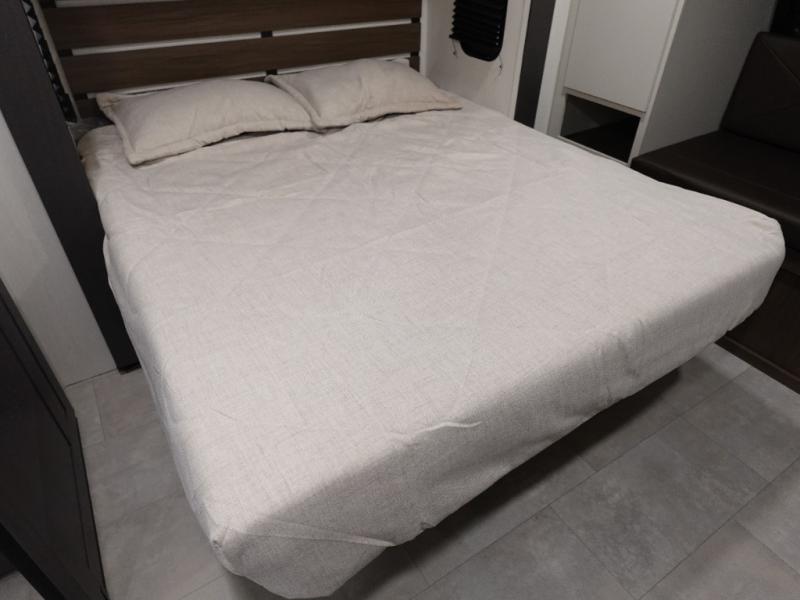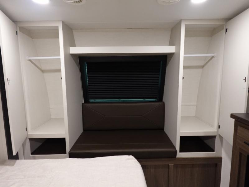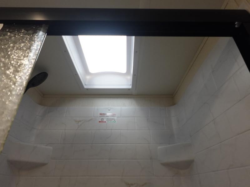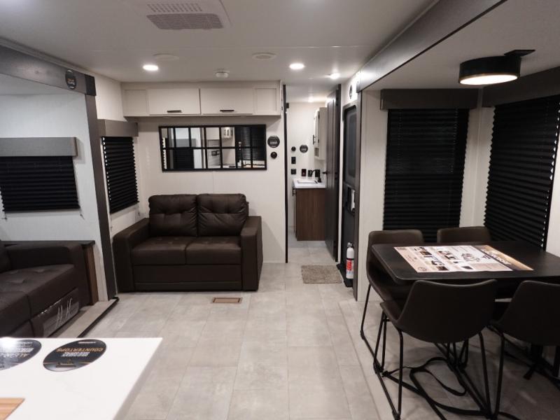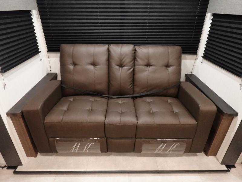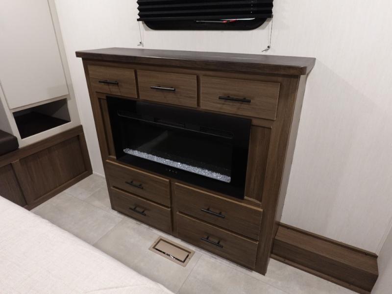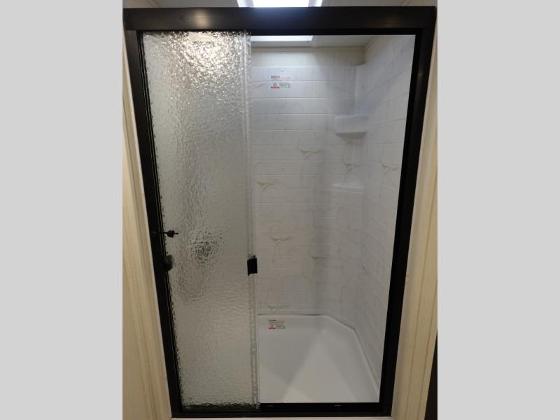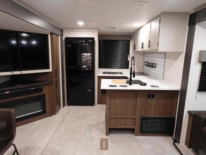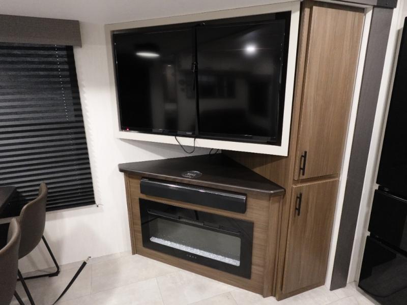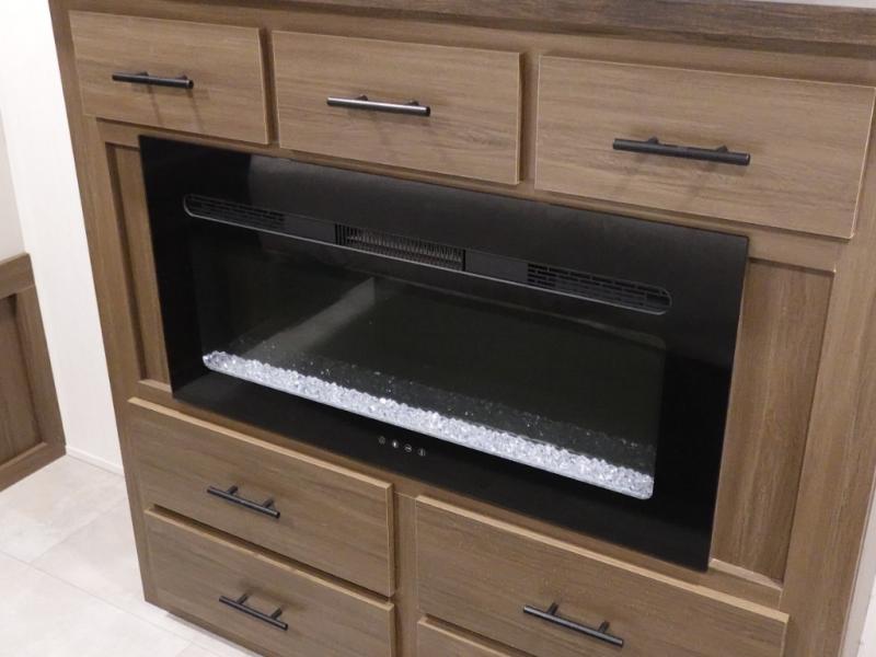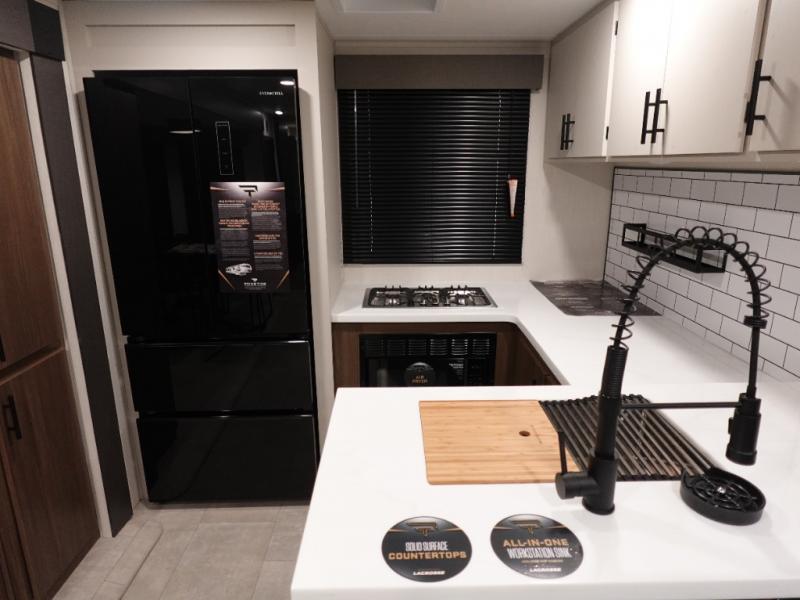 You will be ultra impressed by this LaCrosse travel trailer! First, the interior is made to feel just like your own home with its theater seating, hide-a-bed sofa, free-standing table with chairs, and entertainment center with 50" LED TV and fireplace. Second, you'll find even more residential comfort in the rear kitchen that has a three burner cooktop, a 30" microwave oven, and a 16.2 cubic foot 12V refrigerator. And lastly, the walk-through bathroom has two doors on either side with one of those doors leading directly into the front private bedroom, so you know you'll enjoy great comfort in this space each night. There is also a bedroom bench at the front of this trailer which gives you an enjoyable place to relax as you take in the views from the front windshield.