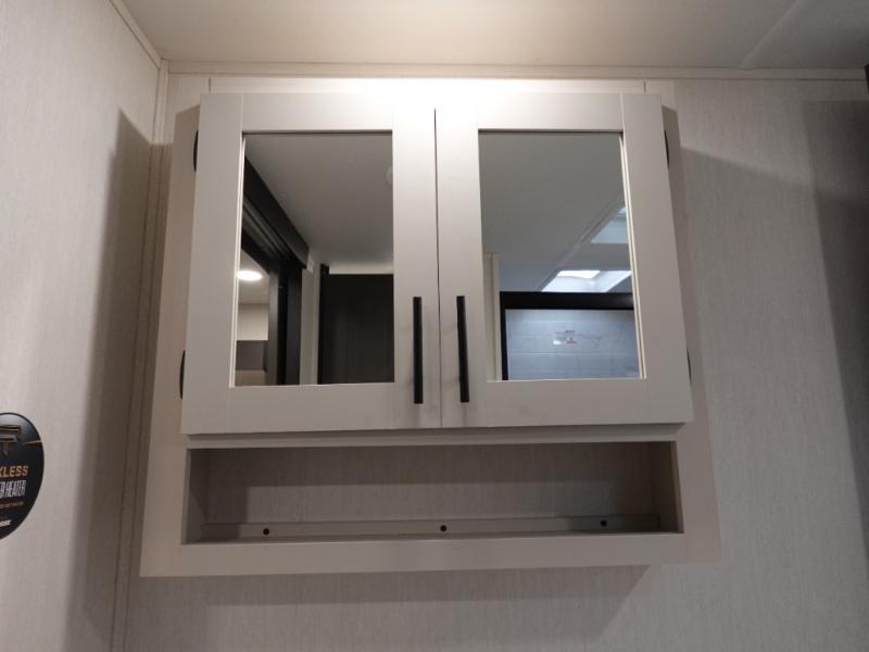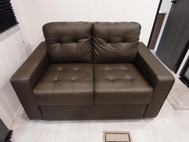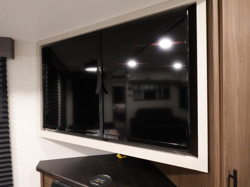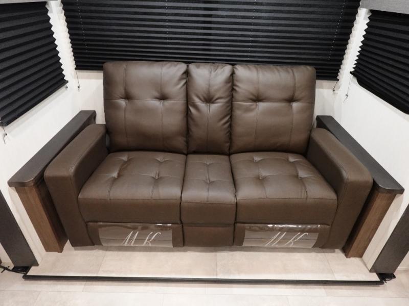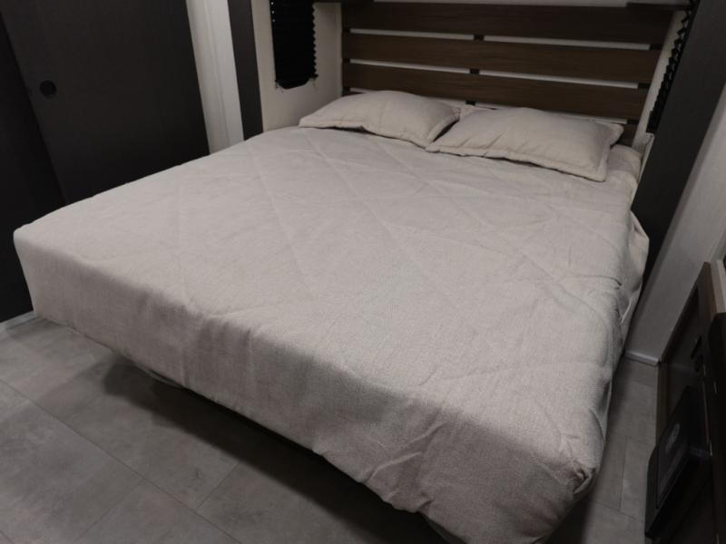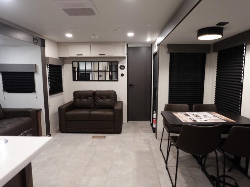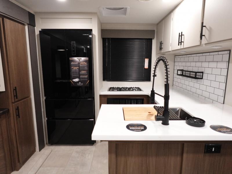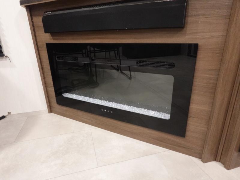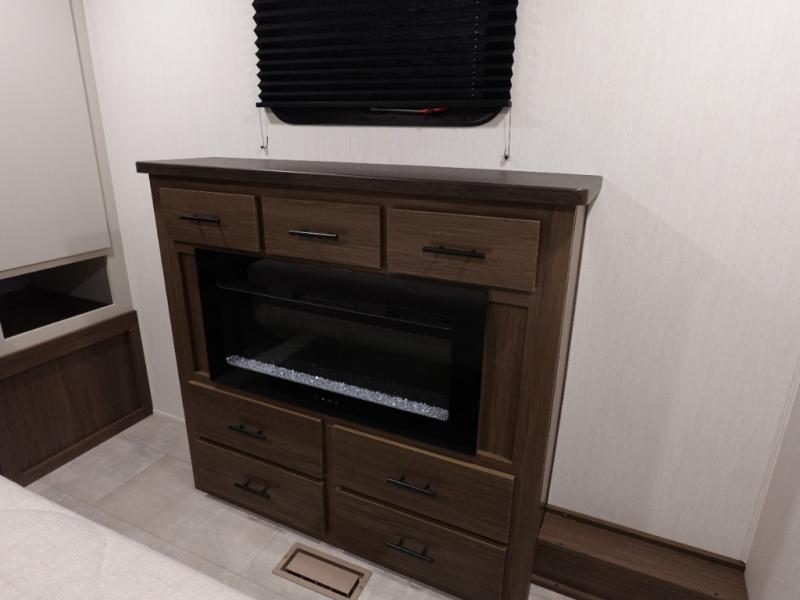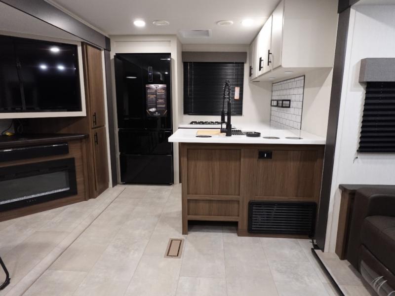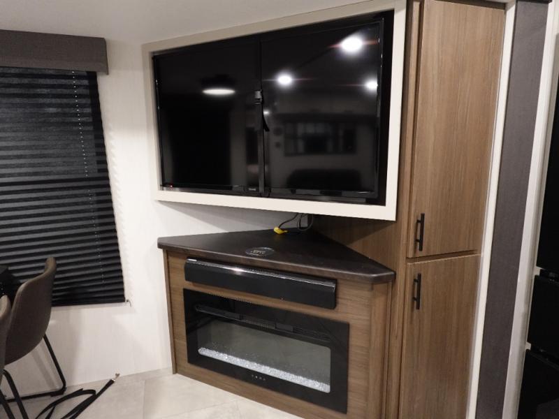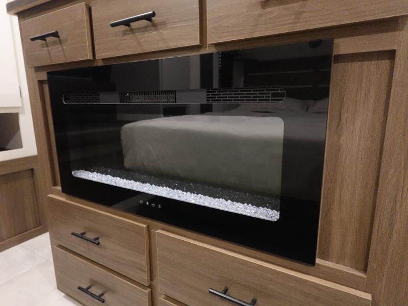 You will be ultra impressed by this LaCrosse travel trailer! First, the interior is made to feel just like your own home with its theater seating, hide-a-bed sofa, free-standing table with chairs, and entertainment center with 50" LED TV and fireplace. Second, you'll find even more residential comfort in the rear kitchen that has a three burner cooktop, a 30" microwave oven, and a 16.2 cubic foot 12V refrigerator. And lastly, the walk-through bathroom has two doors on either side with one of those doors leading directly into the front private bedroom, so you know you'll enjoy great comfort in this space each night. There is also a bedroom bench at the front of this trailer which gives you an enjoyable place to relax as you take in the views from the front windshield.