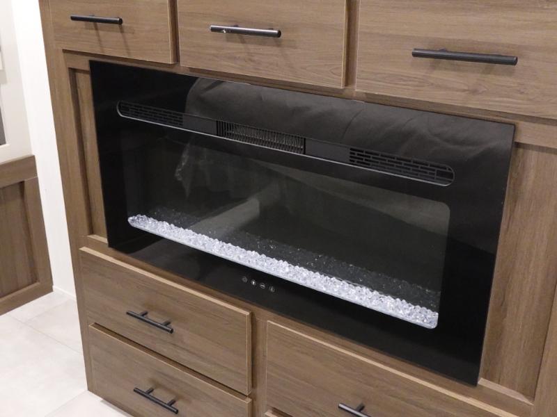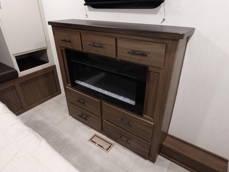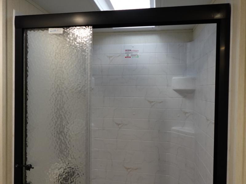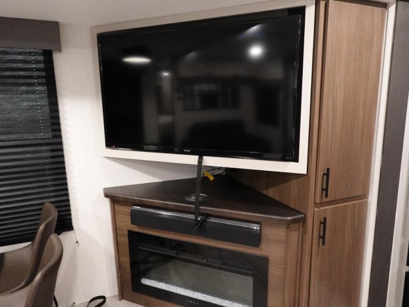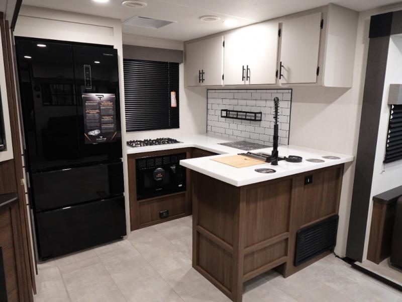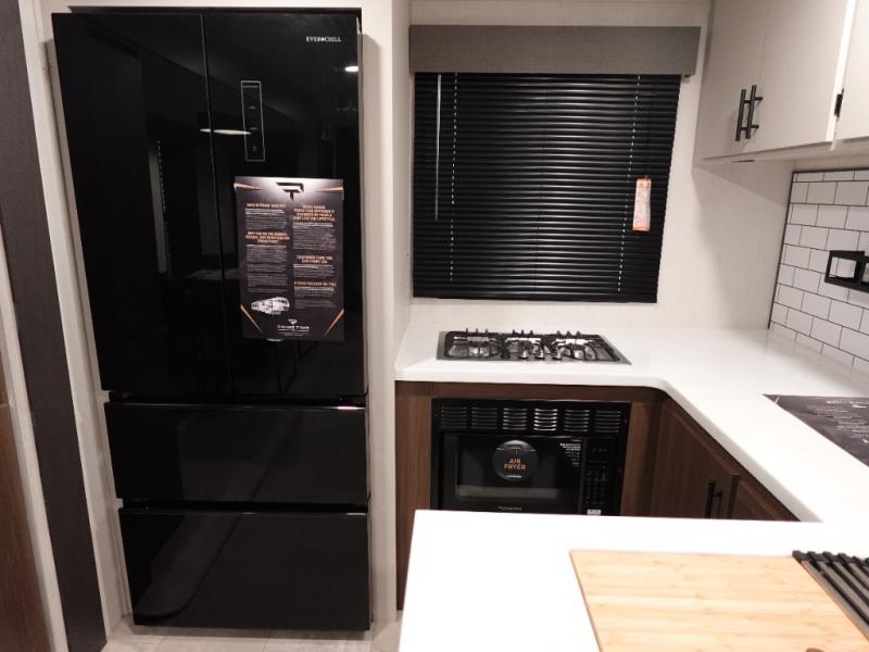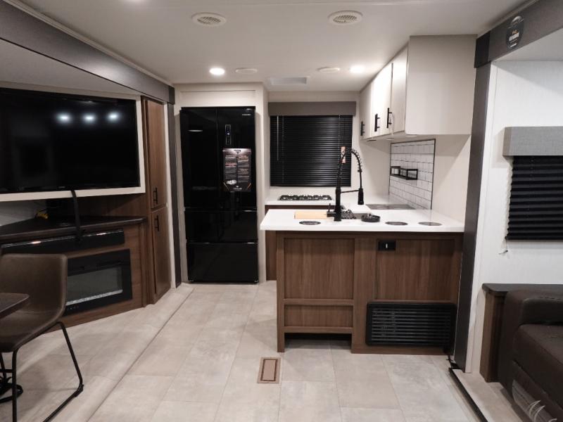 You will be ultra impressed by this LaCrosse travel trailer! First, the interior is made to feel just like your own home with its theater seating, hide-a-bed sofa, free-standing table with chairs, and entertainment center with 50" LED TV and fireplace. Second, you'll find even more residential comfort in the rear kitchen that has a three burner cooktop, a 30" microwave oven, and a 16.2 cubic foot 12V refrigerator. And lastly, the walk-through bathroom has two doors on either side with one of those doors leading directly into the front private bedroom, so you know you'll enjoy great comfort in this space each night. There is also a bedroom bench at the front of this trailer which gives you an enjoyable place to relax as you take in the views from the front windshield.