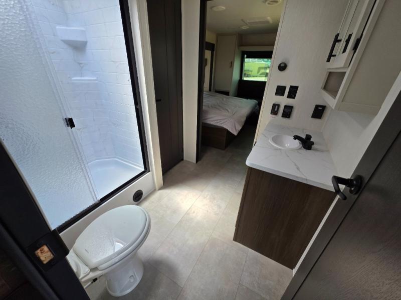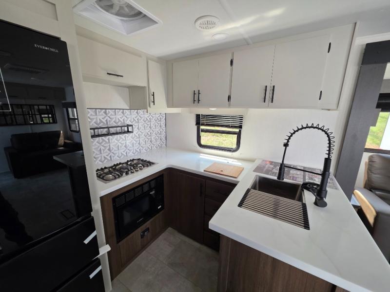 You will be ultra impressed by this LaCrosse travel trailer! First, the interior is made to feel just like your own home with its theater seating, hide-a-bed sofa, free-standing table with chairs, and entertainment center with 50" LED TV and fireplace. Second, you'll find even more residential comfort in the rear kitchen that has a three burner cooktop, a 30" microwave oven, and a 16.2 cubic foot 12V refrigerator. And lastly, the walk-through bathroom has two doors on either side with one of those doors leading directly into the front private bedroom, so you know you'll enjoy great comfort in this space each night. There is also a bedroom bench at the front of this trailer which gives you an enjoyable place to relax as you take in the views from the front windshield.