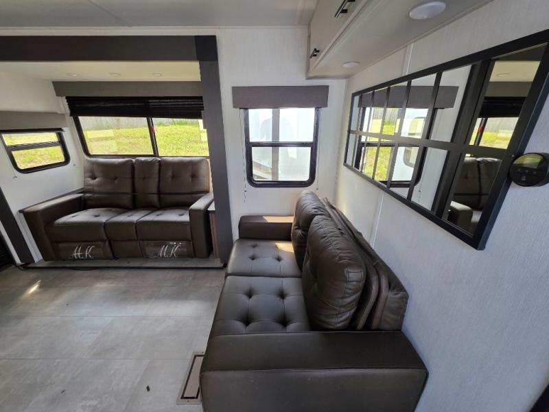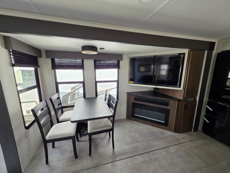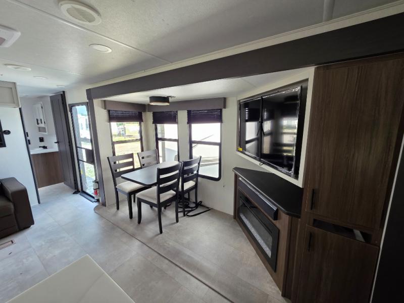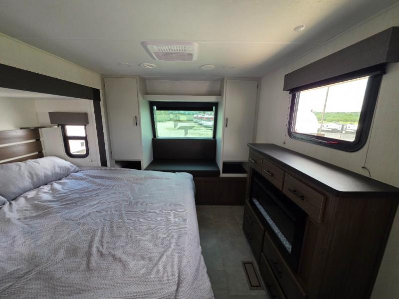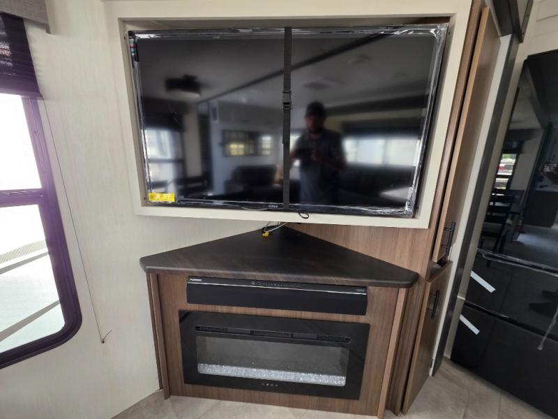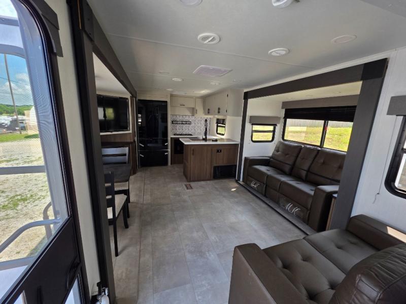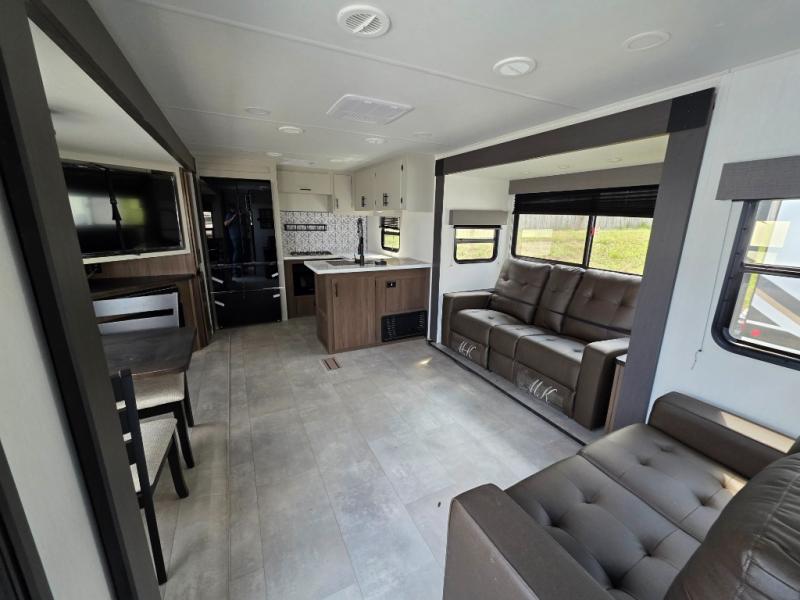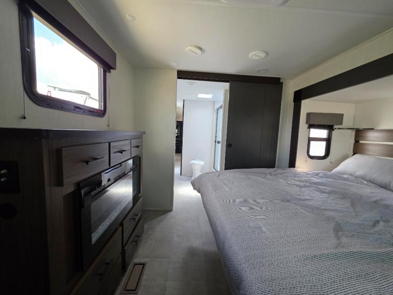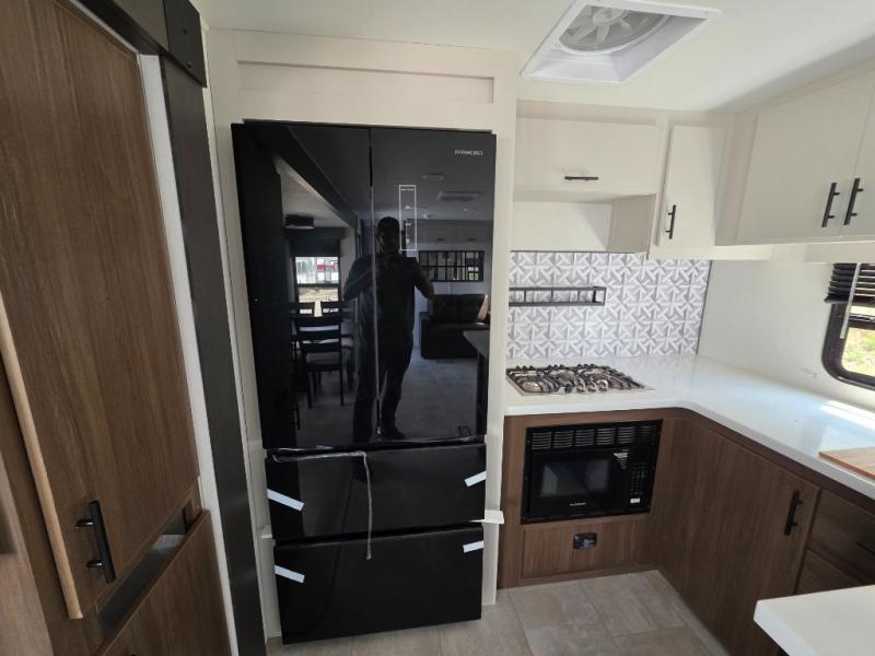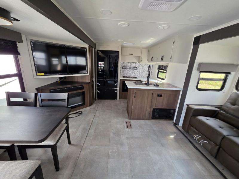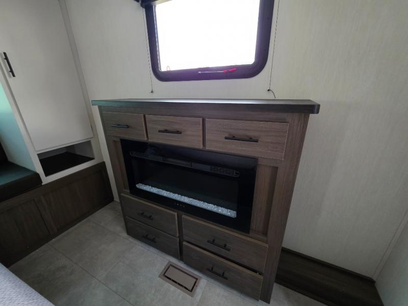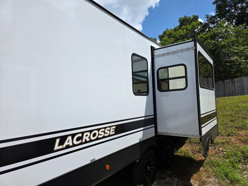You will be ultra impressed by this LaCrosse travel trailer! First, the interior is made to feel just like your own home with its theater seating, hide-a-bed sofa, free-standing table with chairs, and entertainment center with 50" LED TV and fireplace. Second, you'll find even more residential comfort in the rear kitchen that has a three burner cooktop, a 30" microwave oven, and a 16.2 cubic foot 12V refrigerator. And lastly, the walk-through bathroom has two doors on either side with one of those doors leading directly into the front private bedroom, so you know you'll enjoy great comfort in this space each night. There is also a bedroom bench at the front of this trailer which gives you an enjoyable place to relax as you take in the views from the front windshield.