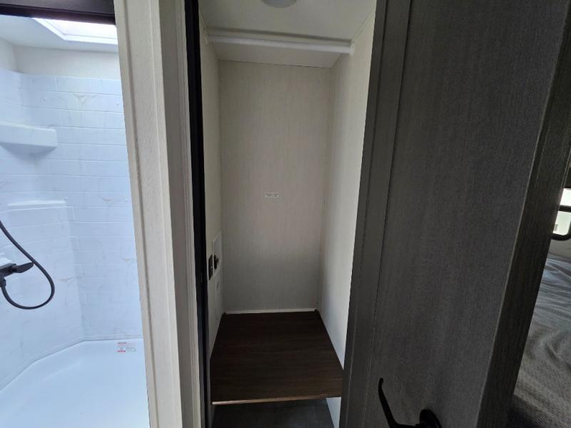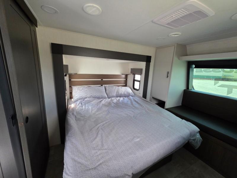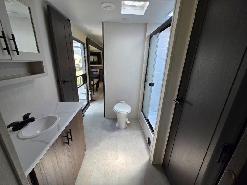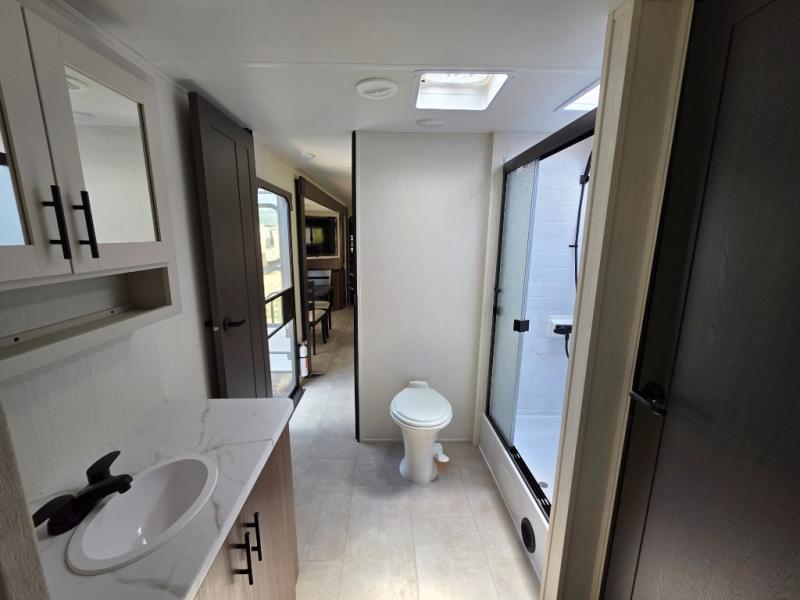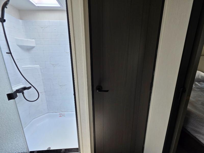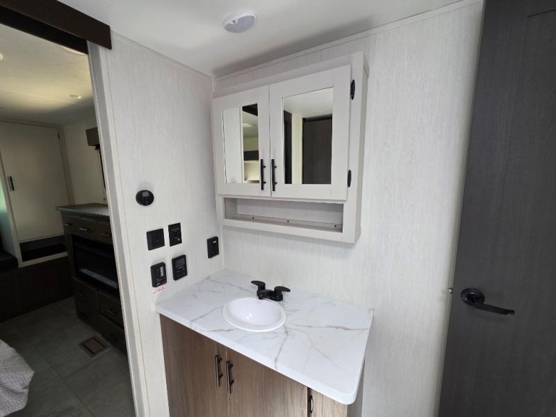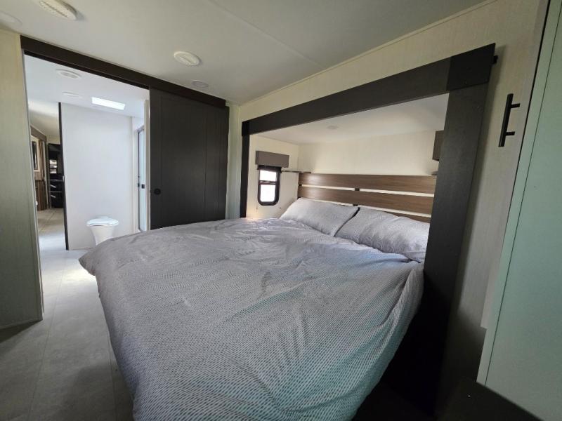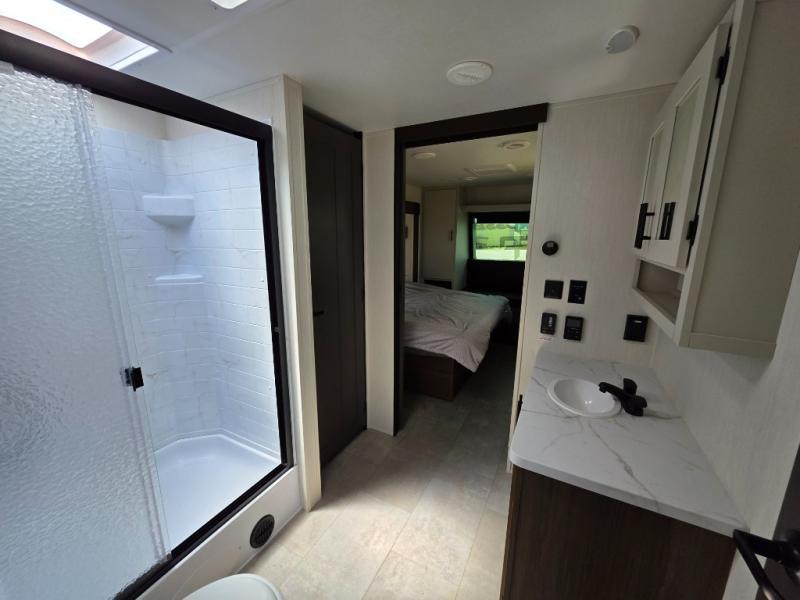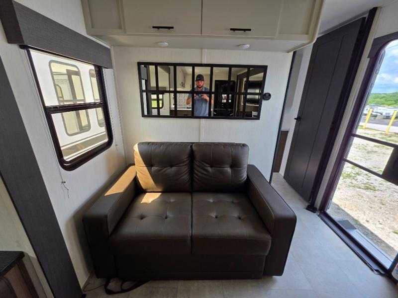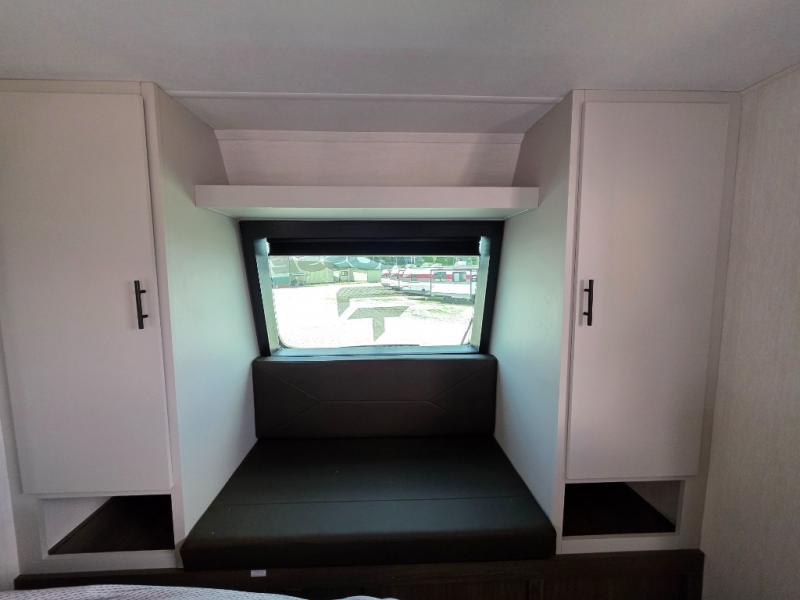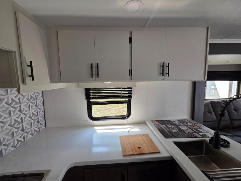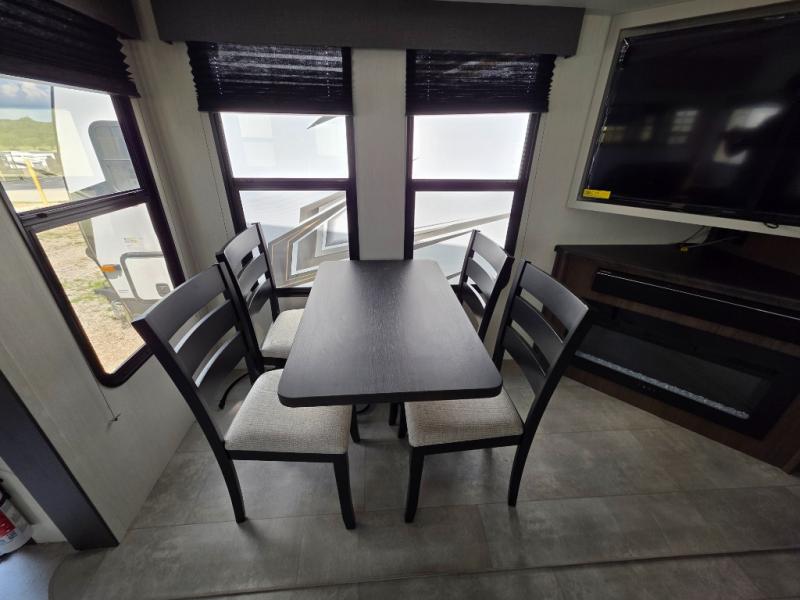 You will be ultra impressed by this LaCrosse travel trailer! First, the interior is made to feel just like your own home with its theater seating, hide-a-bed sofa, free-standing table with chairs, and entertainment center with 50" LED TV and fireplace. Second, you'll find even more residential comfort in the rear kitchen that has a three burner cooktop, a 30" microwave oven, and a 16.2 cubic foot 12V refrigerator. And lastly, the walk-through bathroom has two doors on either side with one of those doors leading directly into the front private bedroom, so you know you'll enjoy great comfort in this space each night. There is also a bedroom bench at the front of this trailer which gives you an enjoyable place to relax as you take in the views from the front windshield.