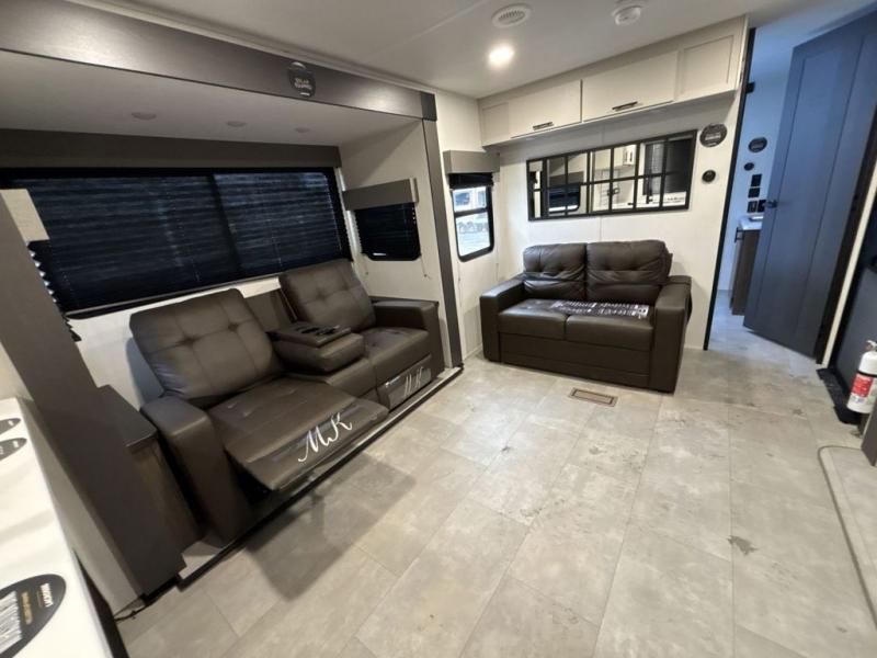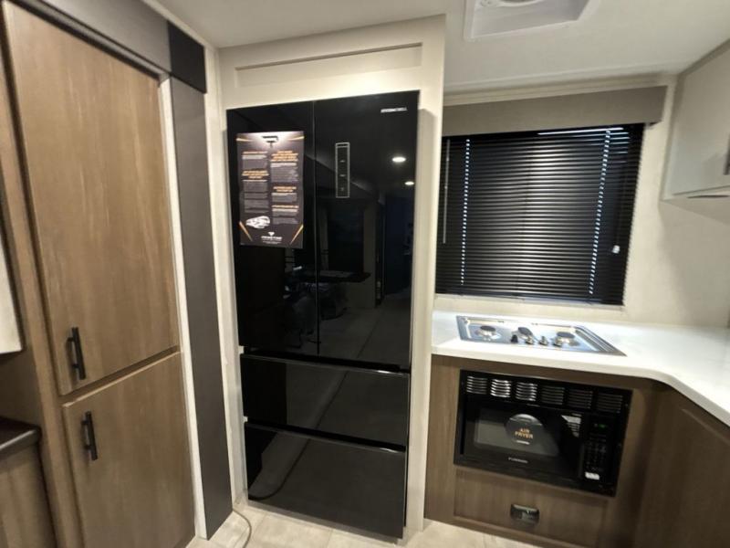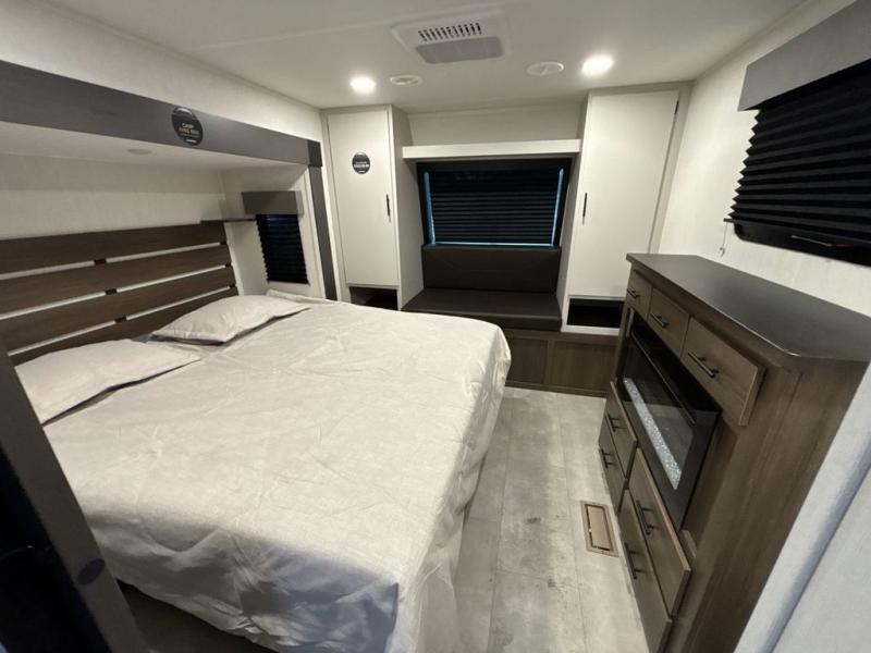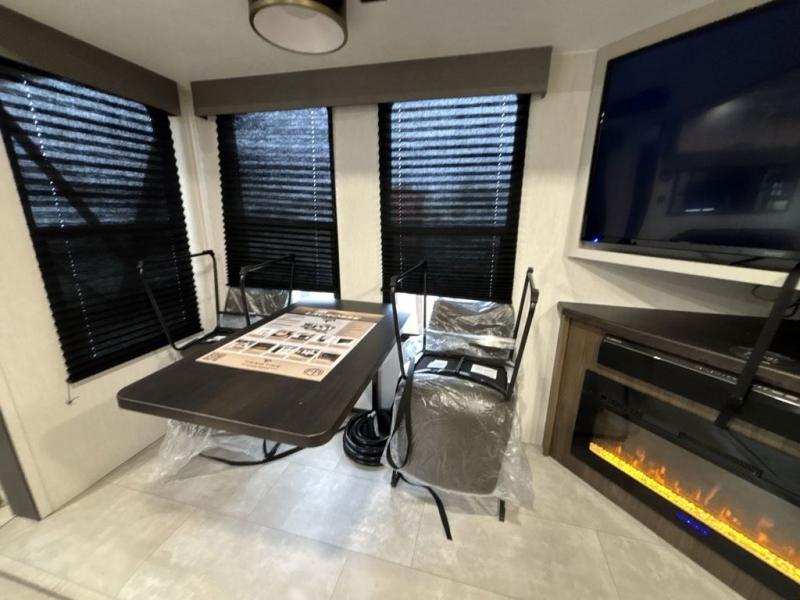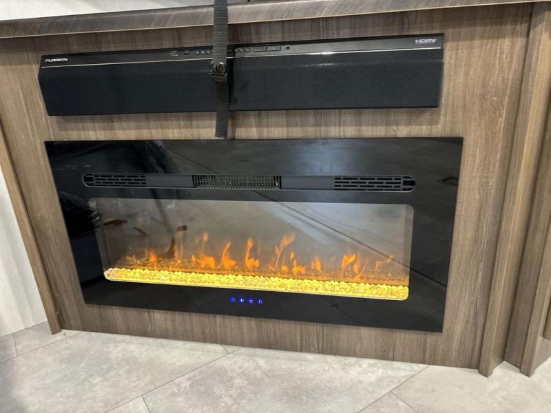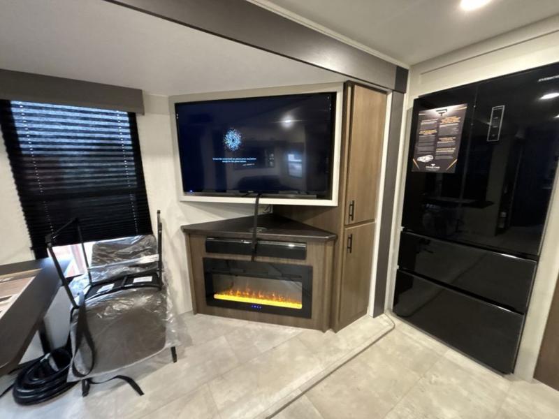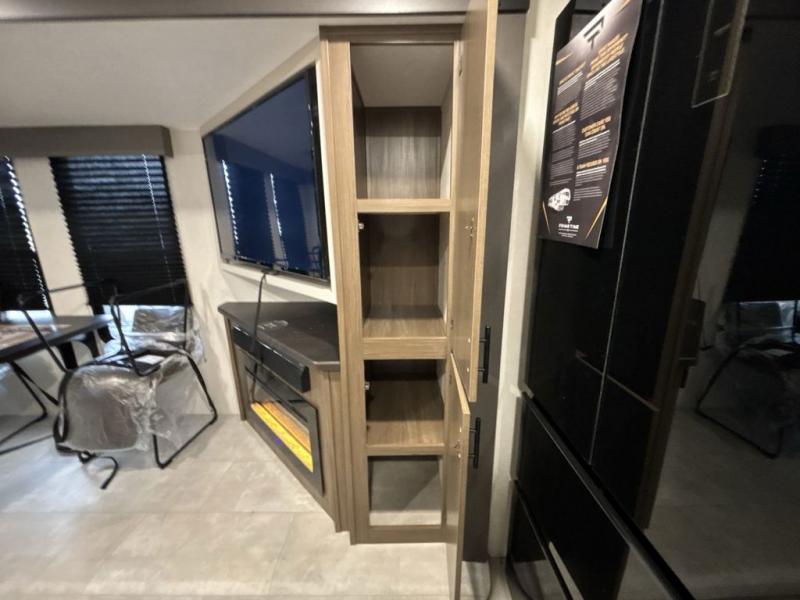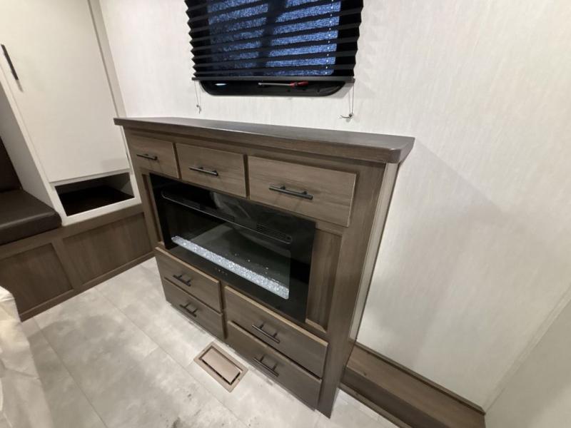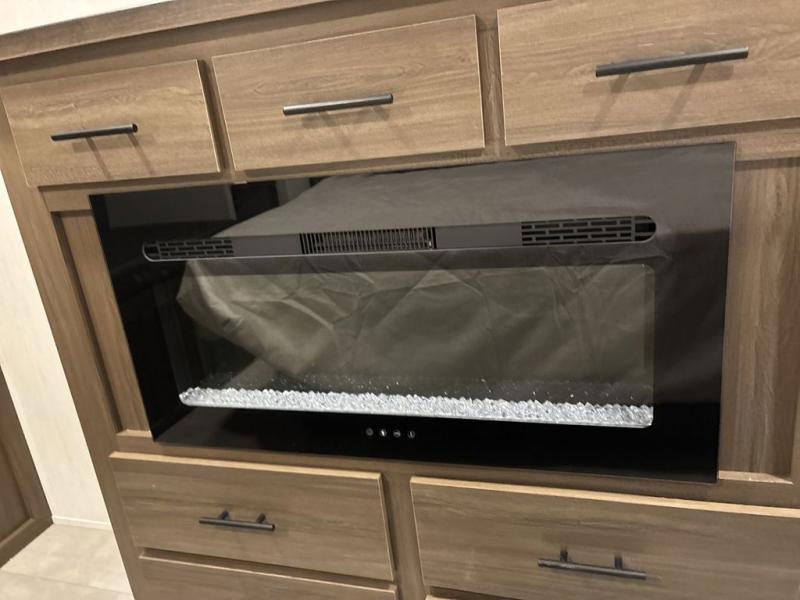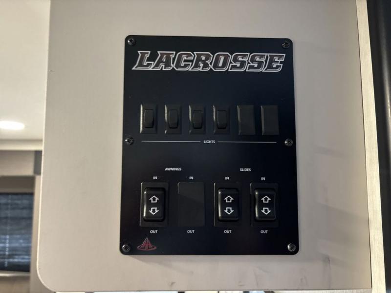 You will be ultra impressed by this LaCrosse travel trailer! First, the interior is made to feel just like your own home with its theater seating, hide-a-bed sofa, free-standing table with chairs, and entertainment center with 50" LED TV and fireplace. Second, you'll find even more residential comfort in the rear kitchen that has a three burner cooktop, a 30" microwave oven, and a 16.2 cubic foot 12V refrigerator. And lastly, the walk-through bathroom has two doors on either side with one of those doors leading directly into the front private bedroom, so you know you'll enjoy great comfort in this space each night. There is also a bedroom bench at the front of this trailer which gives you an enjoyable place to relax as you take in the views from the front windshield.