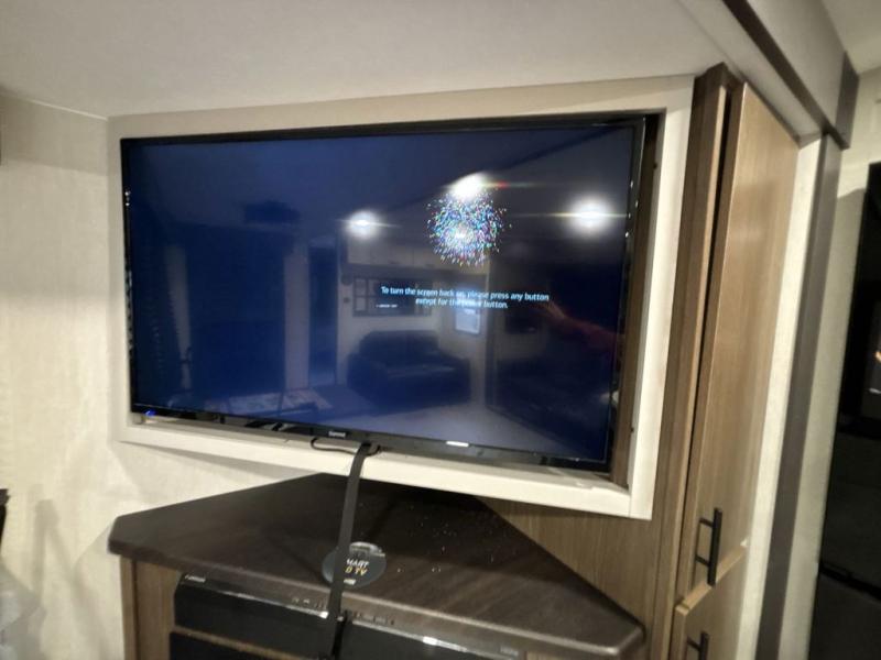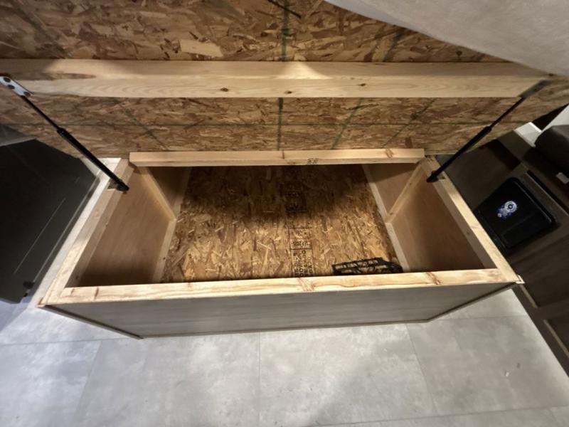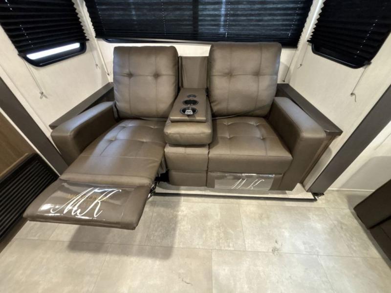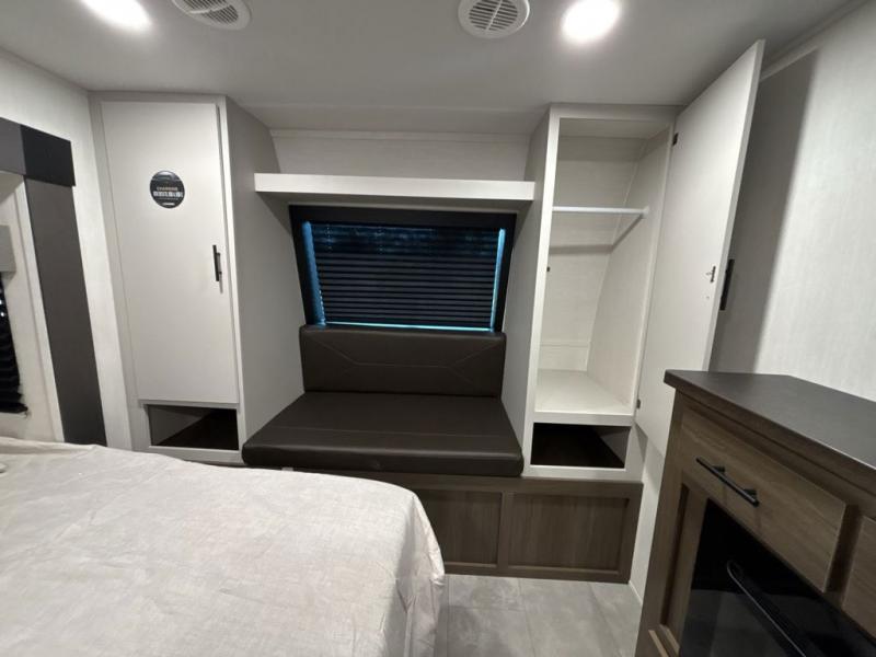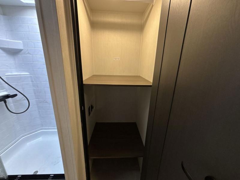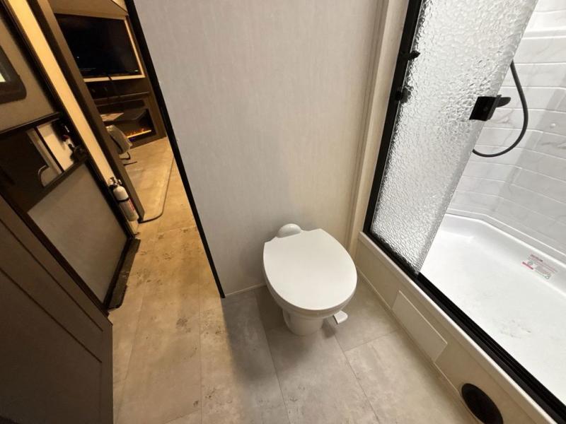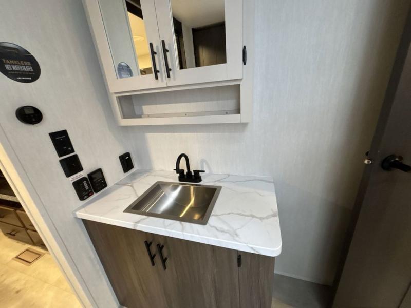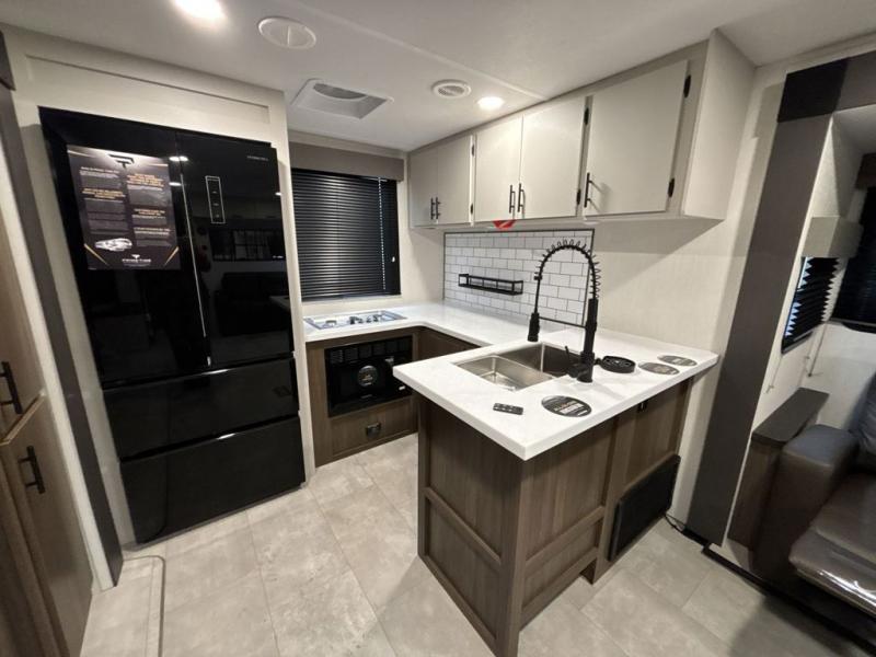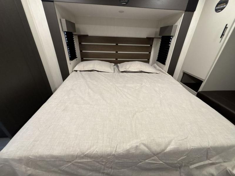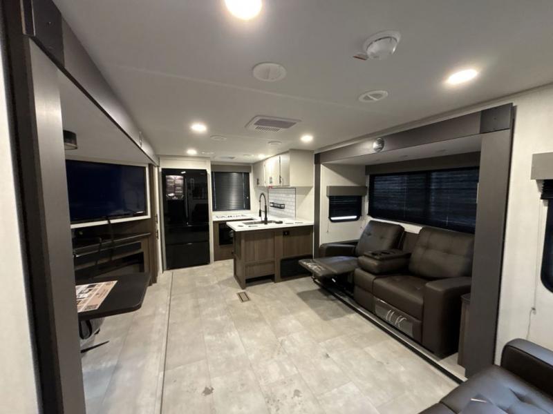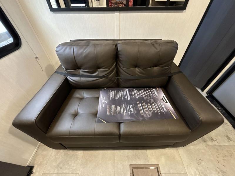 You will be ultra impressed by this LaCrosse travel trailer! First, the interior is made to feel just like your own home with its theater seating, hide-a-bed sofa, free-standing table with chairs, and entertainment center with 50" LED TV and fireplace. Second, you'll find even more residential comfort in the rear kitchen that has a three burner cooktop, a 30" microwave oven, and a 16.2 cubic foot 12V refrigerator. And lastly, the walk-through bathroom has two doors on either side with one of those doors leading directly into the front private bedroom, so you know you'll enjoy great comfort in this space each night. There is also a bedroom bench at the front of this trailer which gives you an enjoyable place to relax as you take in the views from the front windshield.