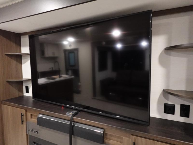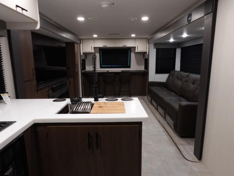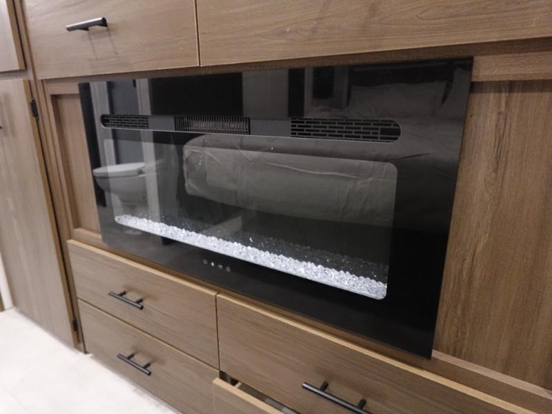 This Lacrosse travel trailer is made for entertaining! The living room is a standout with its unique bar seating at the large front window. This is perfect for eating and drinking, or use it as desk space to work from the road. The sofa sits in its own slide out for extra comfort, and has a great view of the enormous entertainment center with fireplace and 70" TV. A second fireplace warms up the rear bedroom, which also features a king bed slide for maximum floor space. There's a full bath, a well-equipped kitchen, and plenty of storage space. Invite your friends along for a great time!