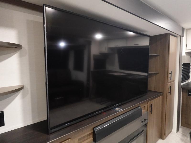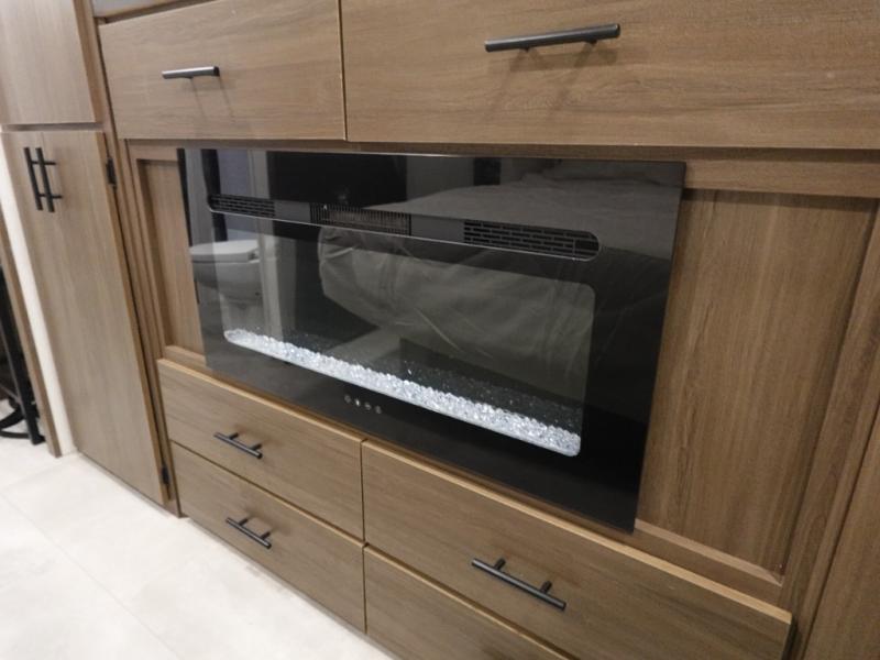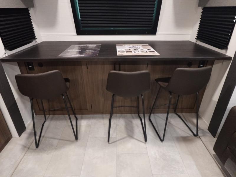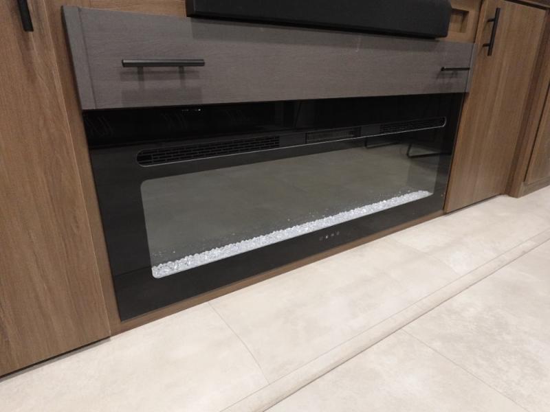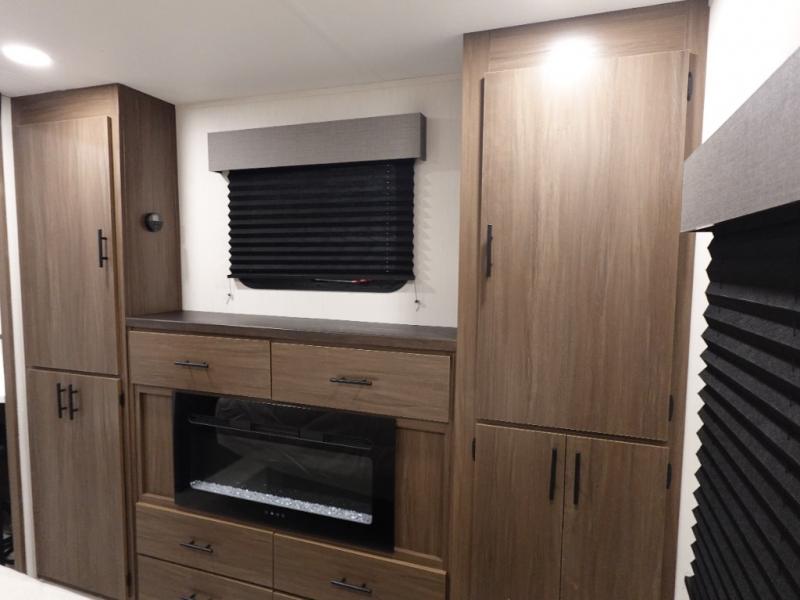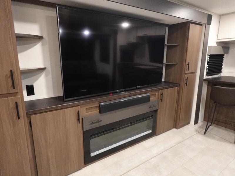 This Lacrosse travel trailer is made for entertaining! The living room is a standout with its unique bar seating at the large front window. This is perfect for eating and drinking, or use it as desk space to work from the road. The sofa sits in its own slide out for extra comfort, and has a great view of the enormous entertainment center with fireplace and 70" TV. A second fireplace warms up the rear bedroom, which also features a king bed slide for maximum floor space. There's a full bath, a well-equipped kitchen, and plenty of storage space. Invite your friends along for a great time!