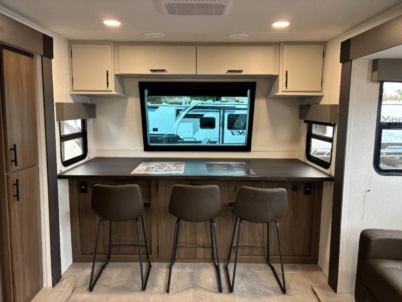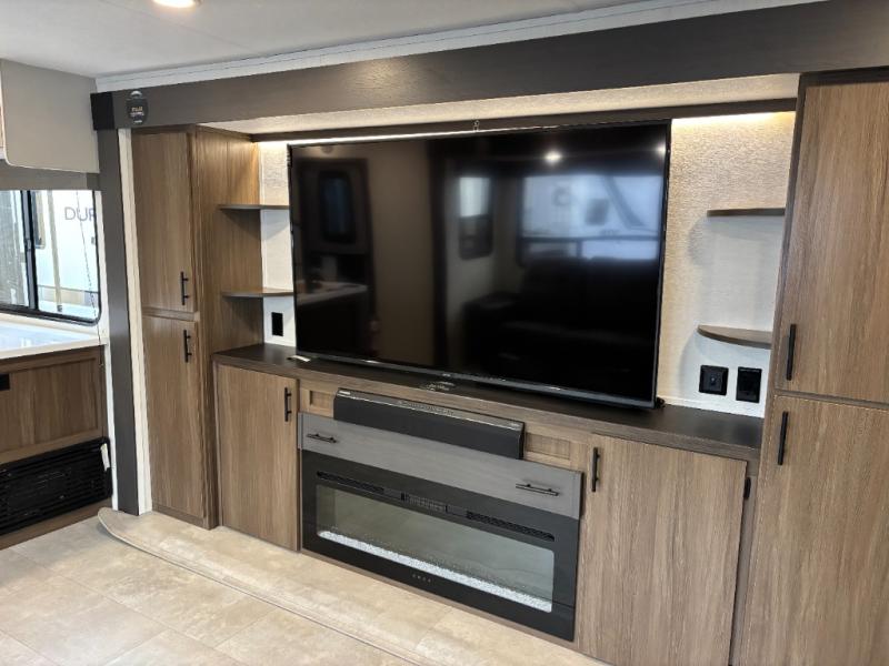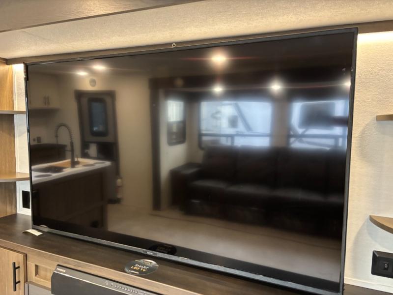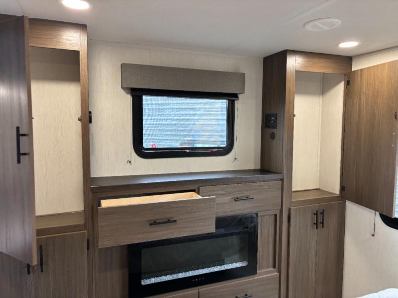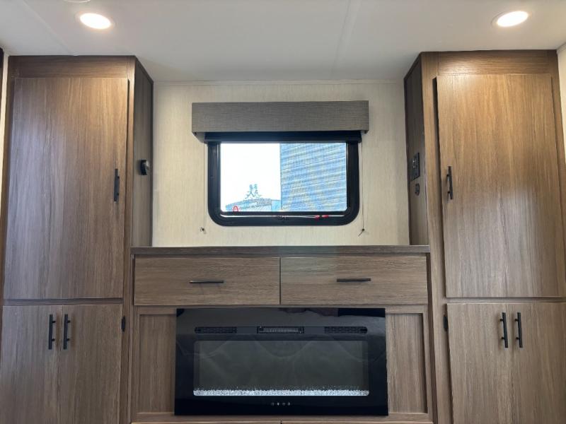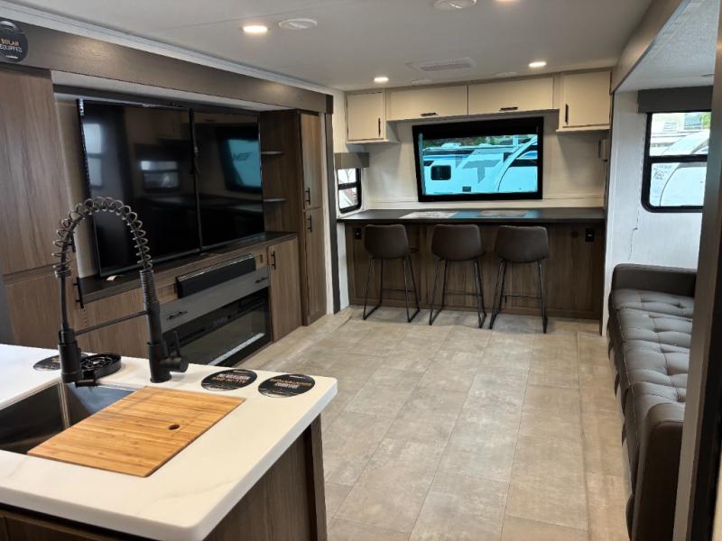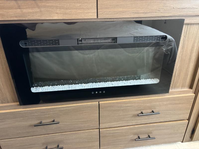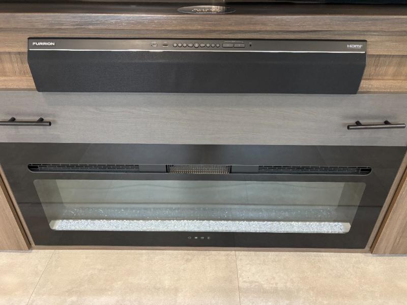 This Lacrosse travel trailer is made for entertaining! The living room is a standout with its unique bar seating at the large front window. This is perfect for eating and drinking, or use it as desk space to work from the road. The sofa sits in its own slide out for extra comfort, and has a great view of the enormous entertainment center with fireplace and 70" TV. A second fireplace warms up the rear bedroom, which also features a king bed slide for maximum floor space. There's a full bath, a well-equipped kitchen, and plenty of storage space. Invite your friends along for a great time!