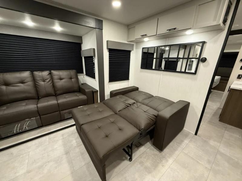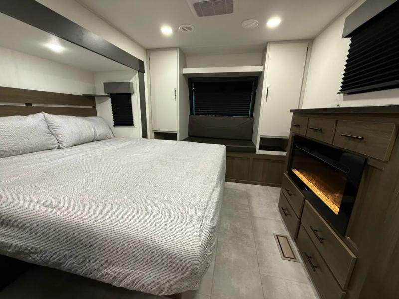 Privacy abounds in this travel trailer with a bedroom at each end! A king bed slide in the front has its own fireplace for cozy nights. Dual wardrobes frame the reading bench which looks out the front window for peaceful moments appreciating the view. At the rear, a second bedroom with queen bed has its own half bath. A pantry closet here also had prep for an optional washer/dryer for convenience on the road. In the center everyone can meet up in the spacious kitchen/living room. A hide-a-bed sofa has even more sleeping space, or relax there and watch the TV which is in the entertainment center along with another fireplace. The kitchen is well-equipped with a three-burner cooktop, microwave, and even an island where the sink is located for easy meal prep. Outside there are not one but two 10' power awnings for extra protection from the elements!