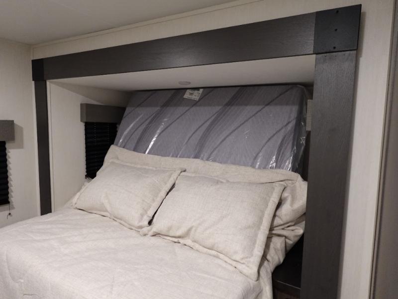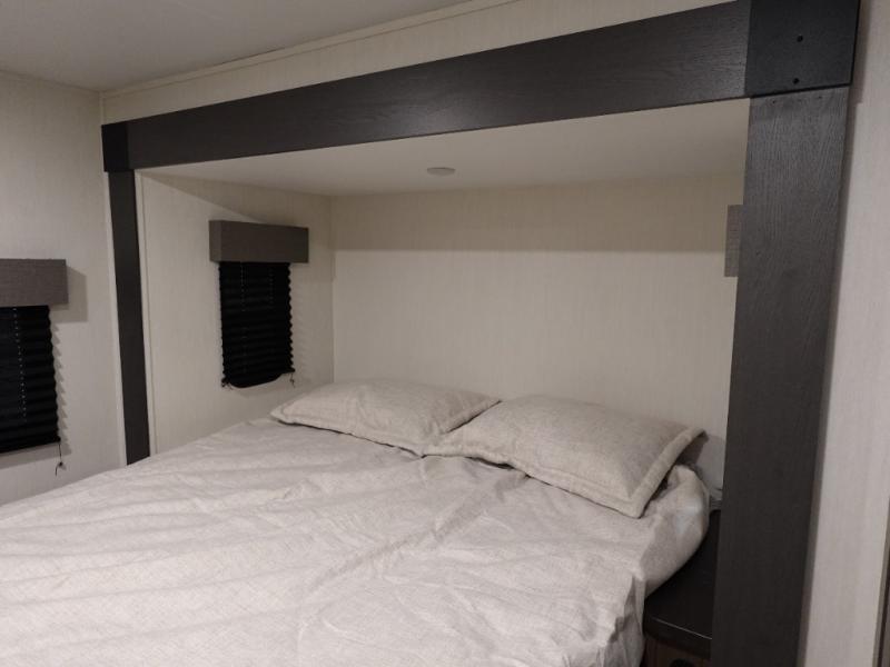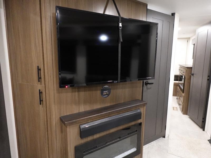 Privacy abounds in this travel trailer with a bedroom at each end! A king bed slide in the front has its own fireplace for cozy nights. Dual wardrobes frame the reading bench which looks out the front window for peaceful moments appreciating the view. At the rear, a second bedroom with queen bed has its own half bath. A pantry closet here also has prep for an optional washer/dryer for convenience on the road. In the center everyone can meet up in the spacious kitchen/living room. A hide-a-bed sofa has even more sleeping space, or relax there and watch the TV which is in the entertainment center along with another fireplace. The kitchen is well-equipped with a three-burner cooktop, microwave, and even an island where the sink is located for easy meal prep. Outside there are not one but two 10' power awnings for extra protection from the elements!