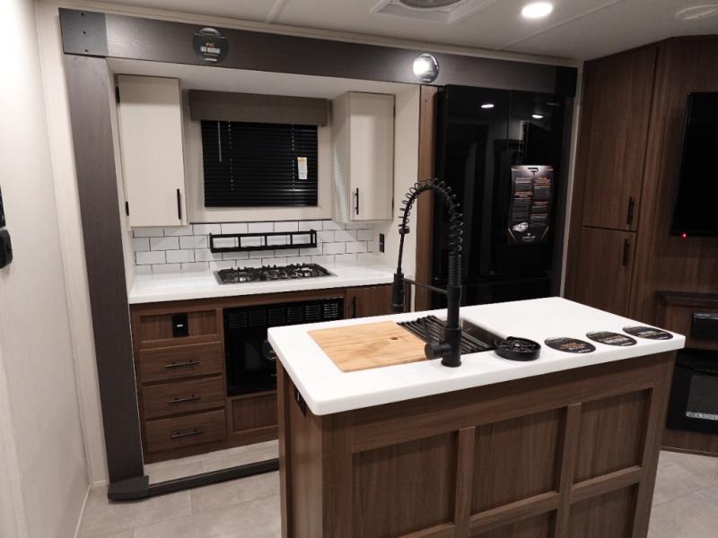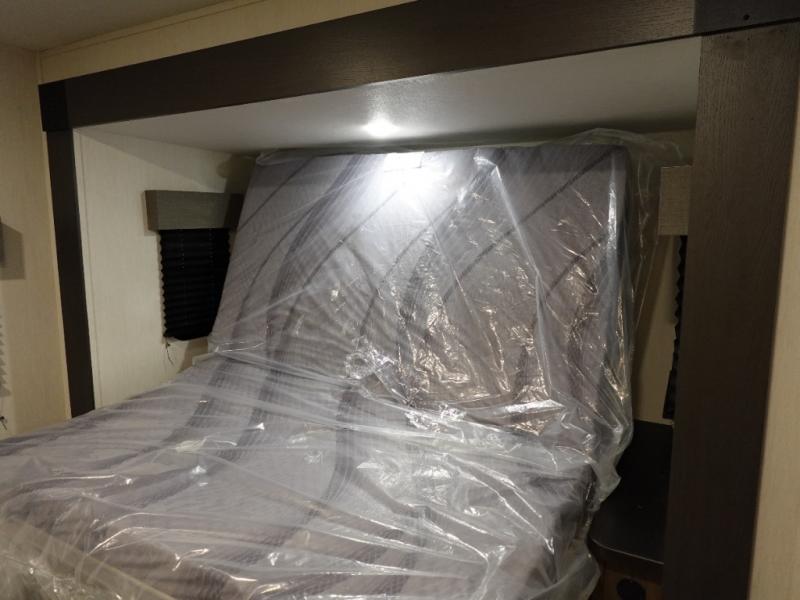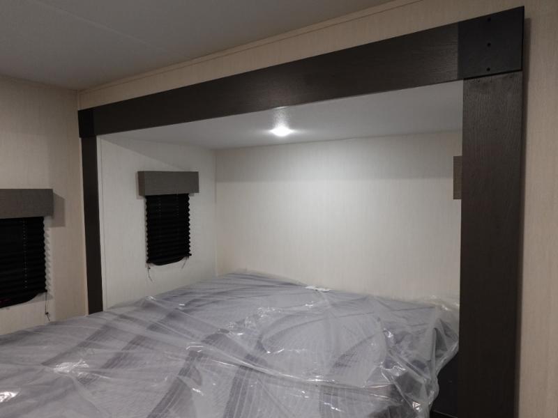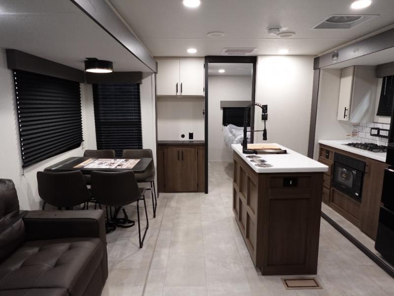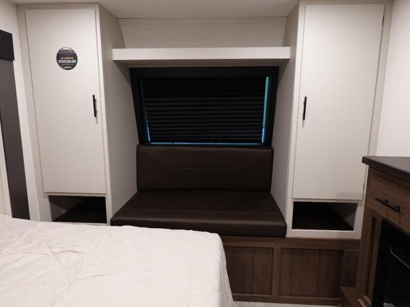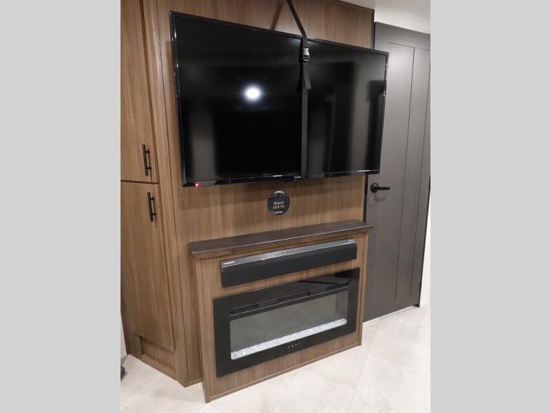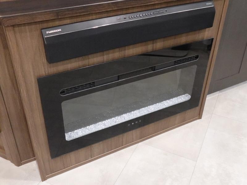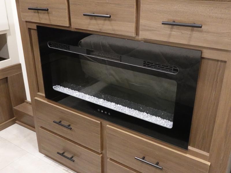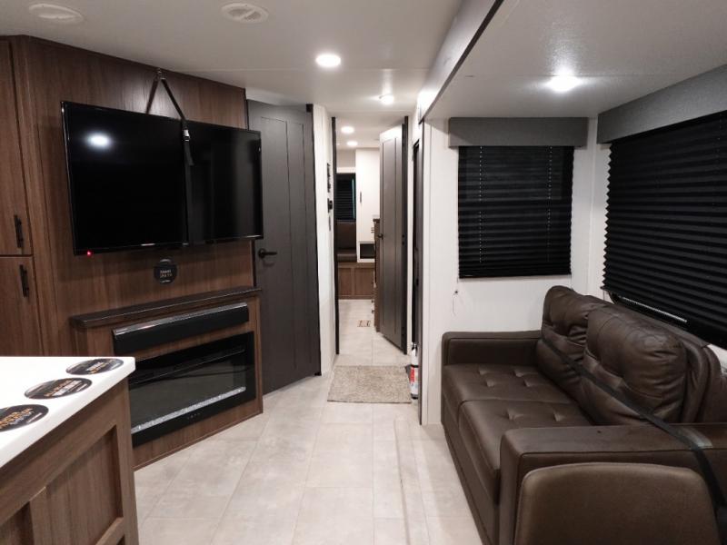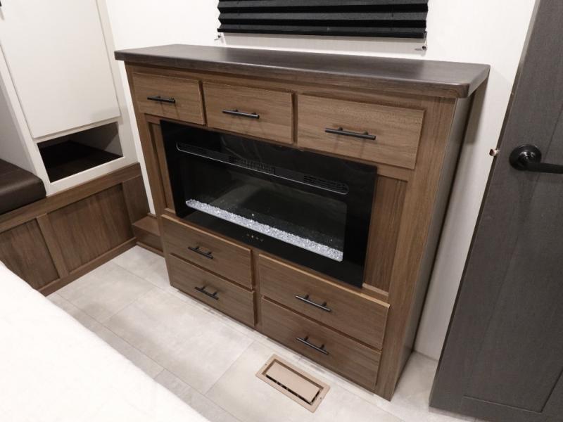 Privacy abounds in this travel trailer with a bedroom at each end! A king bed slide in the front has its own fireplace for cozy nights. Dual wardrobes frame the reading bench which looks out the front window for peaceful moments appreciating the view. At the rear, a second bedroom with queen bed has its own half bath. A pantry closet here also has prep for an optional washer/dryer for convenience on the road. In the center everyone can meet up in the spacious kitchen/living room. A hide-a-bed sofa has even more sleeping space, or relax there and watch the TV which is in the entertainment center along with another fireplace. The kitchen is well-equipped with a three-burner cooktop, microwave, and even an island where the sink is located for easy meal prep. Outside there are not one but two 10' power awnings for extra protection from the elements!