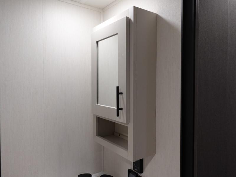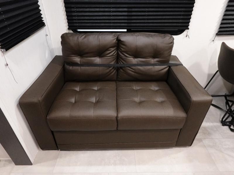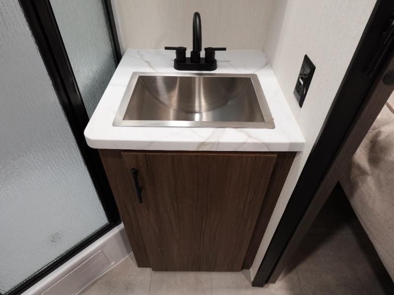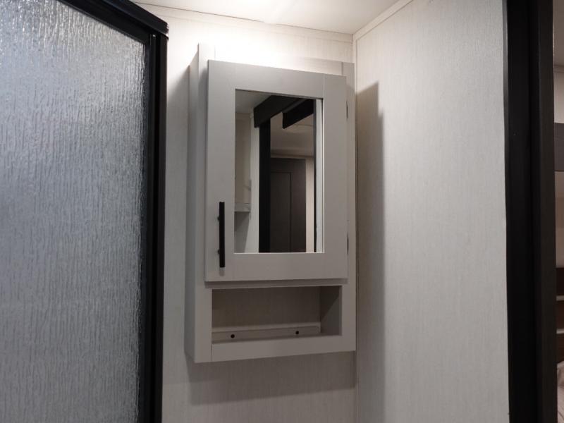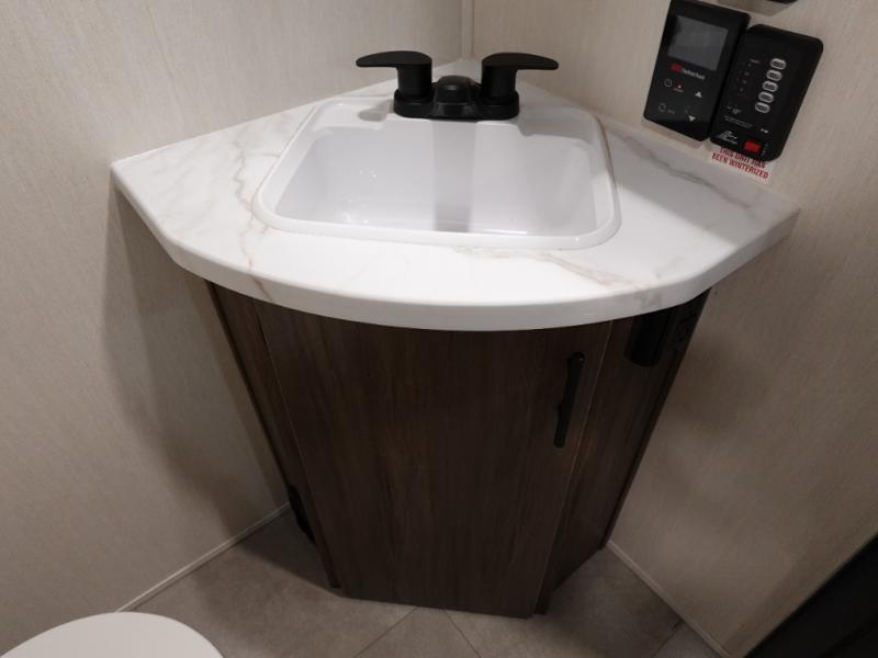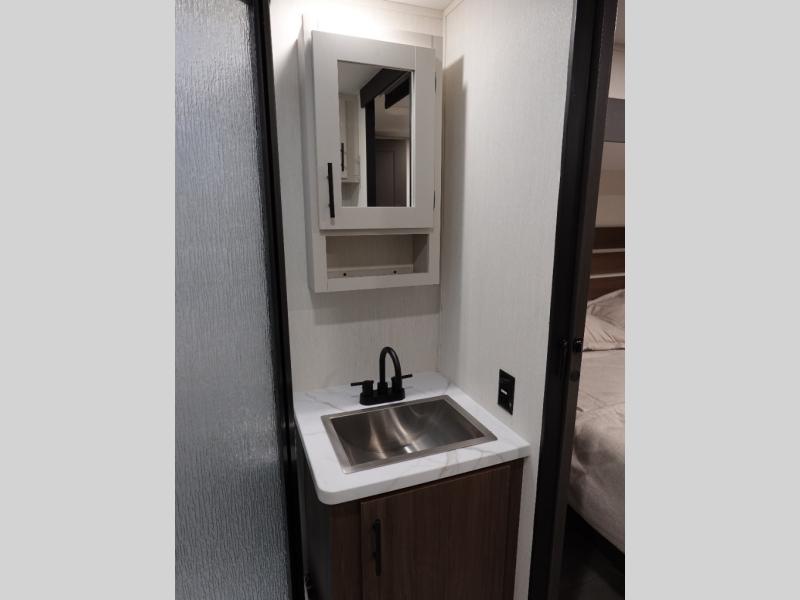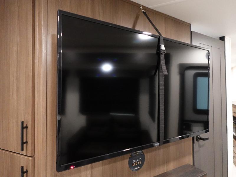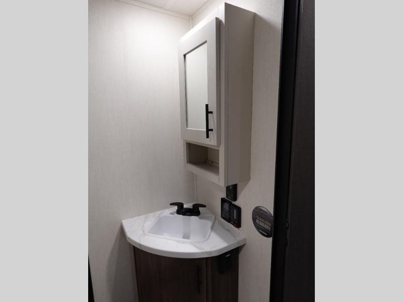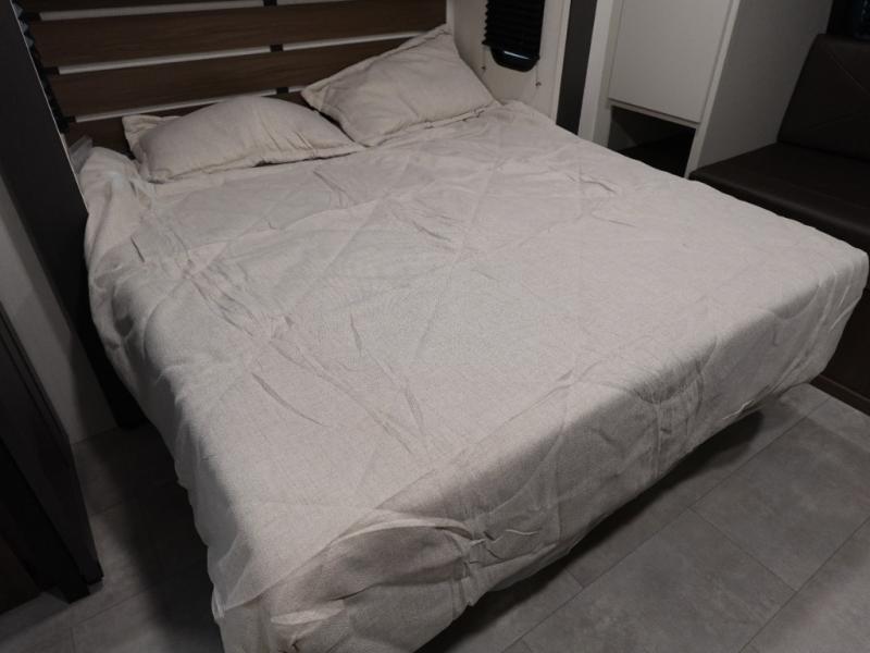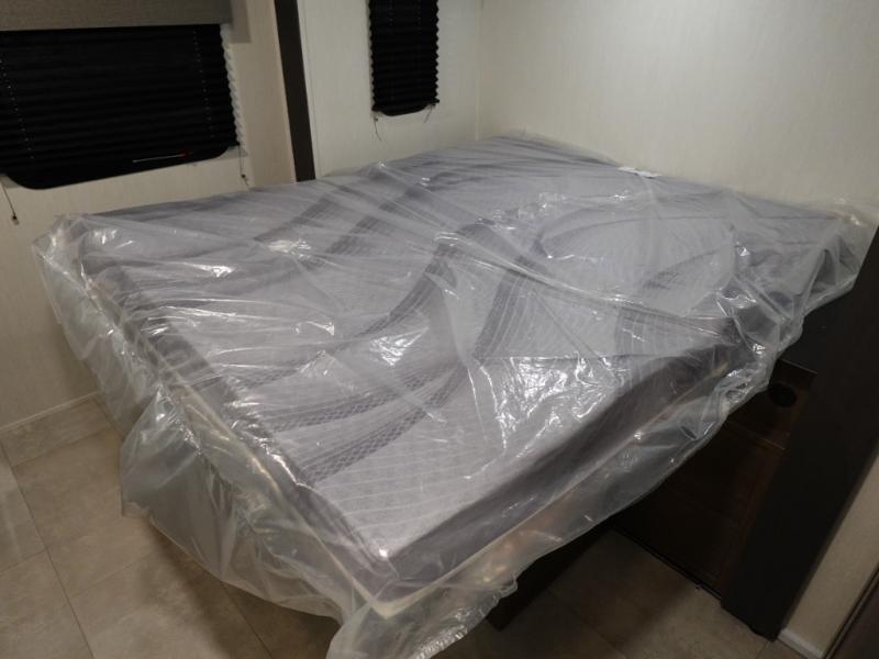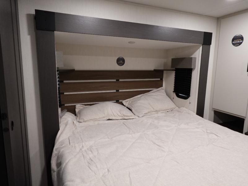 Privacy abounds in this travel trailer with a bedroom at each end! A king bed slide in the front has its own fireplace for cozy nights. Dual wardrobes frame the reading bench which looks out the front window for peaceful moments appreciating the view. At the rear, a second bedroom with queen bed has its own half bath. A pantry closet here also has prep for an optional washer/dryer for convenience on the road. In the center everyone can meet up in the spacious kitchen/living room. A hide-a-bed sofa has even more sleeping space, or relax there and watch the TV which is in the entertainment center along with another fireplace. The kitchen is well-equipped with a three-burner cooktop, microwave, and even an island where the sink is located for easy meal prep. Outside there are not one but two 10' power awnings for extra protection from the elements!