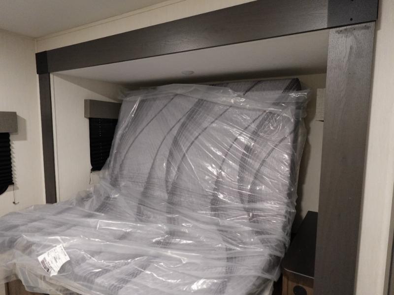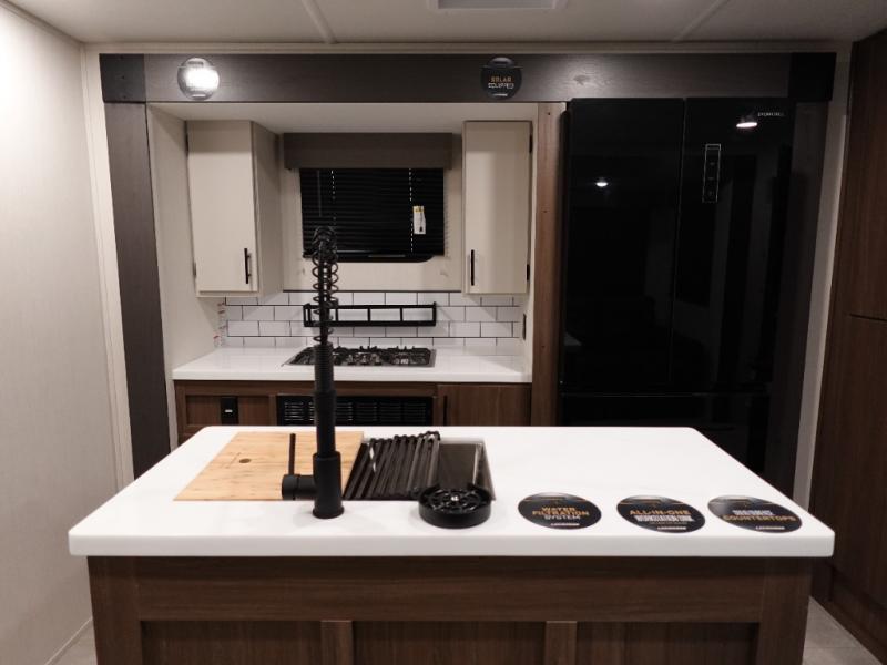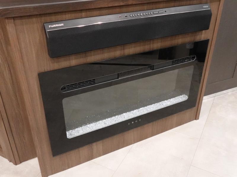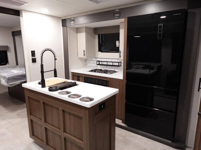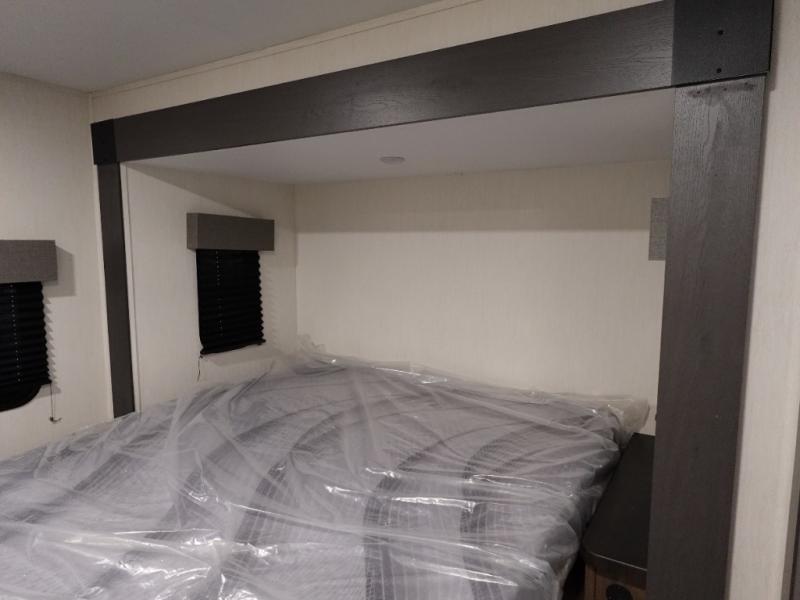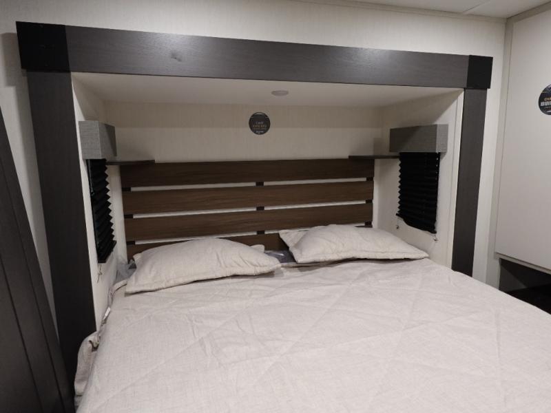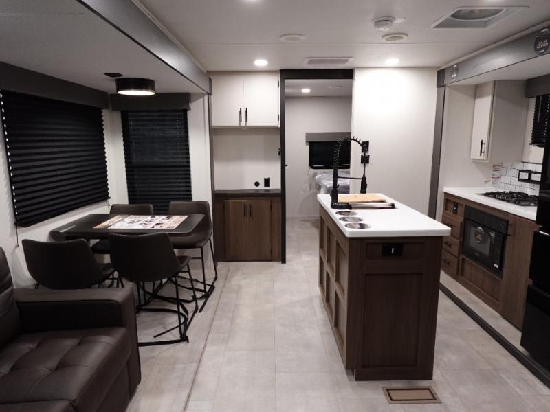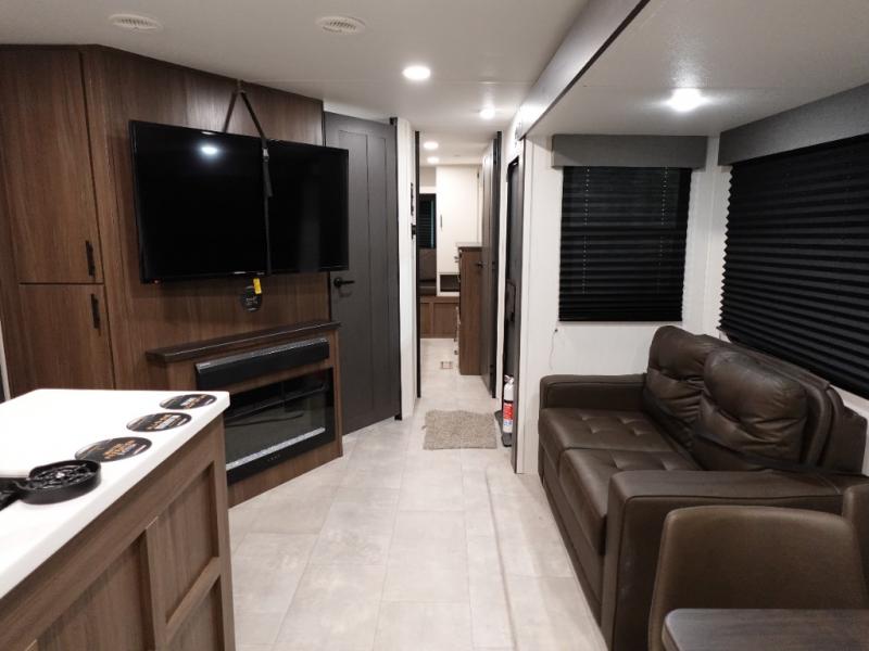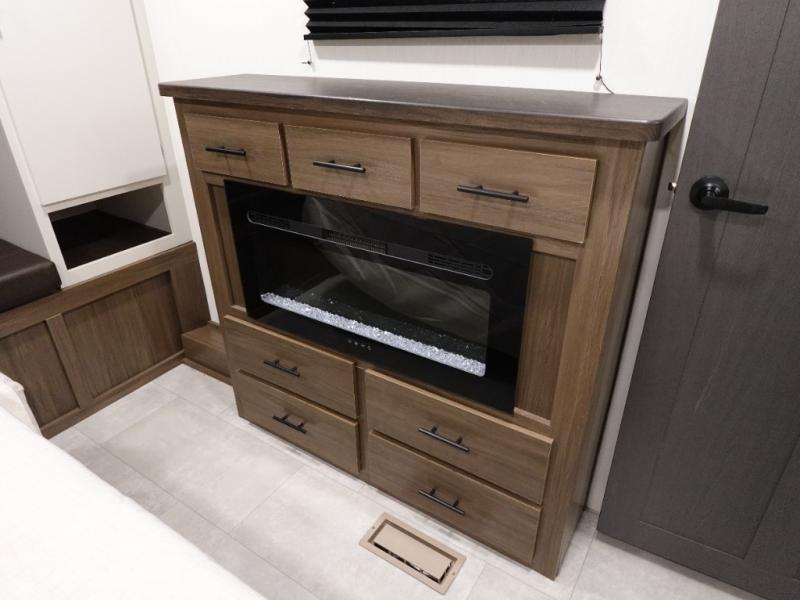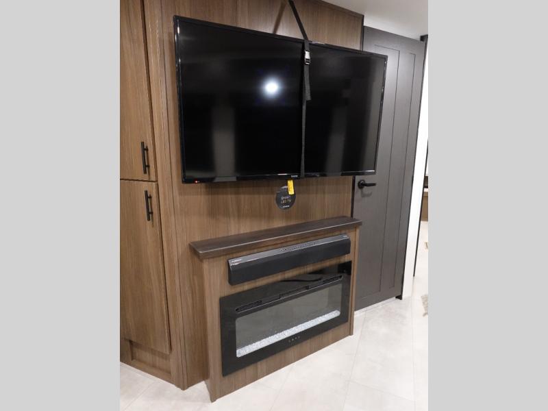 Privacy abounds in this travel trailer with a bedroom at each end! A king bed slide in the front has its own fireplace for cozy nights. Dual wardrobes frame the reading bench which looks out the front window for peaceful moments appreciating the view. At the rear, a second bedroom with queen bed has its own half bath. A pantry closet here also has prep for an optional washer/dryer for convenience on the road. In the center everyone can meet up in the spacious kitchen/living room. A hide-a-bed sofa has even more sleeping space, or relax there and watch the TV which is in the entertainment center along with another fireplace. The kitchen is well-equipped with a three-burner cooktop, microwave, and even an island where the sink is located for easy meal prep. Outside there are not one but two 10' power awnings for extra protection from the elements!