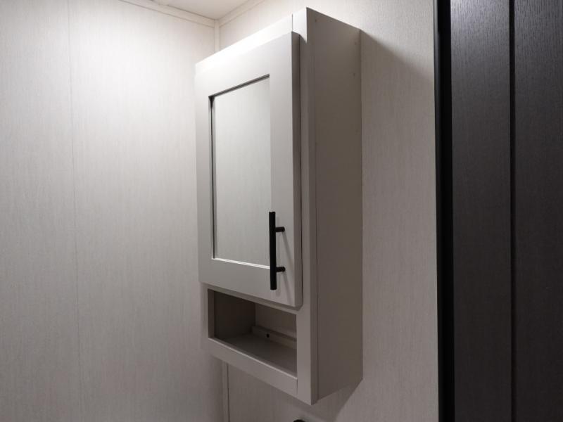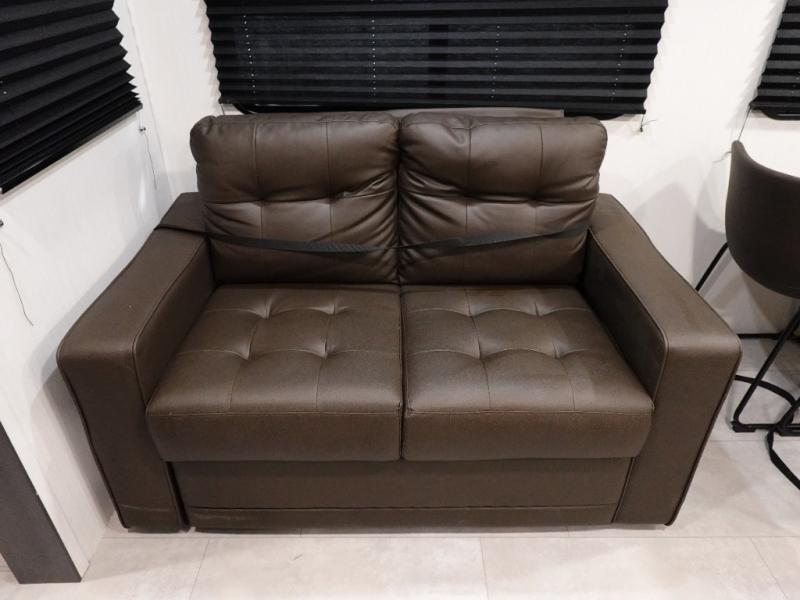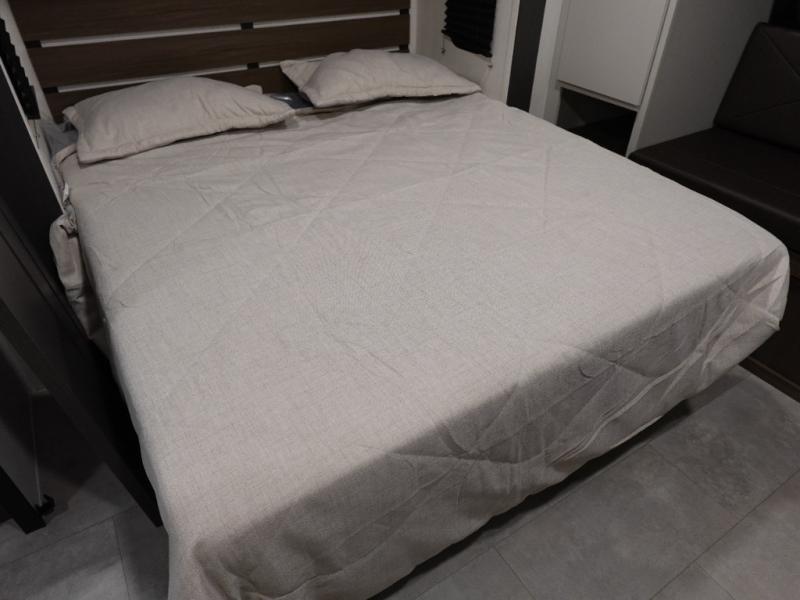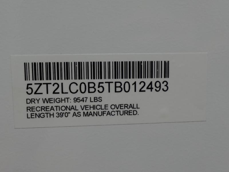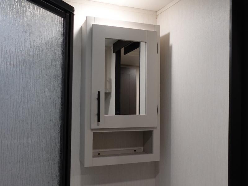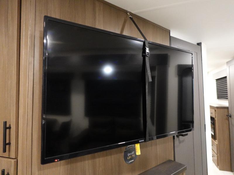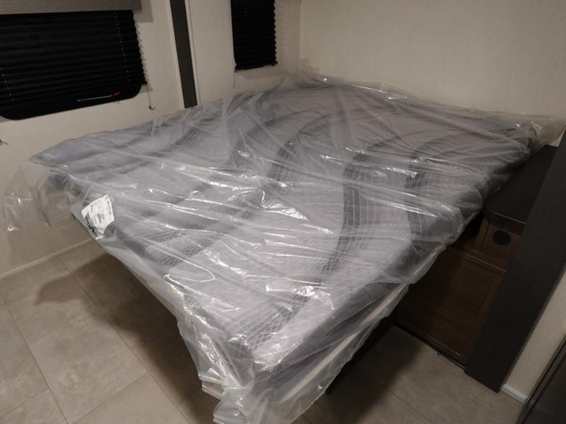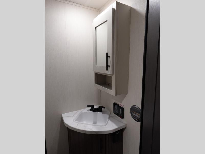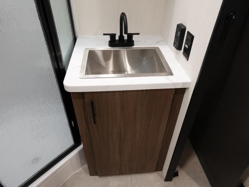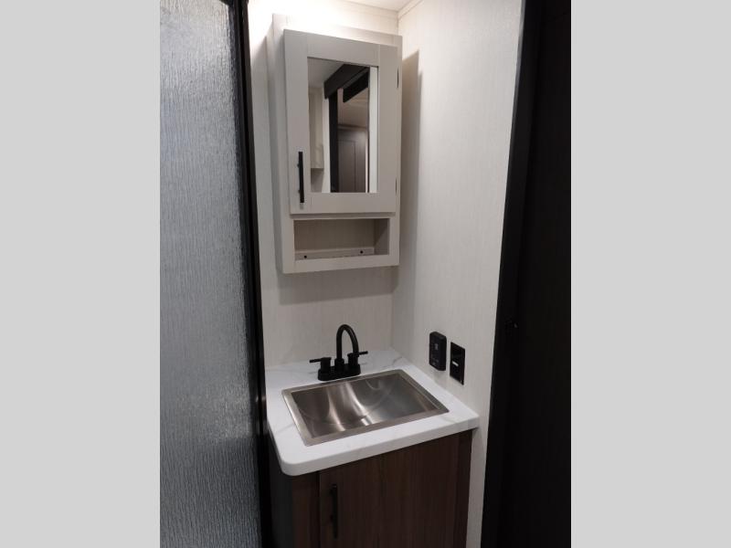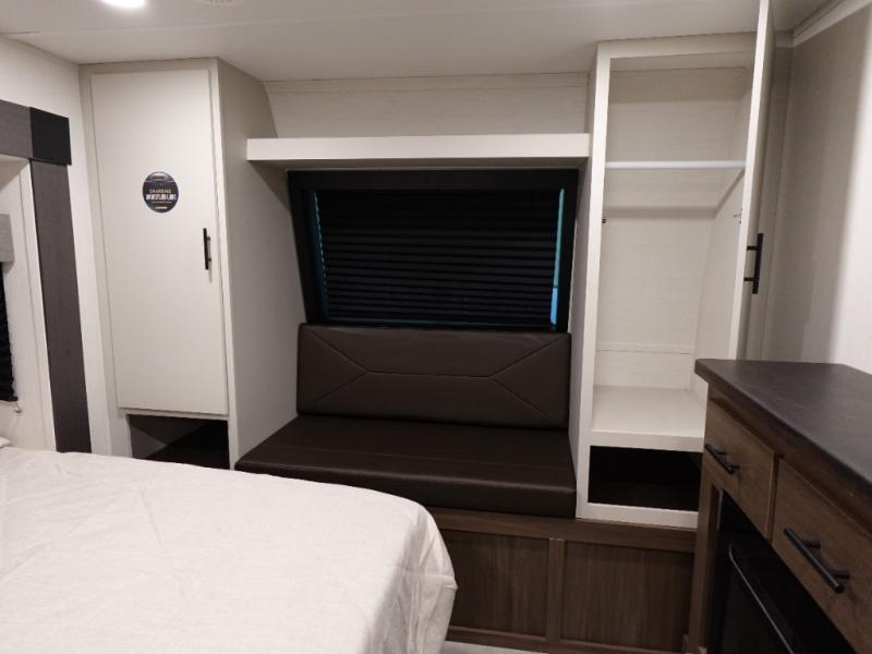 Privacy abounds in this travel trailer with a bedroom at each end! A king bed slide in the front has its own fireplace for cozy nights. Dual wardrobes frame the reading bench which looks out the front window for peaceful moments appreciating the view. At the rear, a second bedroom with queen bed has its own half bath. A pantry closet here also has prep for an optional washer/dryer for convenience on the road. In the center everyone can meet up in the spacious kitchen/living room. A hide-a-bed sofa has even more sleeping space, or relax there and watch the TV which is in the entertainment center along with another fireplace. The kitchen is well-equipped with a three-burner cooktop, microwave, and even an island where the sink is located for easy meal prep. Outside there are not one but two 10' power awnings for extra protection from the elements!