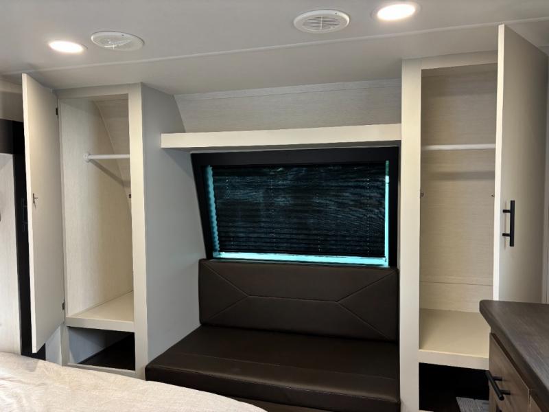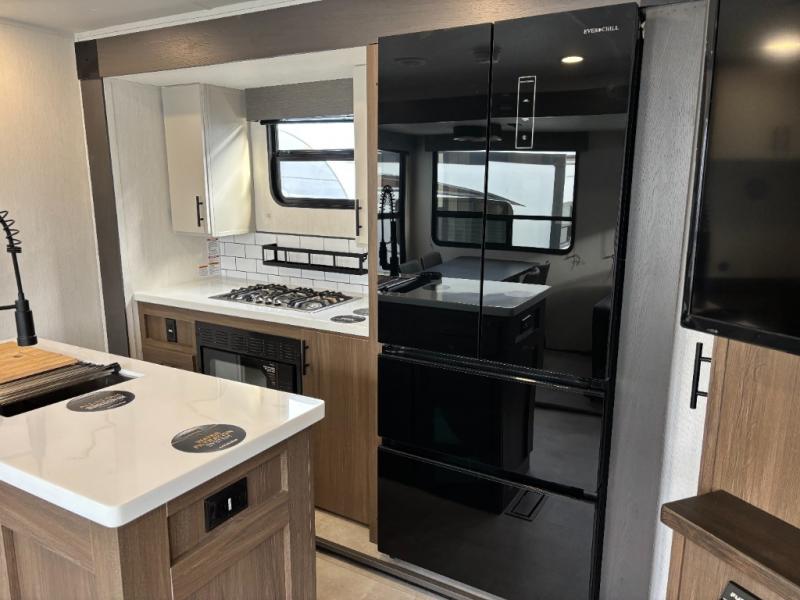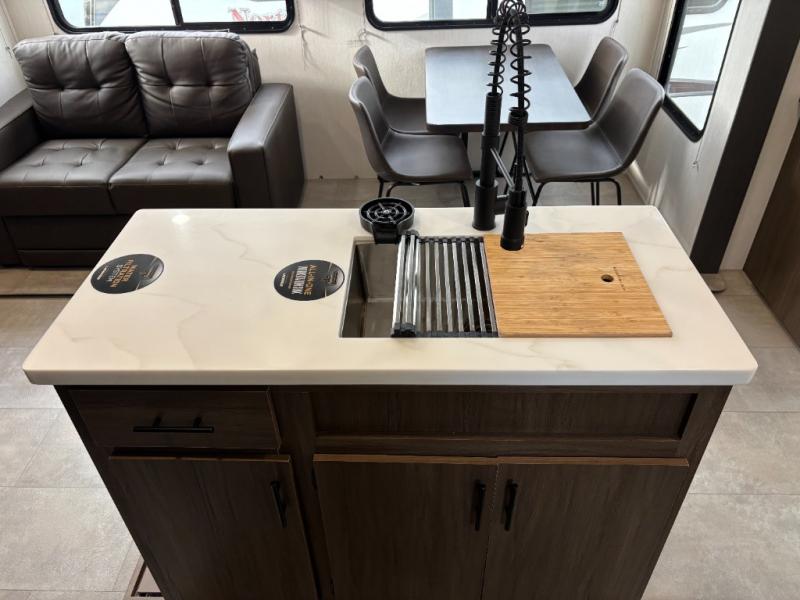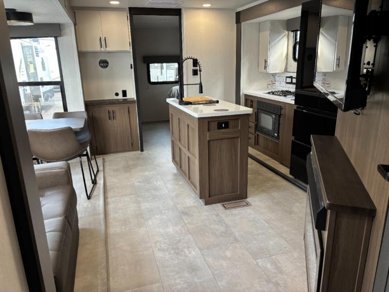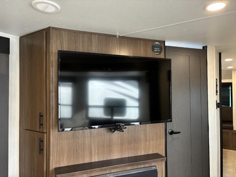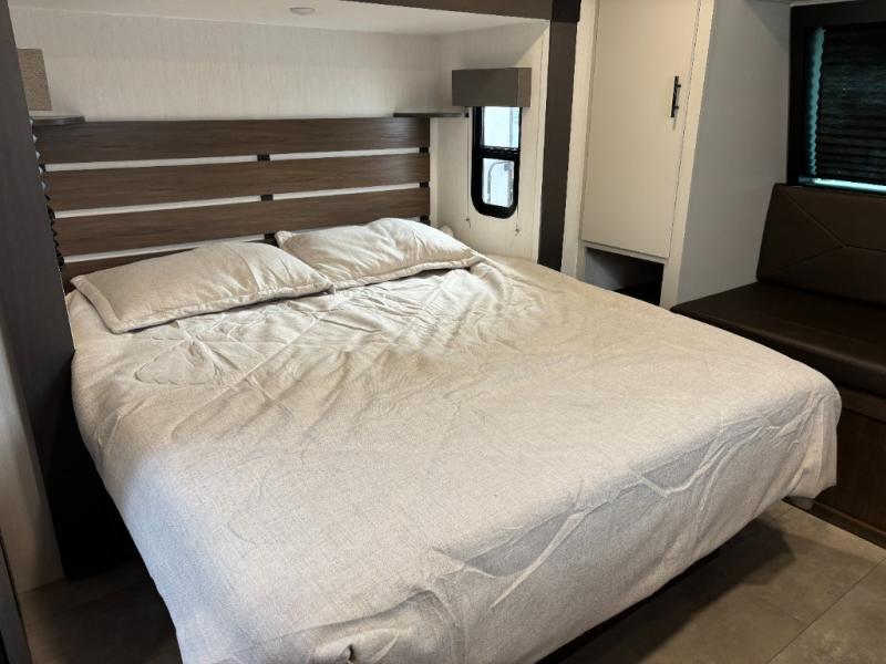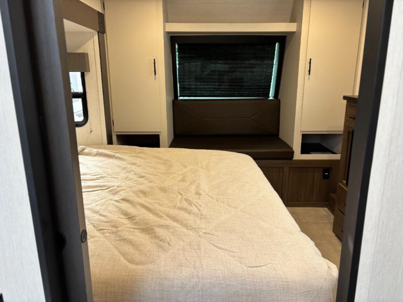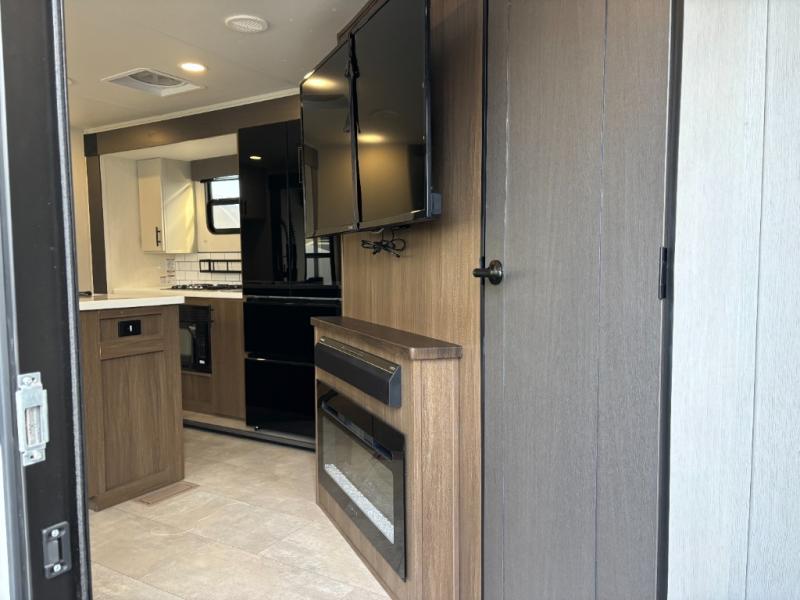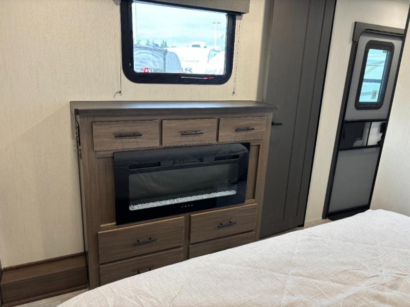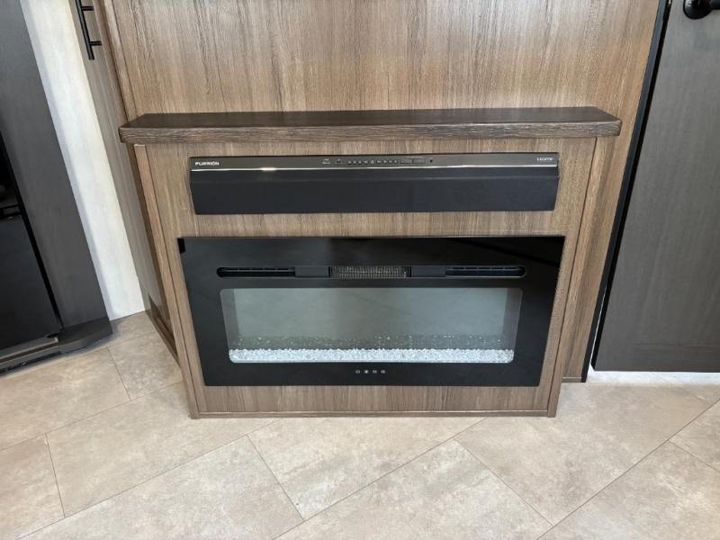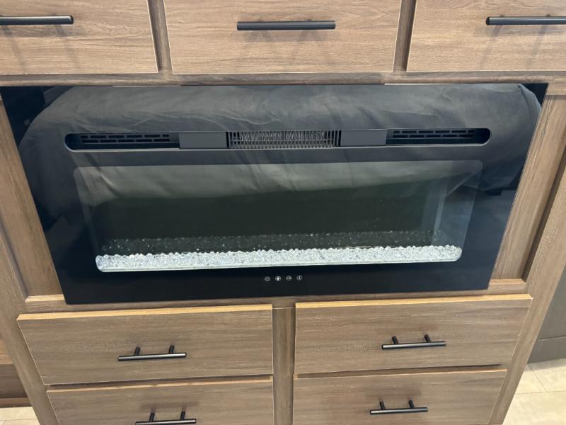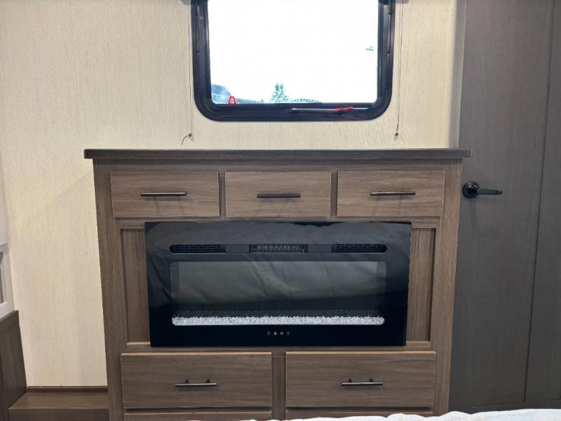Privacy abounds in this travel trailer with a bedroom at each end! A king bed slide in the front has its own fireplace for cozy nights. Dual wardrobes frame the reading bench which looks out the front window for peaceful moments appreciating the view. At the rear, a second bedroom with queen bed has its own half bath. A pantry closet here also has prep for an optional washer/dryer for convenience on the road. In the center everyone can meet up in the spacious kitchen/living room. A hide-a-bed sofa has even more sleeping space, or relax there and watch the TV which is in the entertainment center along with another fireplace. The kitchen is well-equipped with a three-burner cooktop, microwave, and even an island where the sink is located for easy meal prep. Outside there are not one but two 10' power awnings for extra protection from the elements!