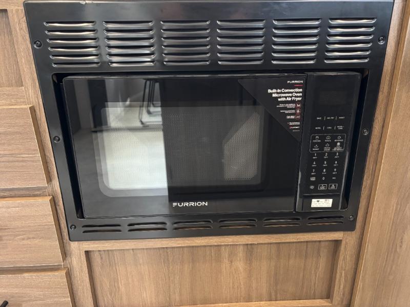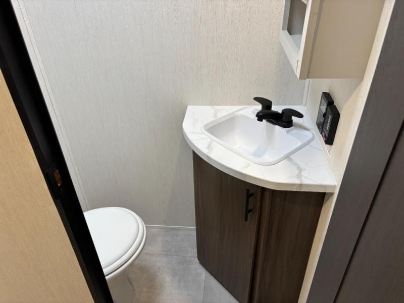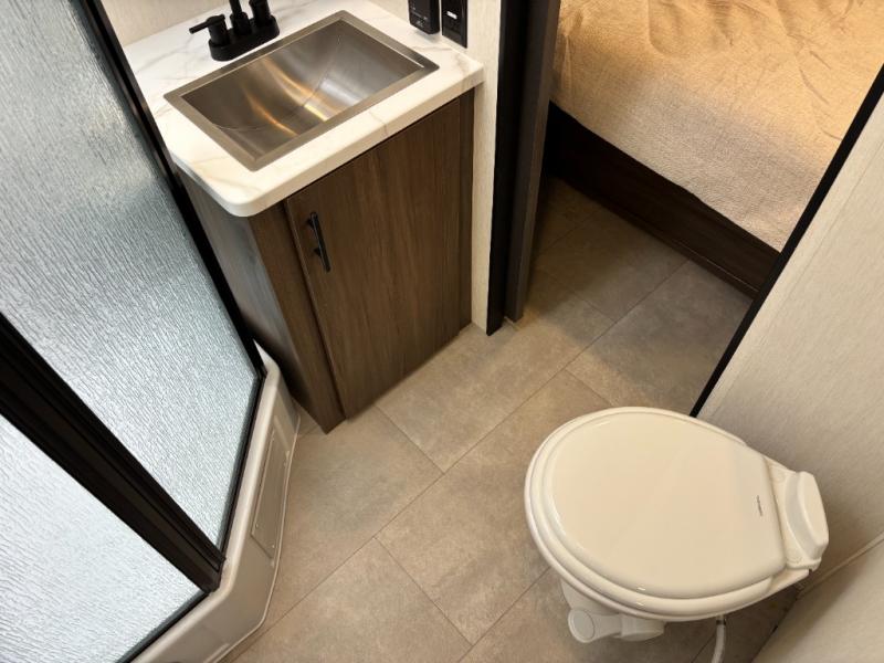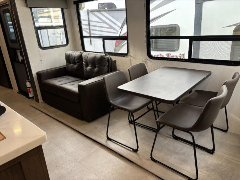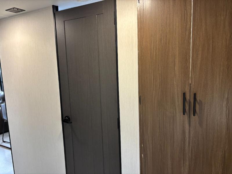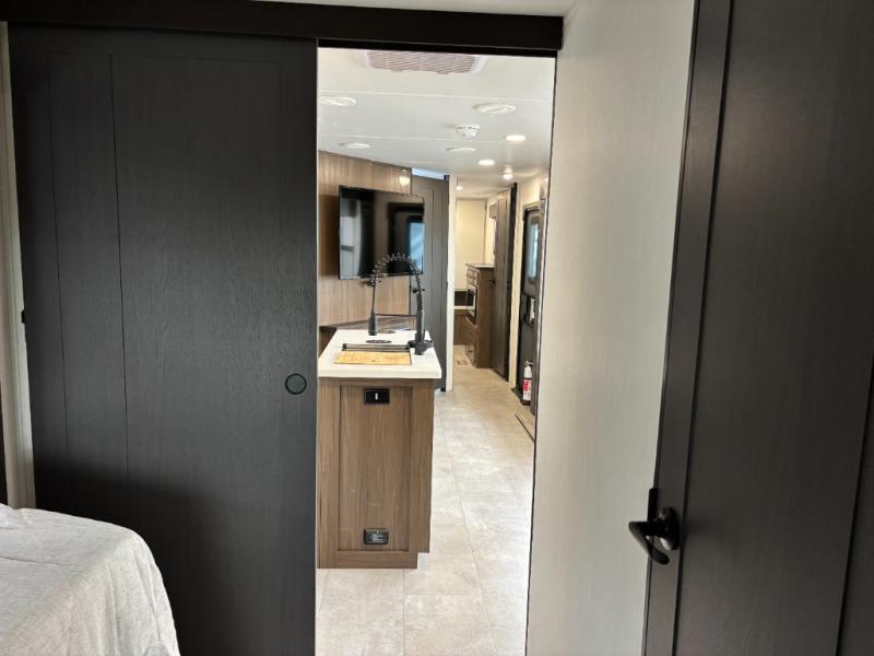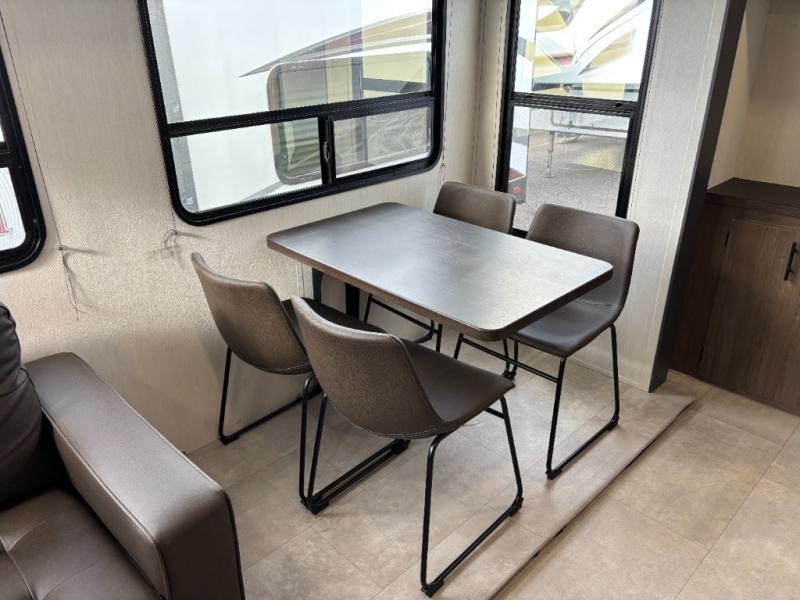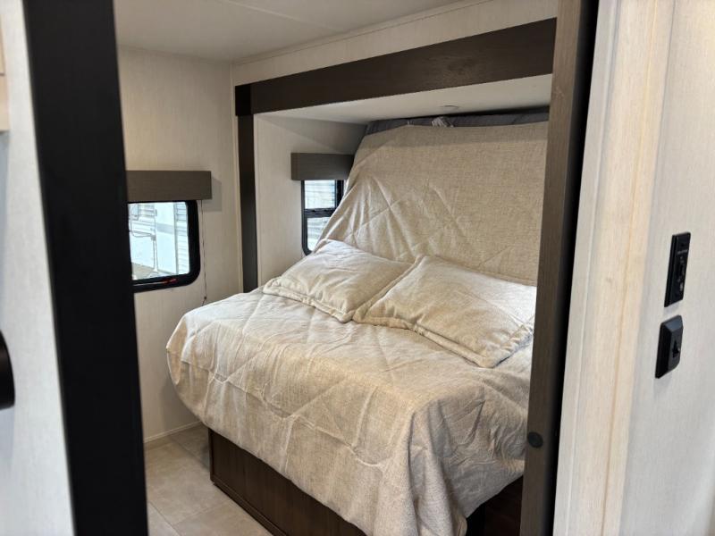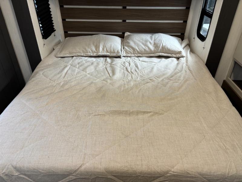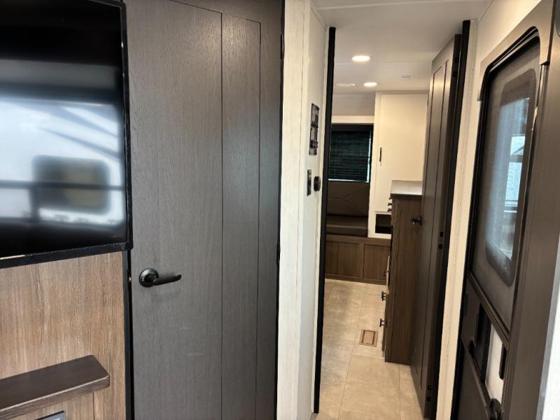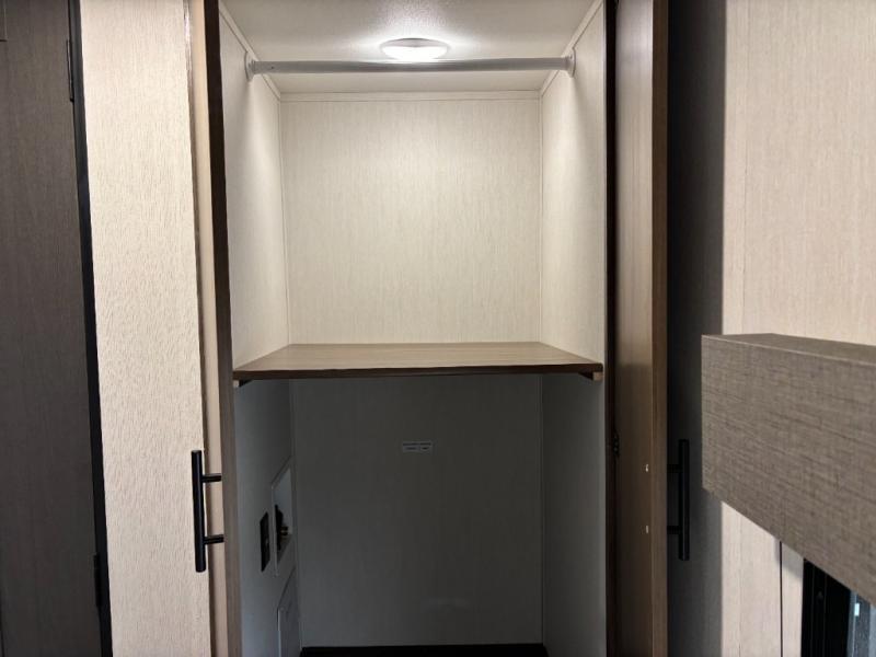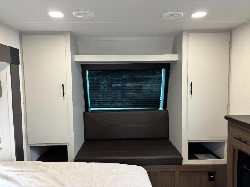 Privacy abounds in this travel trailer with a bedroom at each end! A king bed slide in the front has its own fireplace for cozy nights. Dual wardrobes frame the reading bench which looks out the front window for peaceful moments appreciating the view. At the rear, a second bedroom with queen bed has its own half bath. A pantry closet here also has prep for an optional washer/dryer for convenience on the road. In the center everyone can meet up in the spacious kitchen/living room. A hide-a-bed sofa has even more sleeping space, or relax there and watch the TV which is in the entertainment center along with another fireplace. The kitchen is well-equipped with a three-burner cooktop, microwave, and even an island where the sink is located for easy meal prep. Outside there are not one but two 10' power awnings for extra protection from the elements!