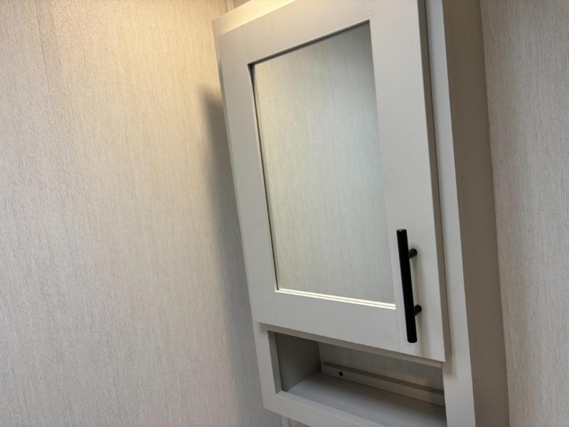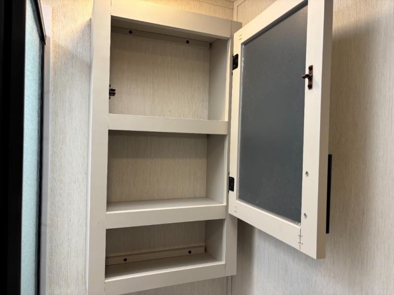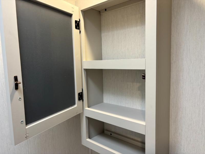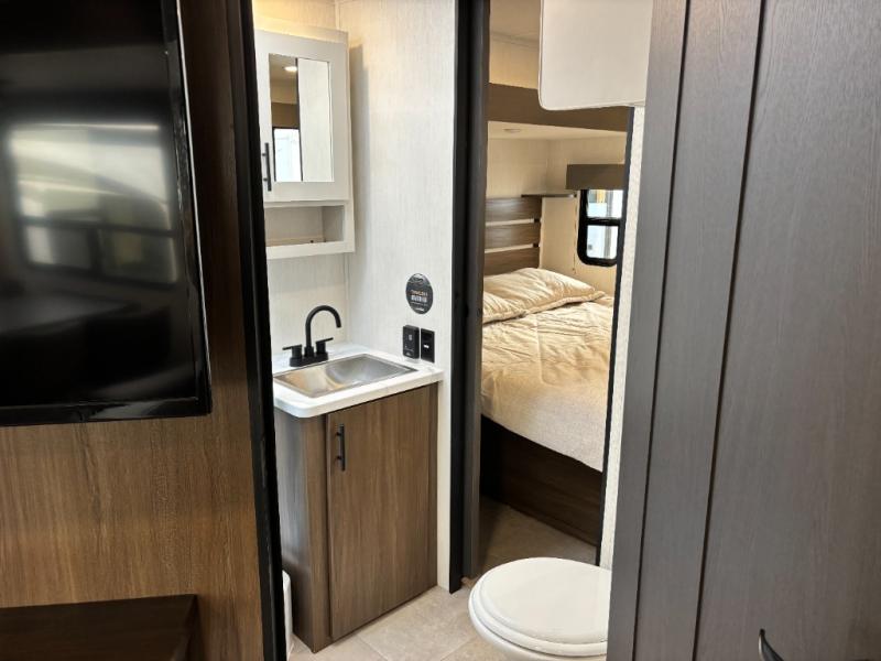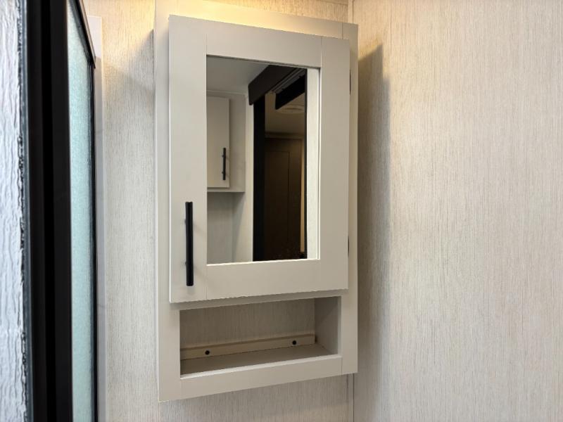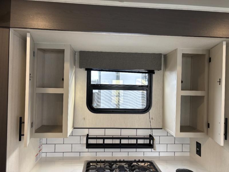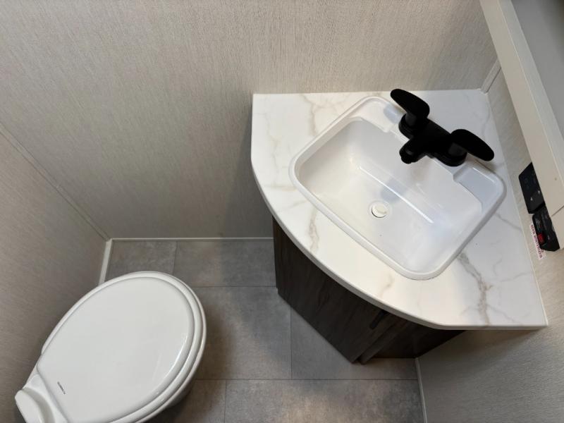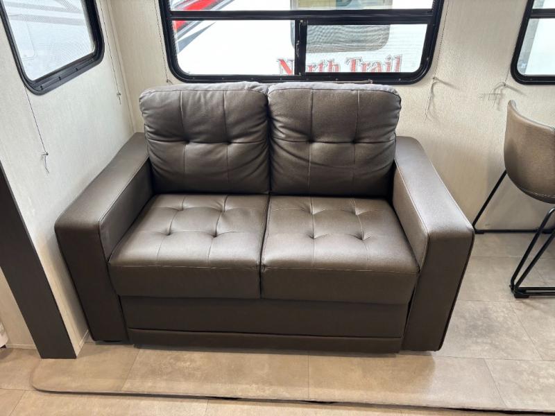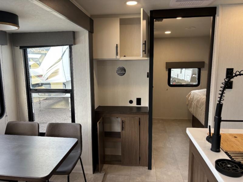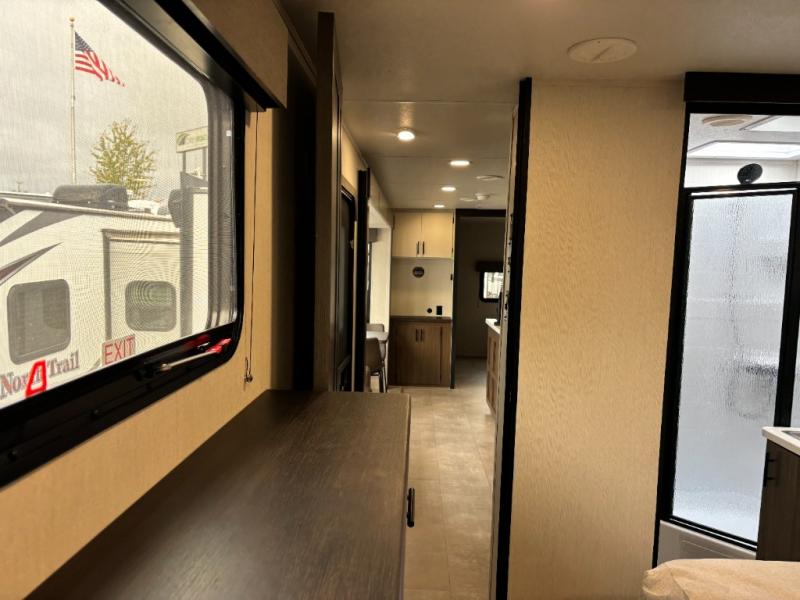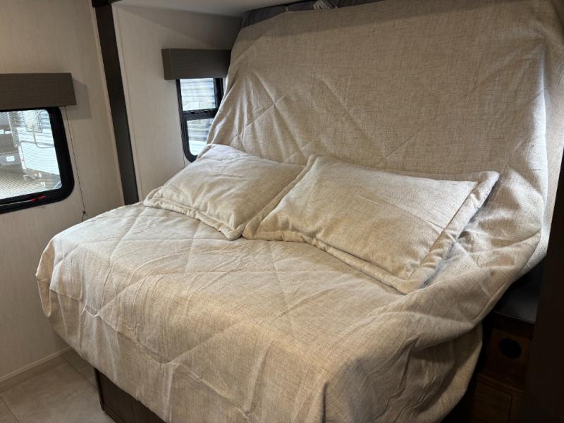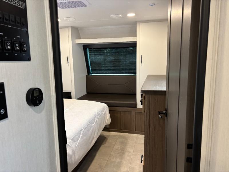 Privacy abounds in this travel trailer with a bedroom at each end! A king bed slide in the front has its own fireplace for cozy nights. Dual wardrobes frame the reading bench which looks out the front window for peaceful moments appreciating the view. At the rear, a second bedroom with queen bed has its own half bath. A pantry closet here also has prep for an optional washer/dryer for convenience on the road. In the center everyone can meet up in the spacious kitchen/living room. A hide-a-bed sofa has even more sleeping space, or relax there and watch the TV which is in the entertainment center along with another fireplace. The kitchen is well-equipped with a three-burner cooktop, microwave, and even an island where the sink is located for easy meal prep. Outside there are not one but two 10' power awnings for extra protection from the elements!