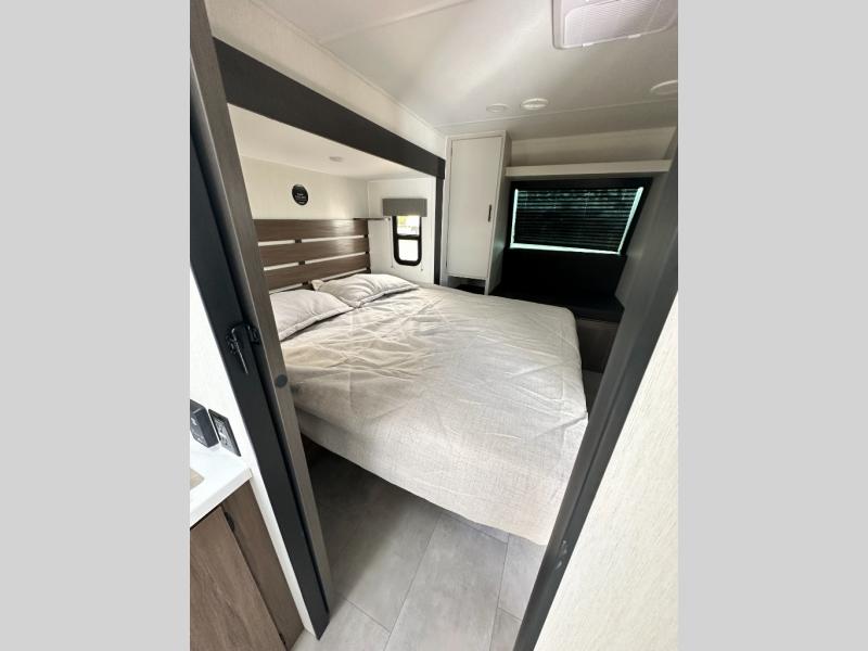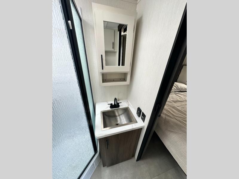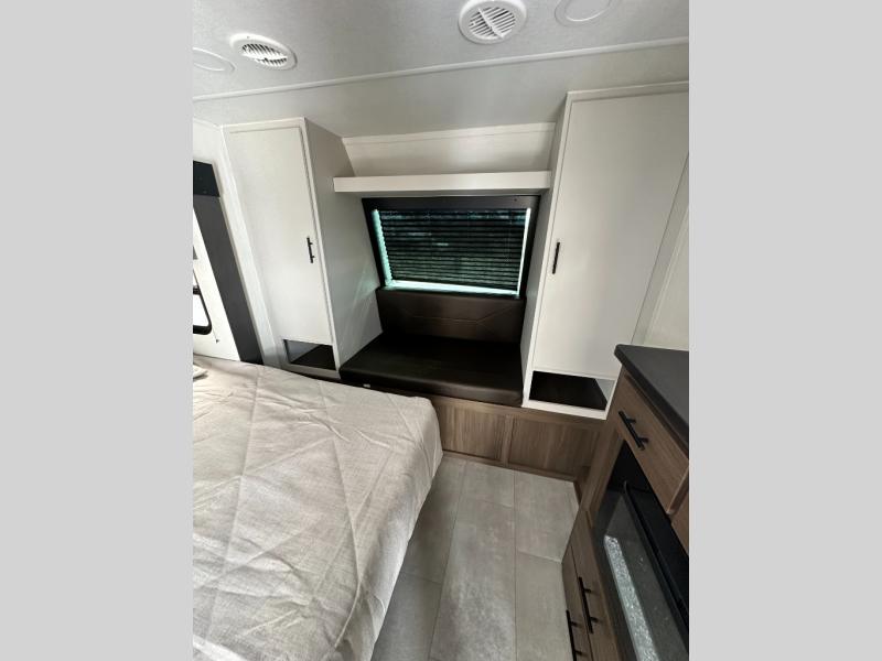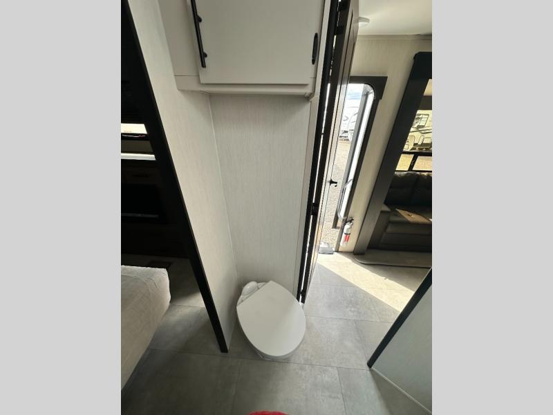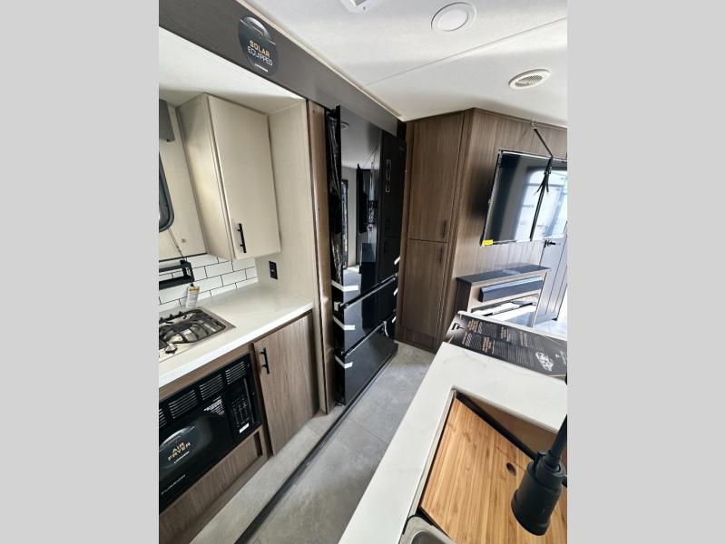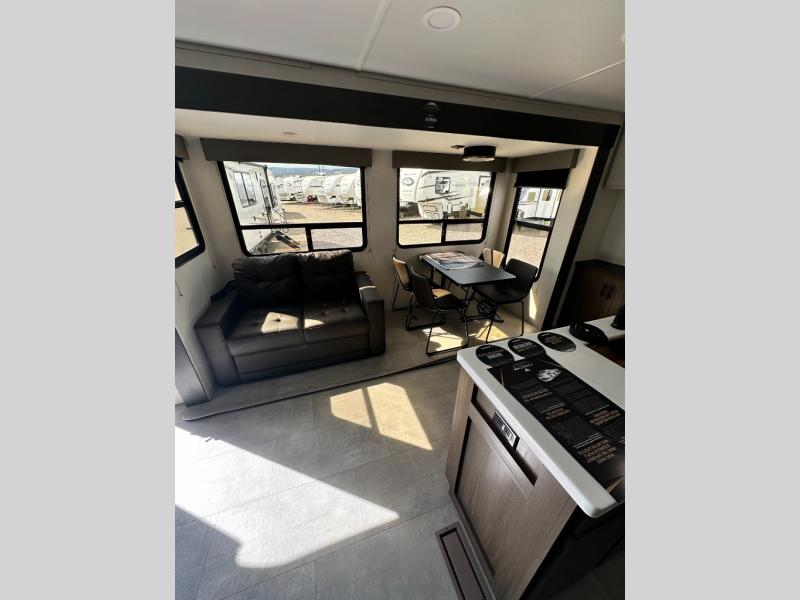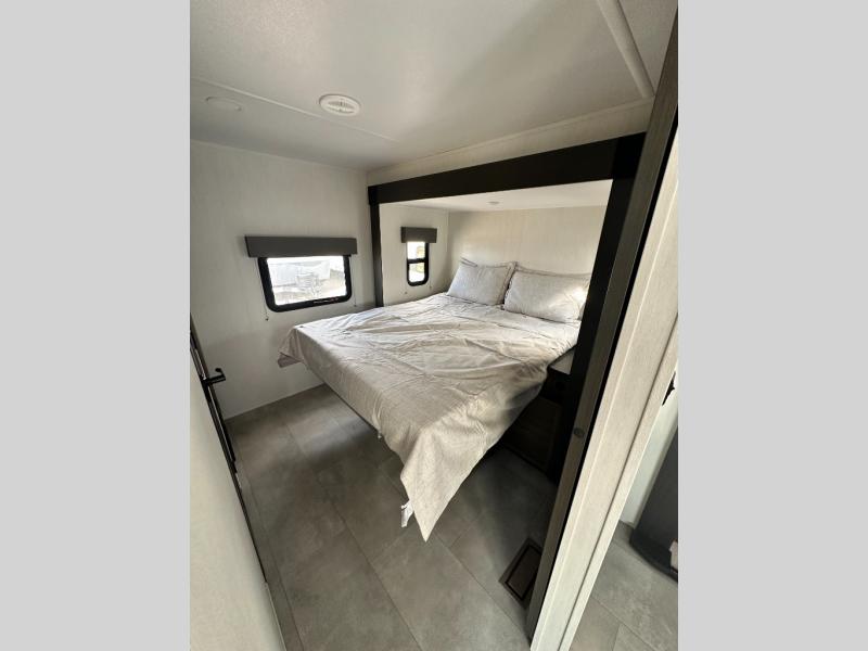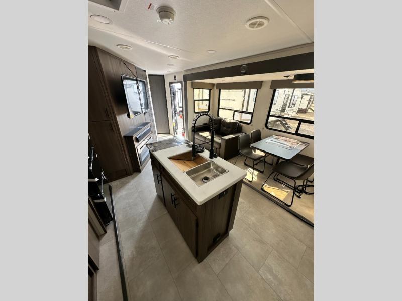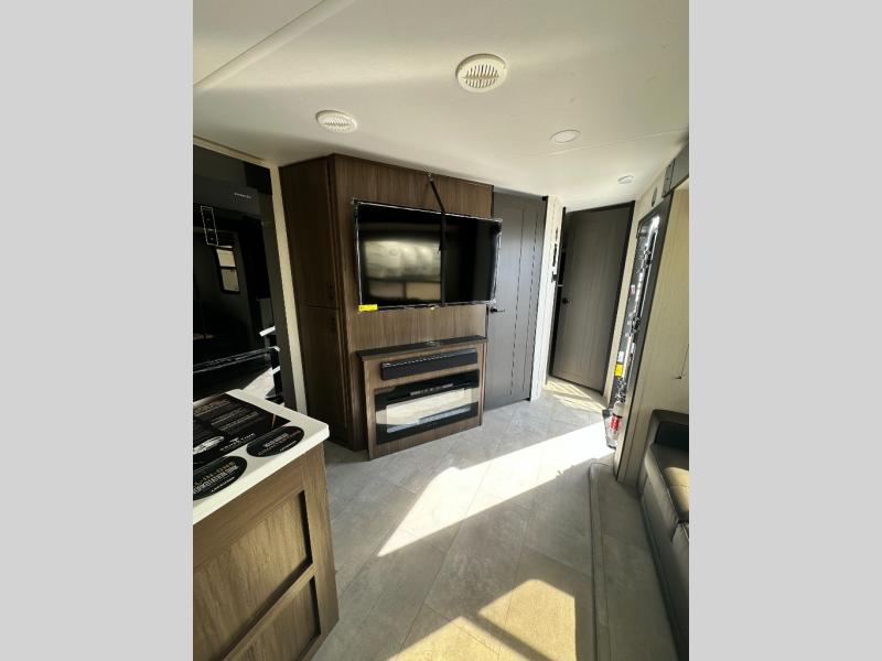 Privacy abounds in this travel trailer with a bedroom at each end! A king bed slide in the front has its own fireplace for cozy nights. Dual wardrobes frame the reading bench which looks out the front window for peaceful moments appreciating the view. At the rear, a second bedroom with queen bed has its own half bath. A pantry closet here also has prep for an optional washer/dryer for convenience on the road. In the center everyone can meet up in the spacious kitchen/living room. A hide-a-bed sofa has even more sleeping space, or relax there and watch the TV which is in the entertainment center along with another fireplace. The kitchen is well-equipped with a three-burner cooktop, microwave, and even an island where the sink is located for easy meal prep. Outside there are not one but two 10' power awnings for extra protection from the elements!