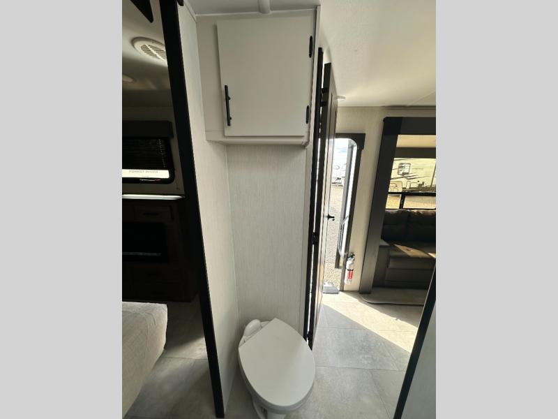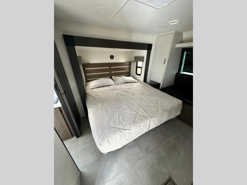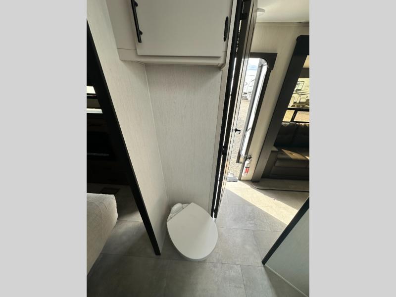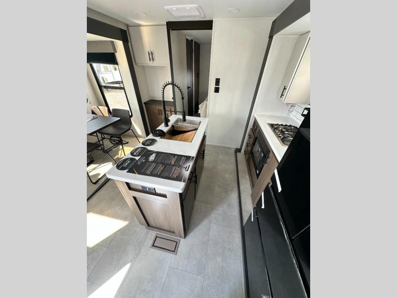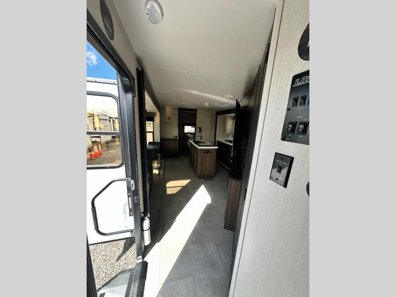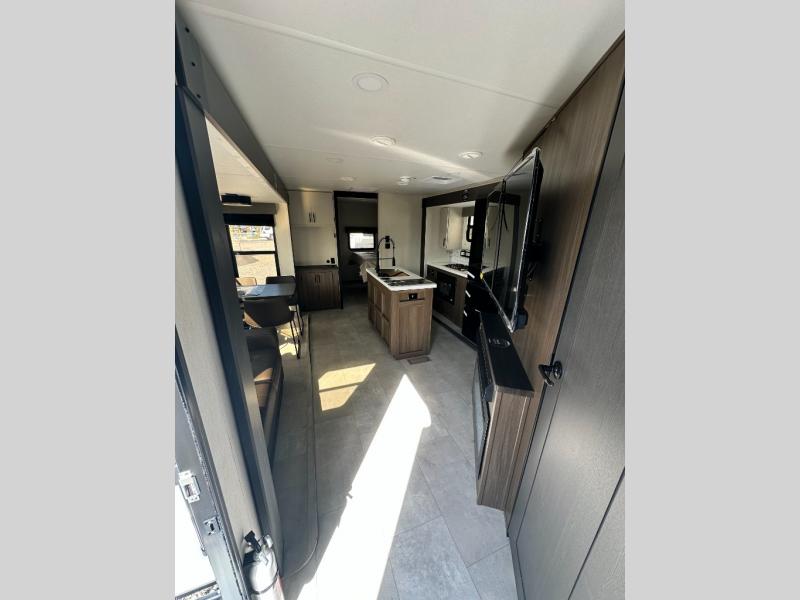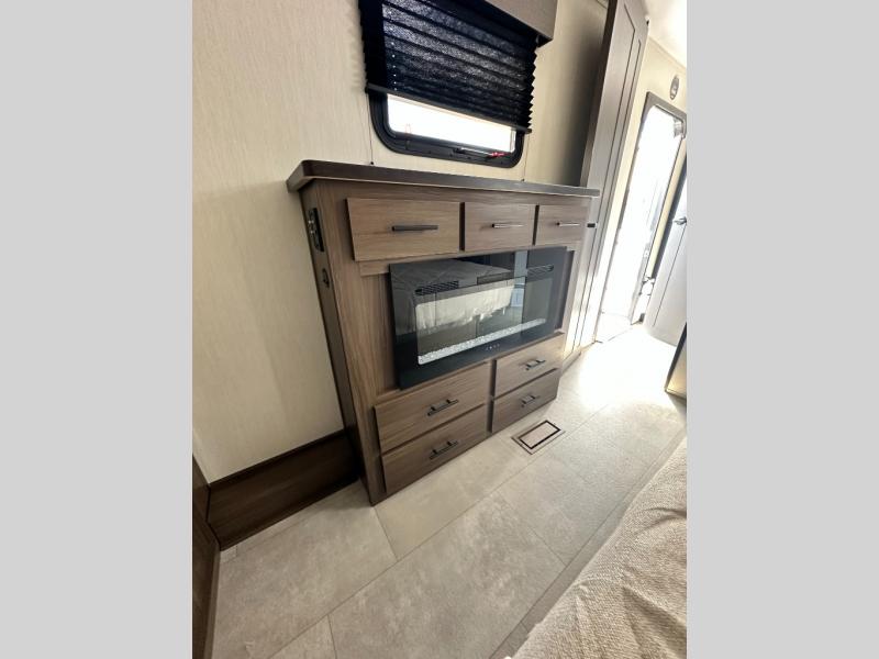 Privacy abounds in this travel trailer with a bedroom at each end! A king bed slide in the front has its own fireplace for cozy nights. Dual wardrobes frame the reading bench which looks out the front window for peaceful moments appreciating the view. At the rear, a second bedroom with queen bed has its own half bath. A pantry closet here also has prep for an optional washer/dryer for convenience on the road. In the center everyone can meet up in the spacious kitchen/living room. A hide-a-bed sofa has even more sleeping space, or relax there and watch the TV which is in the entertainment center along with another fireplace. The kitchen is well-equipped with a three-burner cooktop, microwave, and even an island where the sink is located for easy meal prep. Outside there are not one but two 10' power awnings for extra protection from the elements!