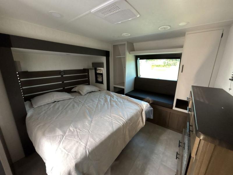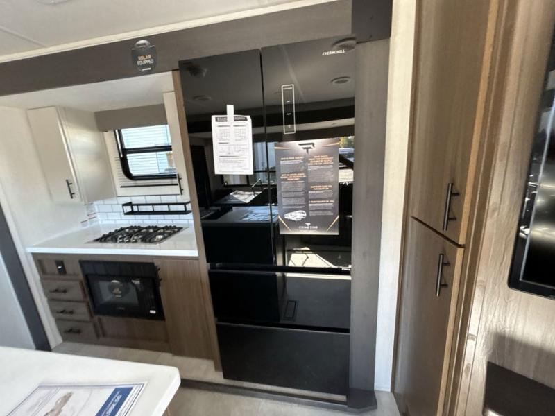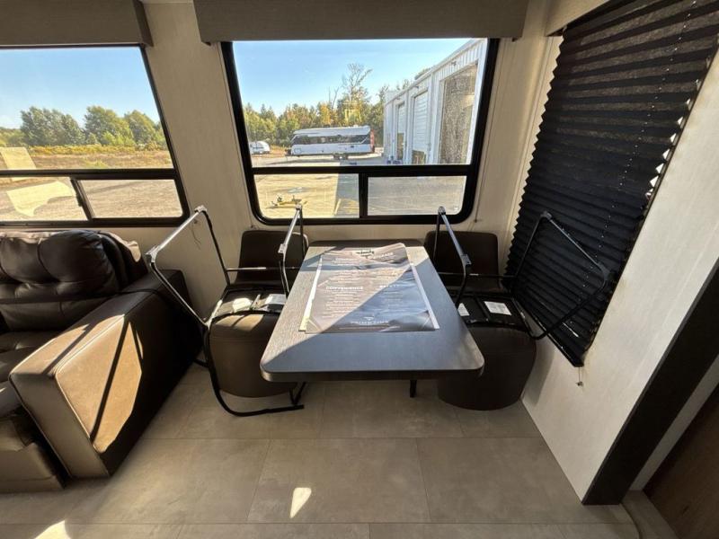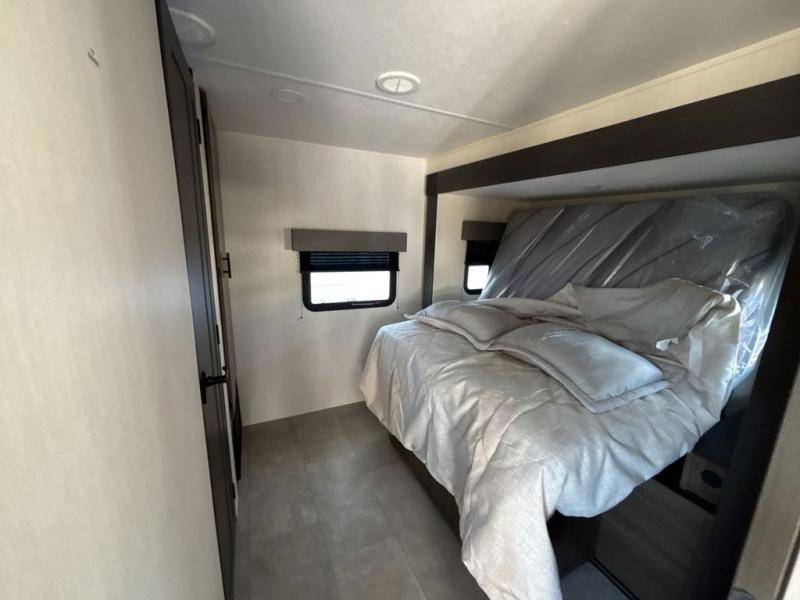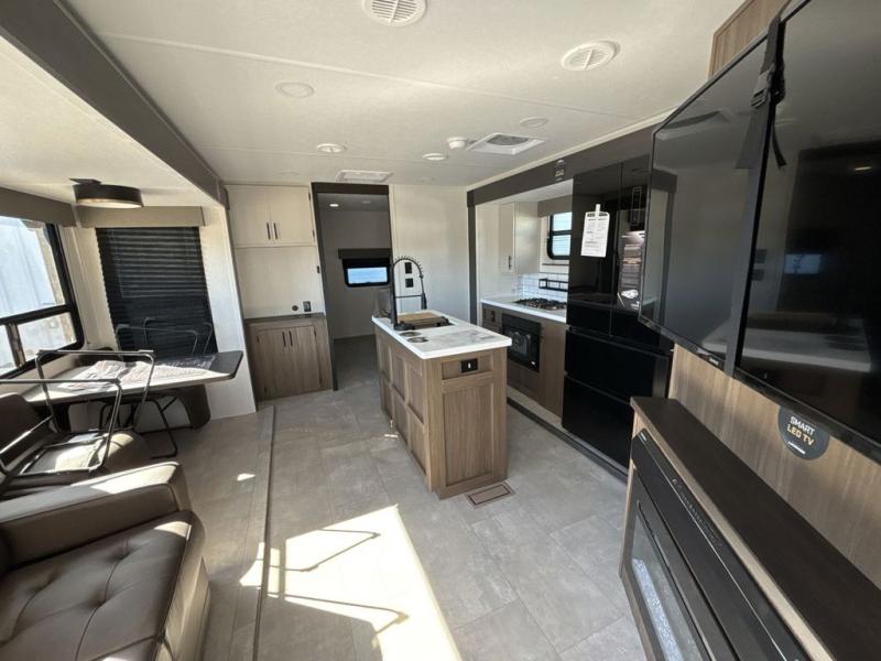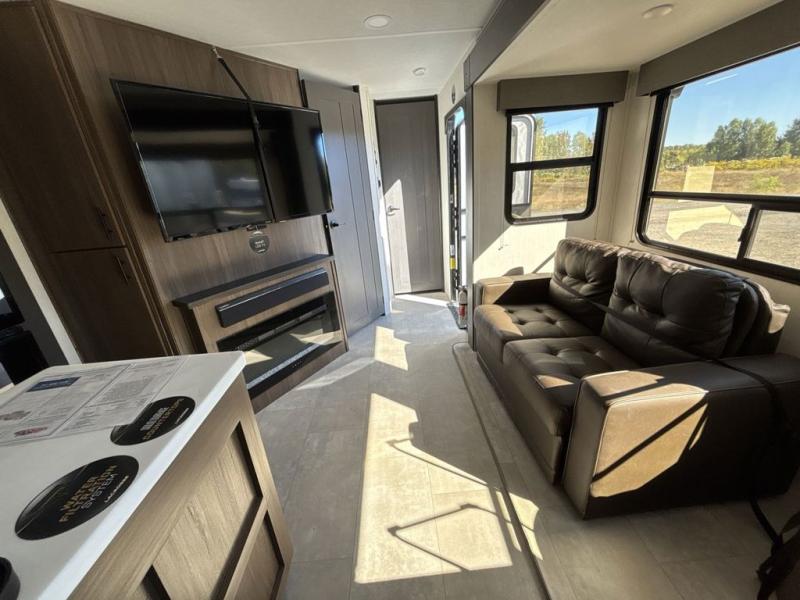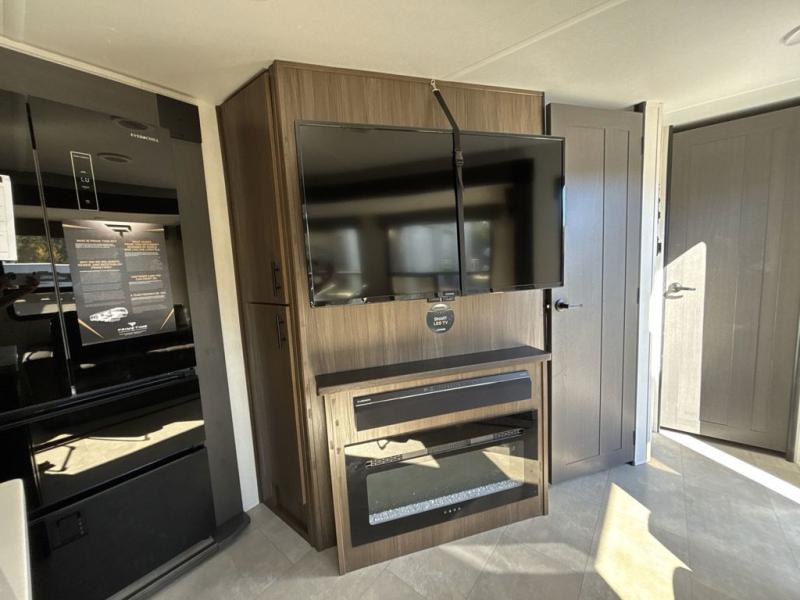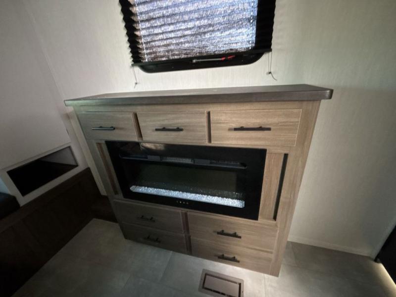 Privacy abounds in this travel trailer with a bedroom at each end! A king bed slide in the front has its own fireplace for cozy nights. Dual wardrobes frame the reading bench which looks out the front window for peaceful moments appreciating the view. At the rear, a second bedroom with queen bed has its own half bath. A pantry closet here also has prep for an optional washer/dryer for convenience on the road. In the center everyone can meet up in the spacious kitchen/living room. A hide-a-bed sofa has even more sleeping space, or relax there and watch the TV which is in the entertainment center along with another fireplace. The kitchen is well-equipped with a three-burner cooktop, microwave, and even an island where the sink is located for easy meal prep. Outside there are not one but two 10' power awnings for extra protection from the elements!
