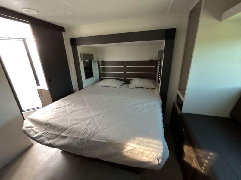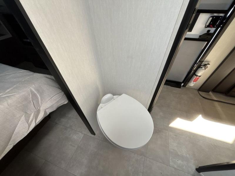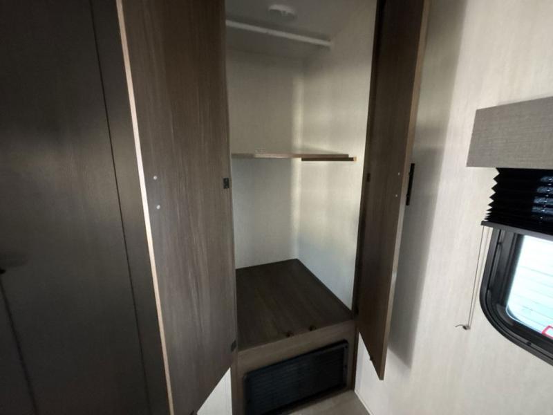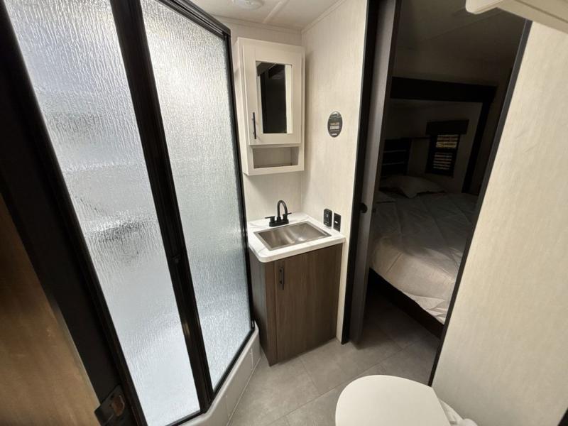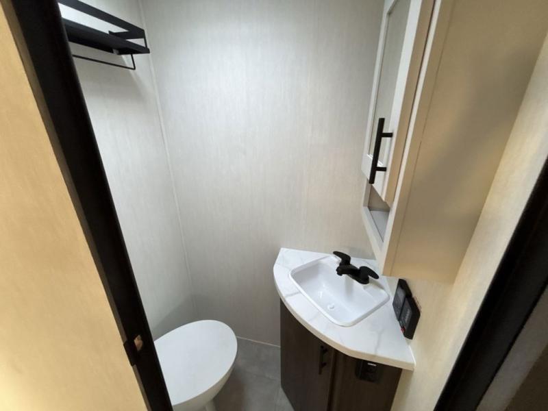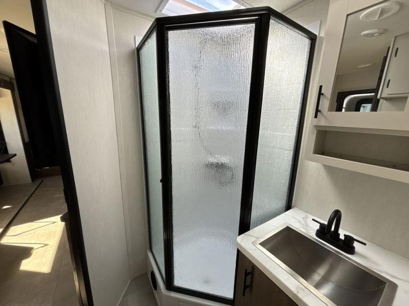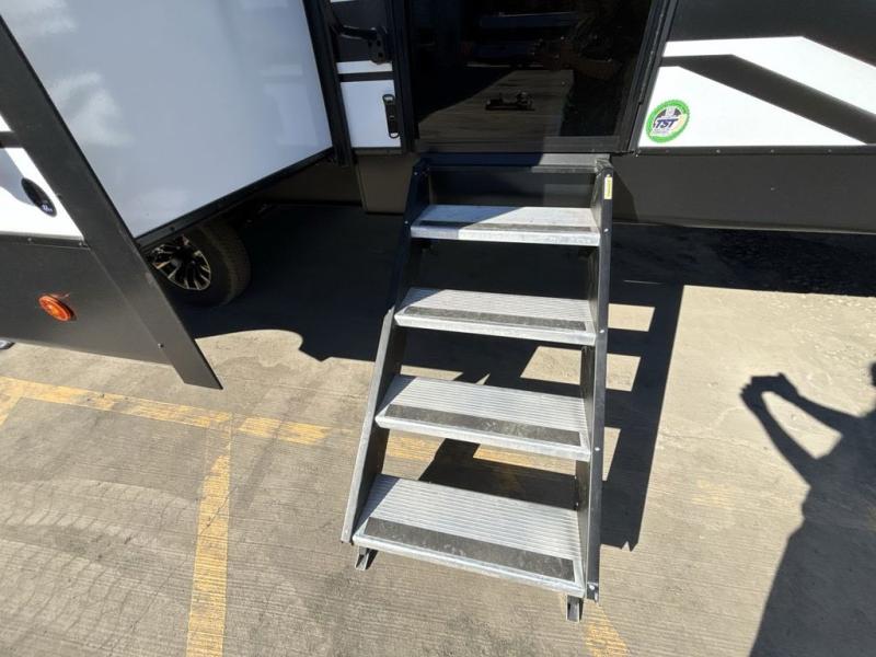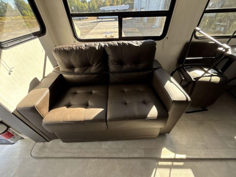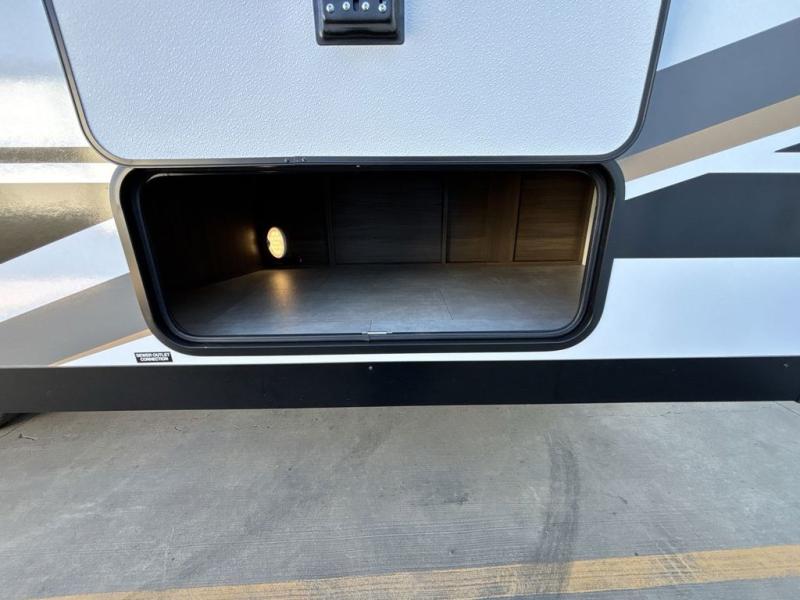 Privacy abounds in this travel trailer with a bedroom at each end! A king bed slide in the front has its own fireplace for cozy nights. Dual wardrobes frame the reading bench which looks out the front window for peaceful moments appreciating the view. At the rear, a second bedroom with queen bed has its own half bath. A pantry closet here also has prep for an optional washer/dryer for convenience on the road. In the center everyone can meet up in the spacious kitchen/living room. A hide-a-bed sofa has even more sleeping space, or relax there and watch the TV which is in the entertainment center along with another fireplace. The kitchen is well-equipped with a three-burner cooktop, microwave, and even an island where the sink is located for easy meal prep. Outside there are not one but two 10' power awnings for extra protection from the elements!