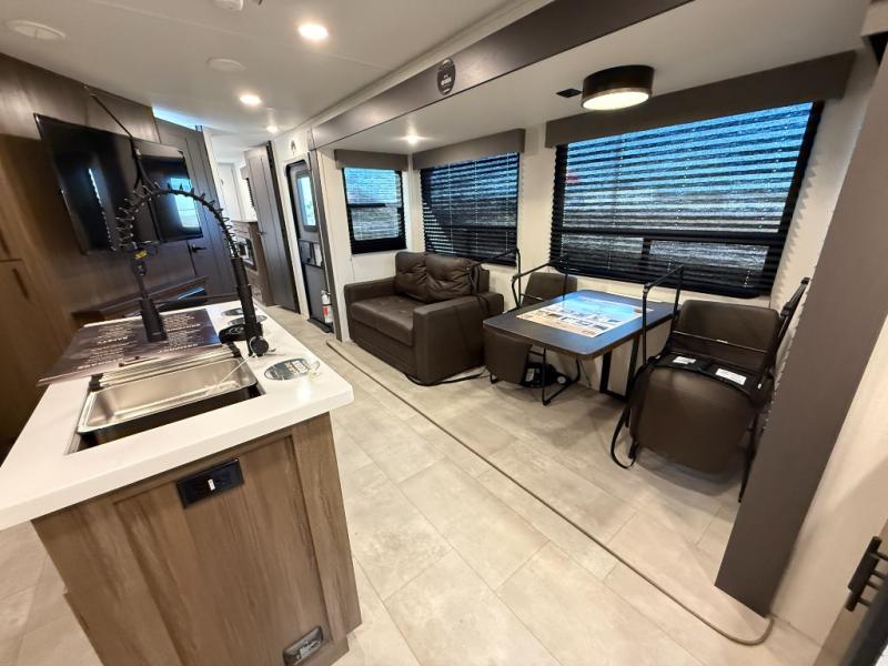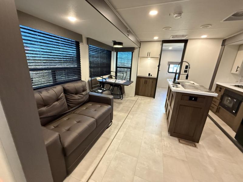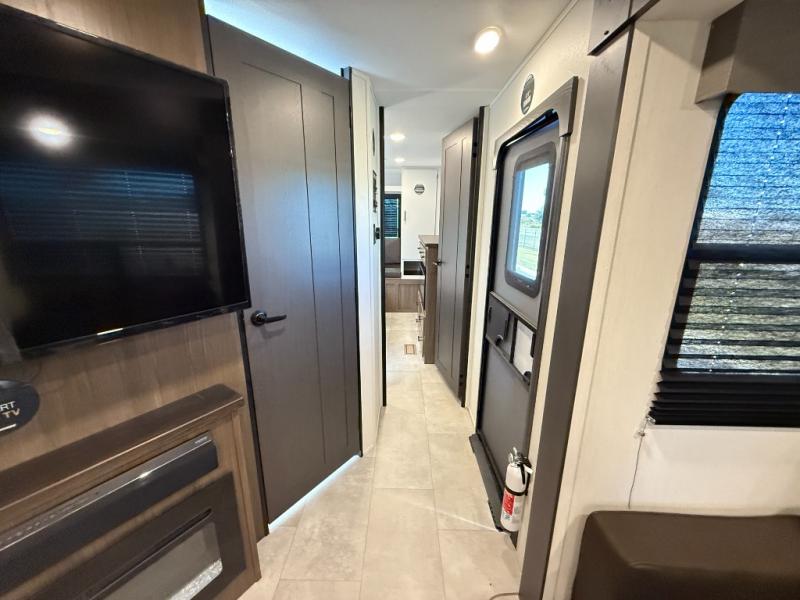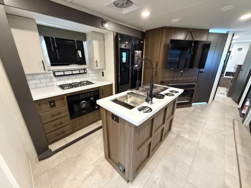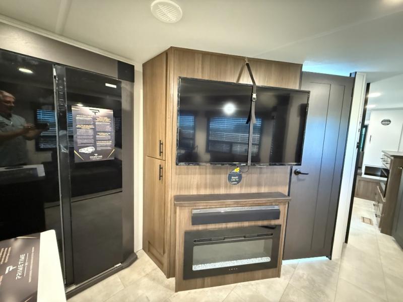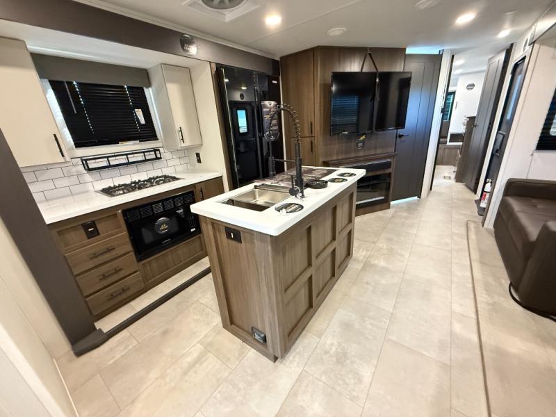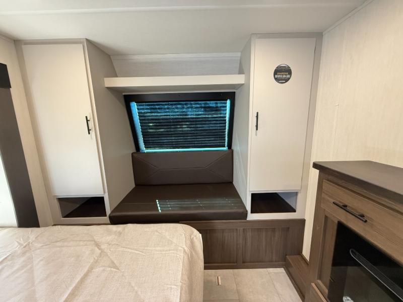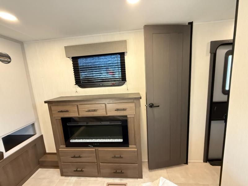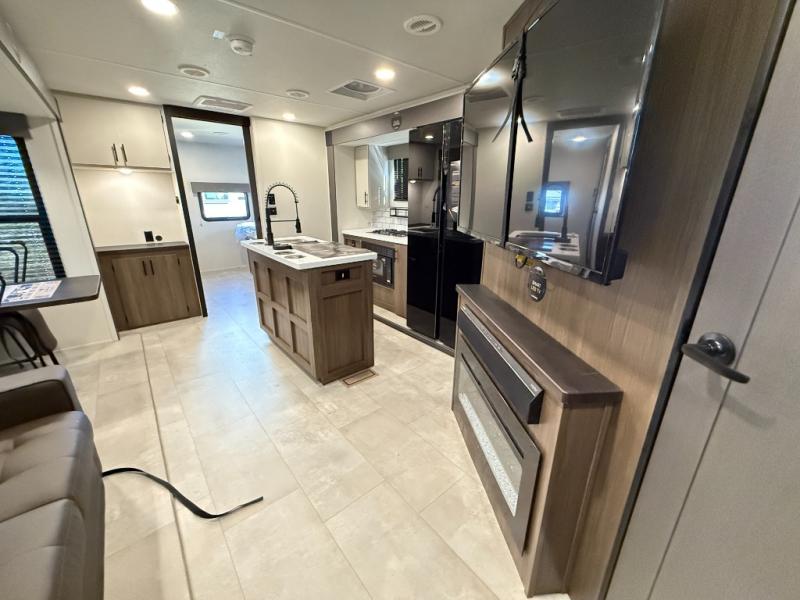 Privacy abounds in this travel trailer with a bedroom at each end! A king bed slide in the front has its own fireplace for cozy nights. Dual wardrobes frame the reading bench which looks out the front window for peaceful moments appreciating the view. At the rear, a second bedroom with queen bed has its own half bath. A pantry closet here also has prep for an optional washer/dryer for convenience on the road. In the center everyone can meet up in the spacious kitchen/living room. A hide-a-bed sofa has even more sleeping space, or relax there and watch the TV which is in the entertainment center along with another fireplace. The kitchen is well-equipped with a three-burner cooktop, microwave, and even an island where the sink is located for easy meal prep. Outside there are not one but two 10' power awnings for extra protection from the elements!