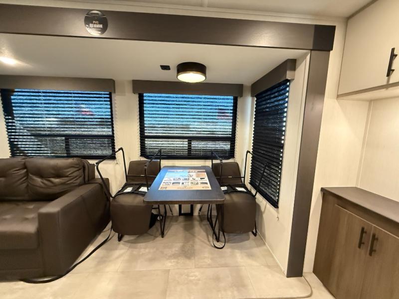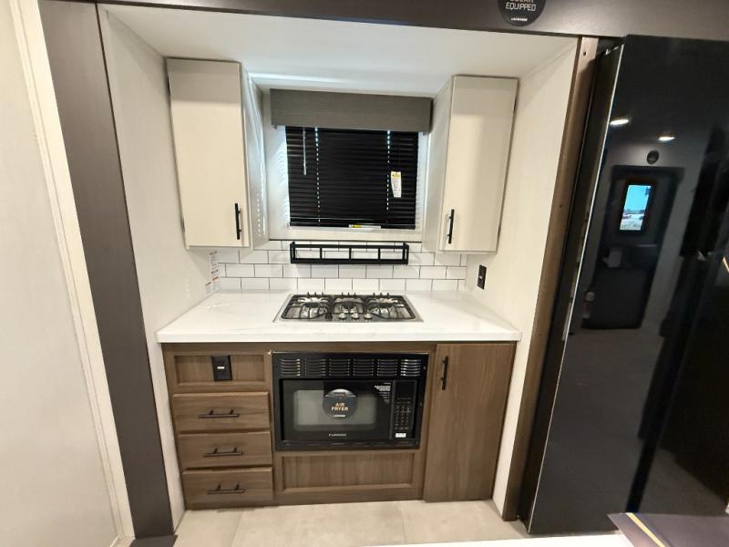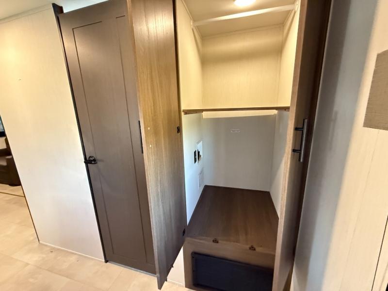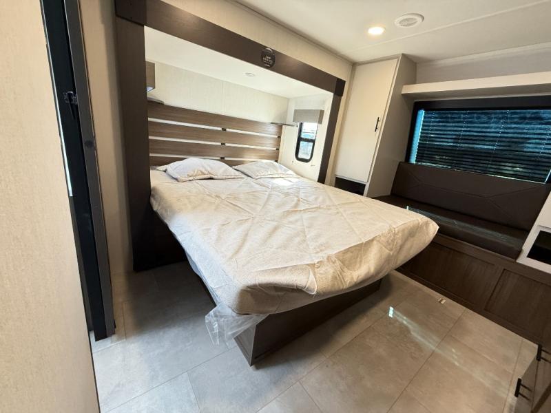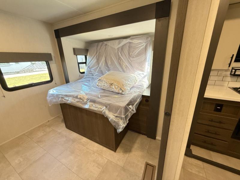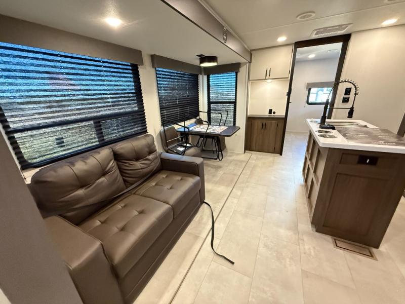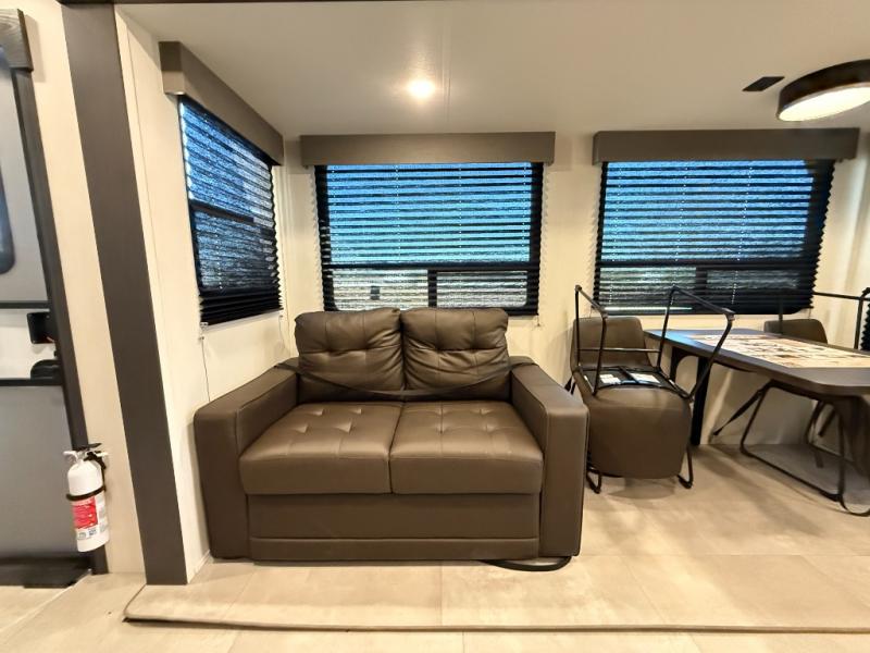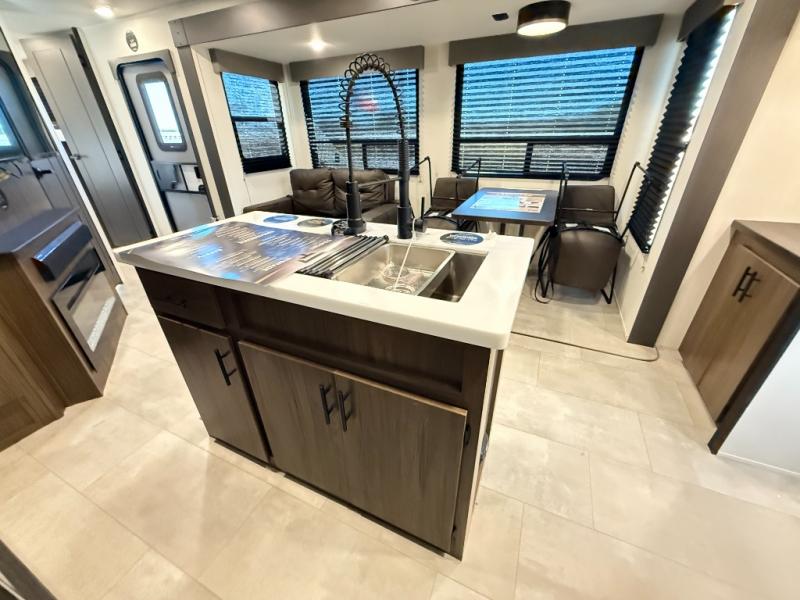 Privacy abounds in this travel trailer with a bedroom at each end! A king bed slide in the front has its own fireplace for cozy nights. Dual wardrobes frame the reading bench which looks out the front window for peaceful moments appreciating the view. At the rear, a second bedroom with queen bed has its own half bath. A pantry closet here also has prep for an optional washer/dryer for convenience on the road. In the center everyone can meet up in the spacious kitchen/living room. A hide-a-bed sofa has even more sleeping space, or relax there and watch the TV which is in the entertainment center along with another fireplace. The kitchen is well-equipped with a three-burner cooktop, microwave, and even an island where the sink is located for easy meal prep. Outside there are not one but two 10' power awnings for extra protection from the elements!