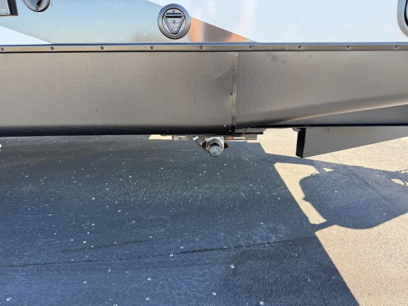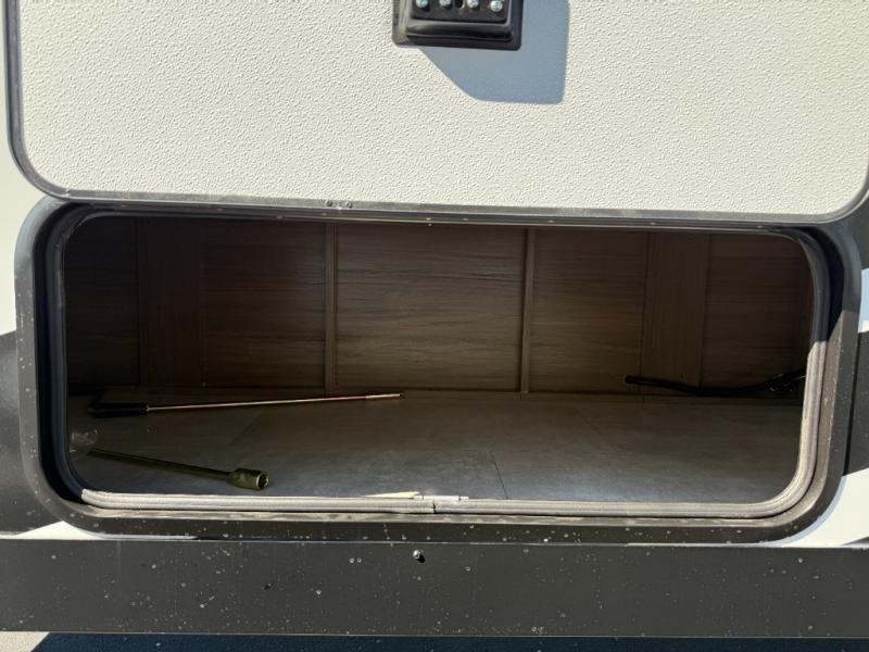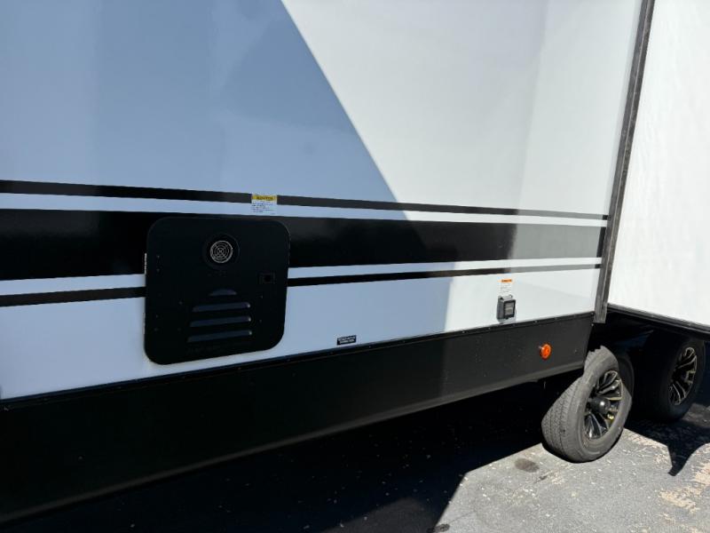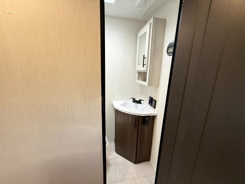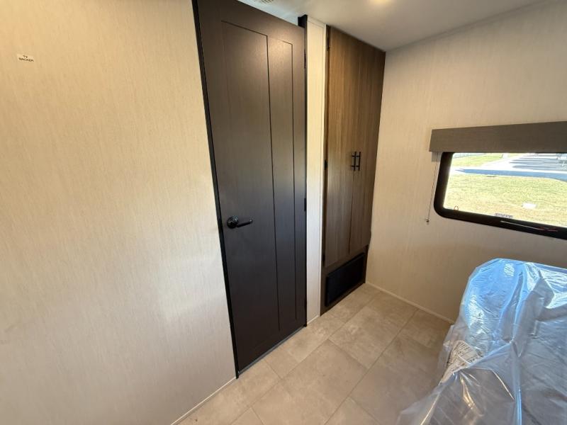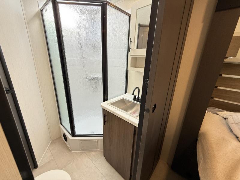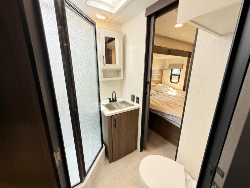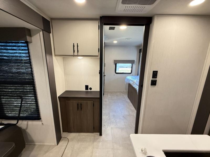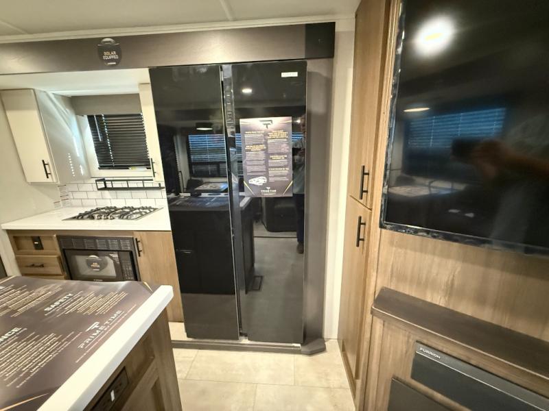 Privacy abounds in this travel trailer with a bedroom at each end! A king bed slide in the front has its own fireplace for cozy nights. Dual wardrobes frame the reading bench which looks out the front window for peaceful moments appreciating the view. At the rear, a second bedroom with queen bed has its own half bath. A pantry closet here also has prep for an optional washer/dryer for convenience on the road. In the center everyone can meet up in the spacious kitchen/living room. A hide-a-bed sofa has even more sleeping space, or relax there and watch the TV which is in the entertainment center along with another fireplace. The kitchen is well-equipped with a three-burner cooktop, microwave, and even an island where the sink is located for easy meal prep. Outside there are not one but two 10' power awnings for extra protection from the elements!