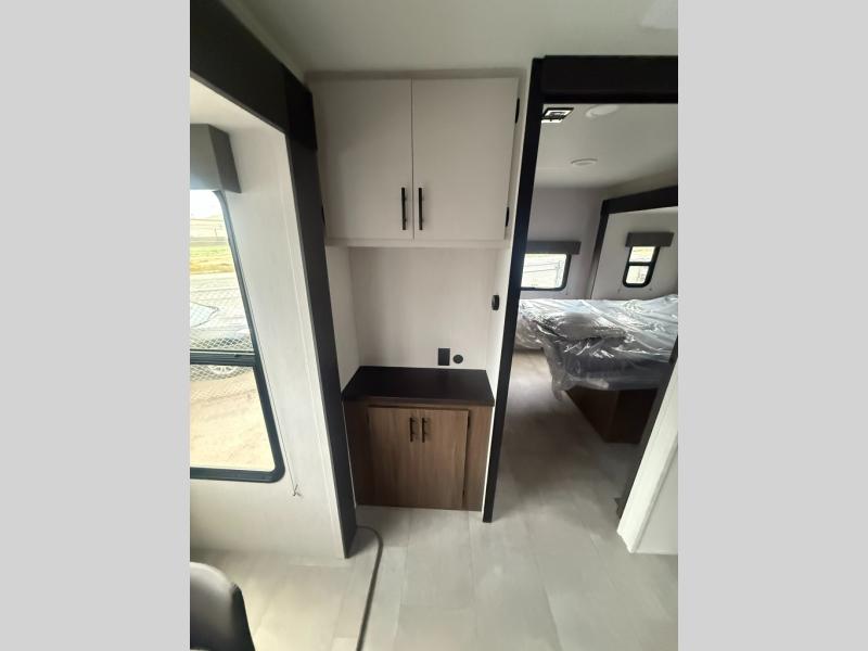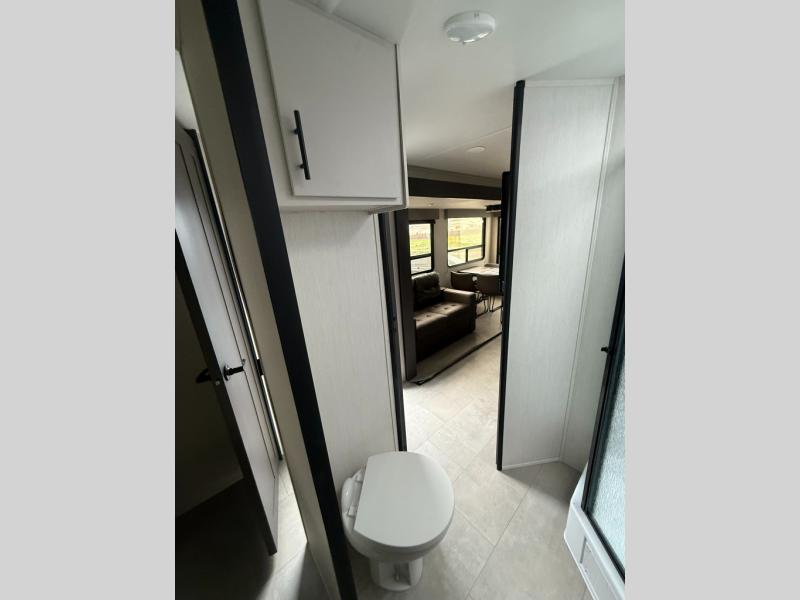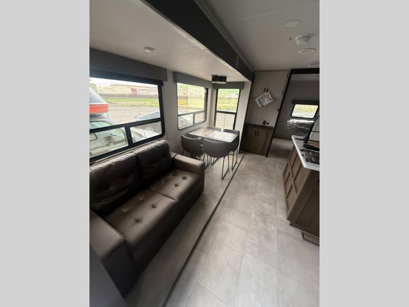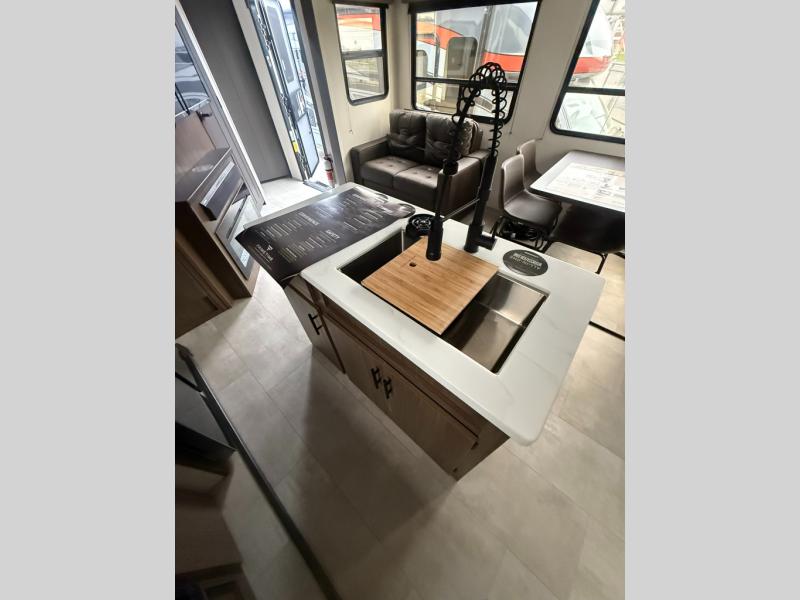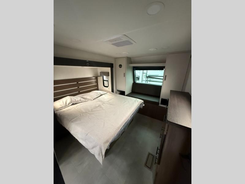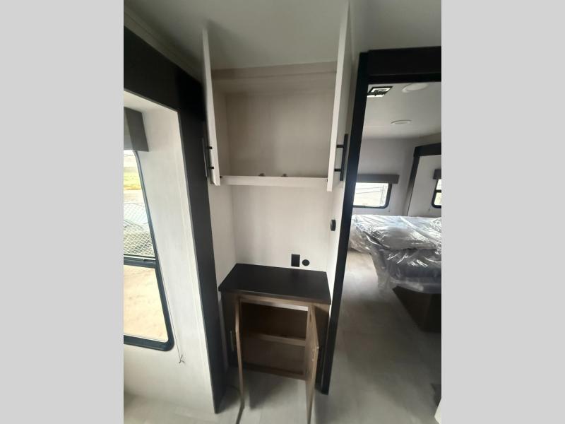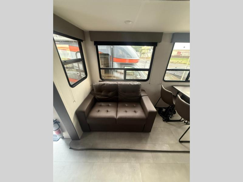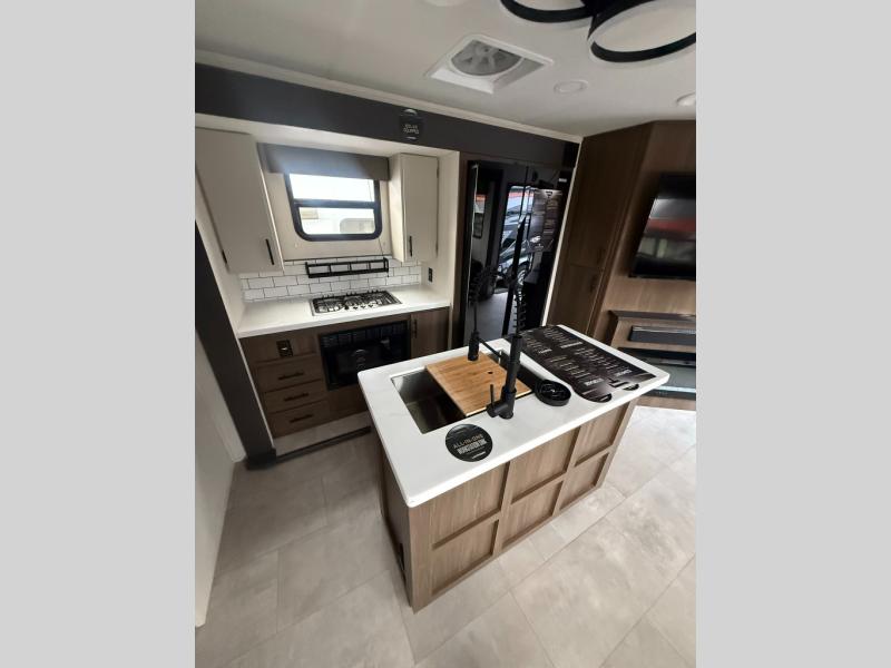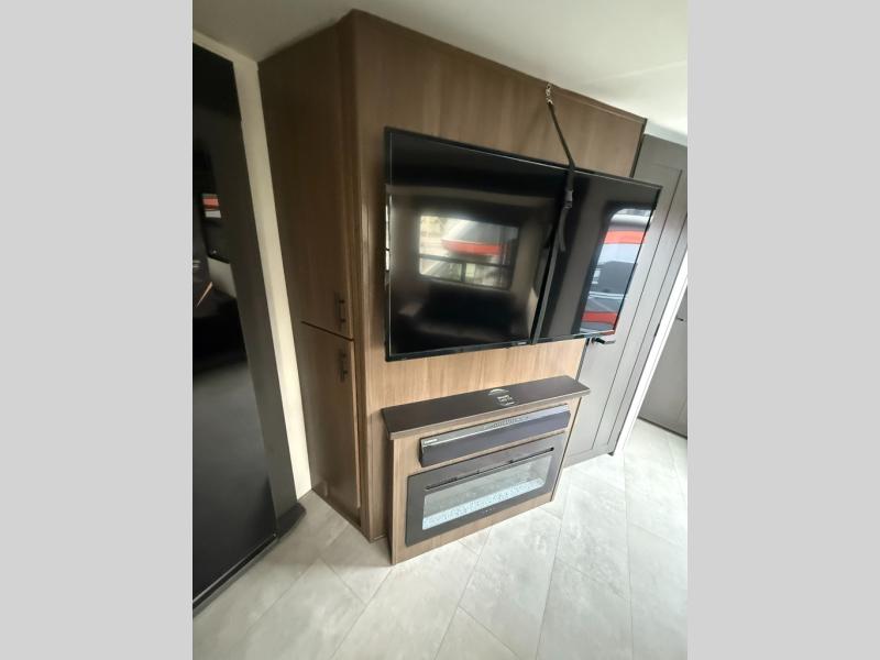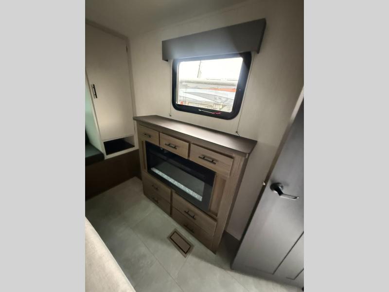 Privacy abounds in this travel trailer with a bedroom at each end! A king bed slide in the front has its own fireplace for cozy nights. Dual wardrobes frame the reading bench which looks out the front window for peaceful moments appreciating the view. At the rear, a second bedroom with queen bed has its own half bath. A pantry closet here also has prep for an optional washer/dryer for convenience on the road. In the center everyone can meet up in the spacious kitchen/living room. A hide-a-bed sofa has even more sleeping space, or relax there and watch the TV which is in the entertainment center along with another fireplace. The kitchen is well-equipped with a three-burner cooktop, microwave, and even an island where the sink is located for easy meal prep. Outside there are not one but two 10' power awnings for extra protection from the elements!