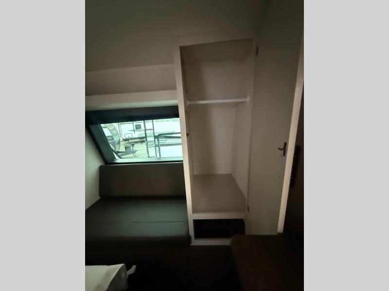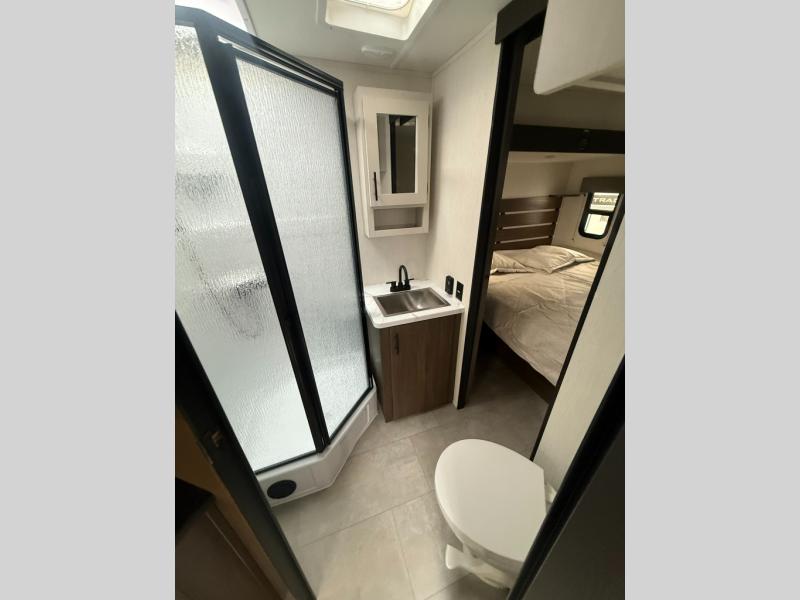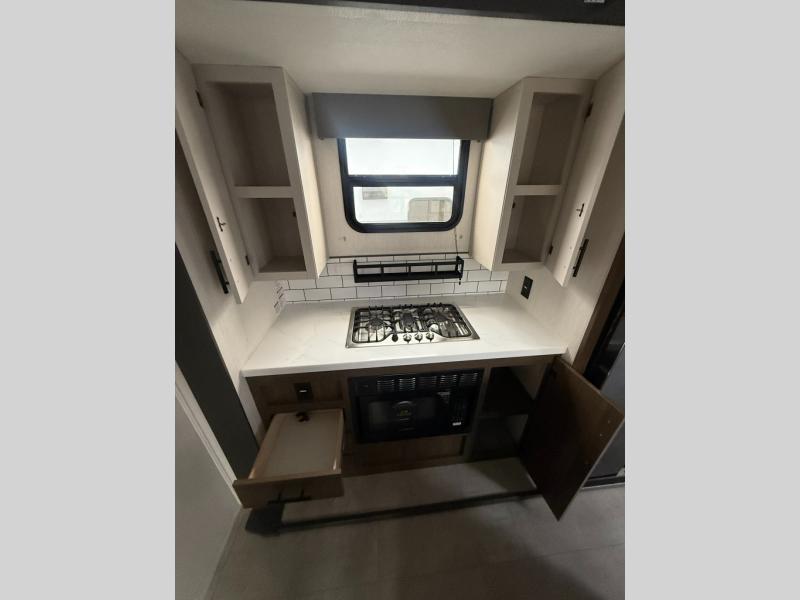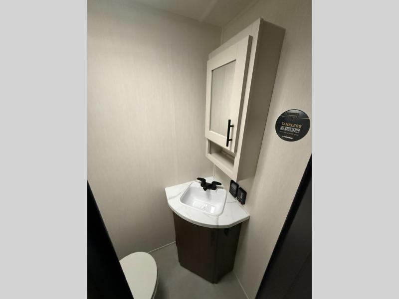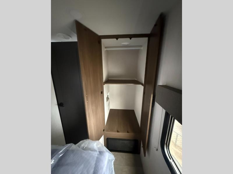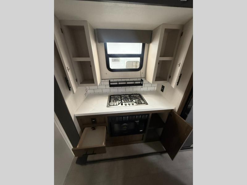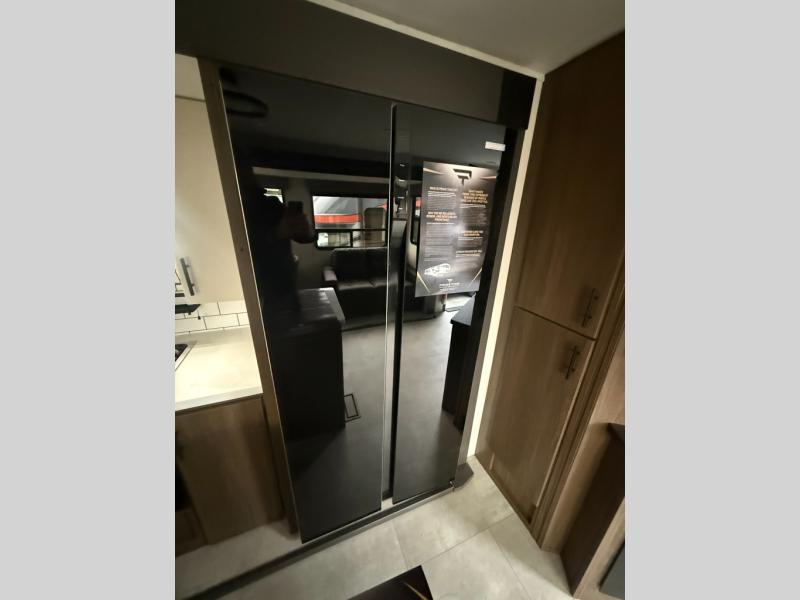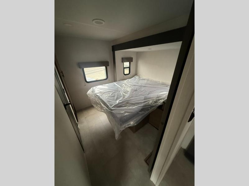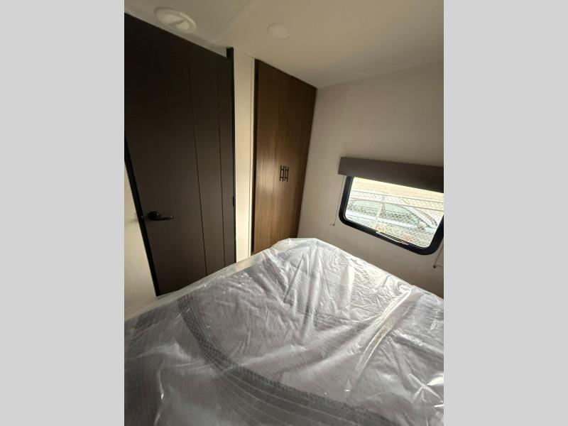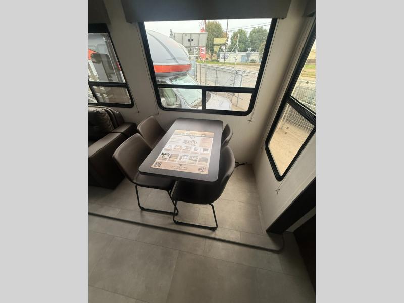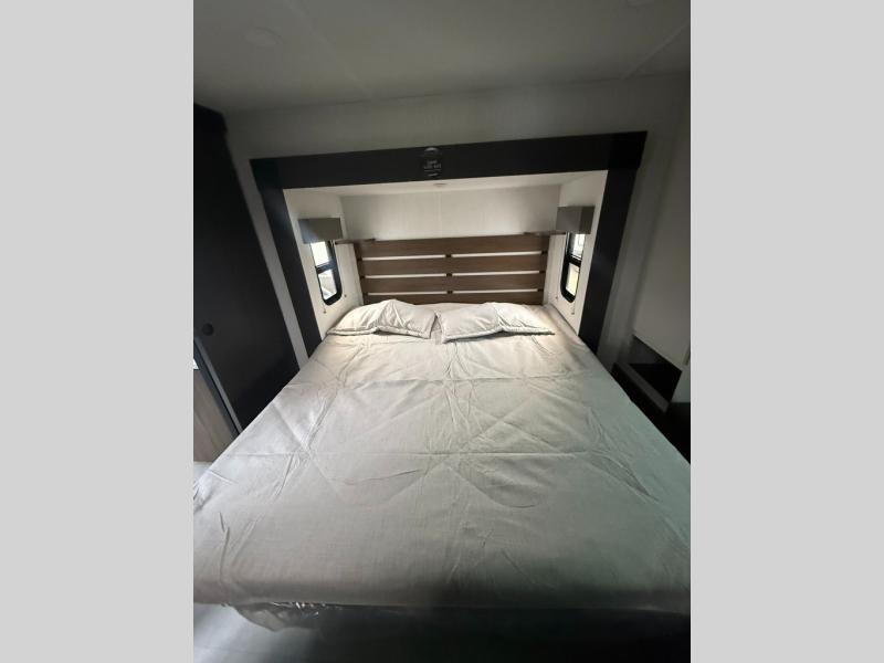 Privacy abounds in this travel trailer with a bedroom at each end! A king bed slide in the front has its own fireplace for cozy nights. Dual wardrobes frame the reading bench which looks out the front window for peaceful moments appreciating the view. At the rear, a second bedroom with queen bed has its own half bath. A pantry closet here also has prep for an optional washer/dryer for convenience on the road. In the center everyone can meet up in the spacious kitchen/living room. A hide-a-bed sofa has even more sleeping space, or relax there and watch the TV which is in the entertainment center along with another fireplace. The kitchen is well-equipped with a three-burner cooktop, microwave, and even an island where the sink is located for easy meal prep. Outside there are not one but two 10' power awnings for extra protection from the elements!