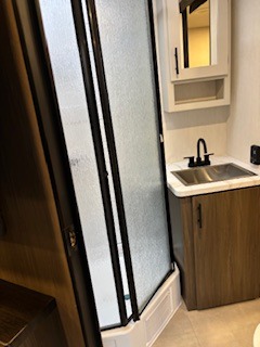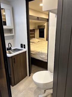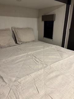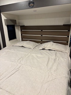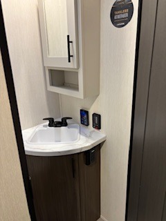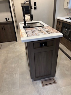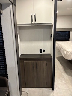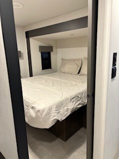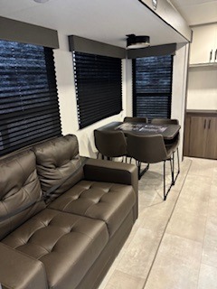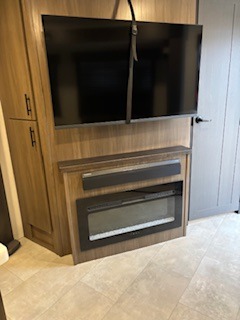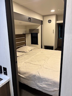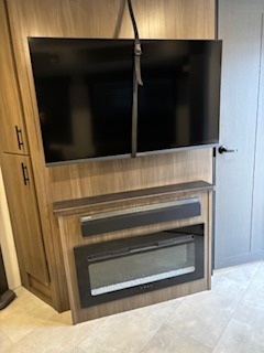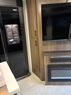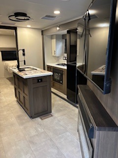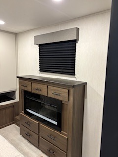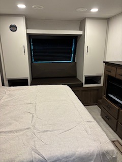 Privacy abounds in this travel trailer with a bedroom at each end! A king bed slide in the front has its own fireplace for cozy nights. Dual wardrobes frame the reading bench which looks out the front window for peaceful moments appreciating the view. At the rear, a second bedroom with queen bed has its own half bath. A pantry closet here also has prep for an optional washer/dryer for convenience on the road. In the center everyone can meet up in the spacious kitchen/living room. A hide-a-bed sofa has even more sleeping space, or relax there and watch the TV which is in the entertainment center along with another fireplace. The kitchen is well-equipped with a three-burner cooktop, microwave, and even an island where the sink is located for easy meal prep. Outside there are not one but two 10' power awnings for extra protection from the elements!