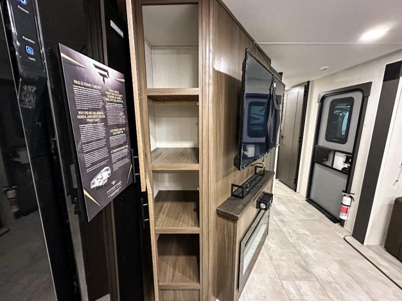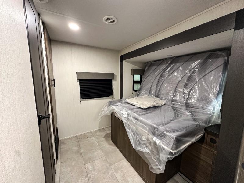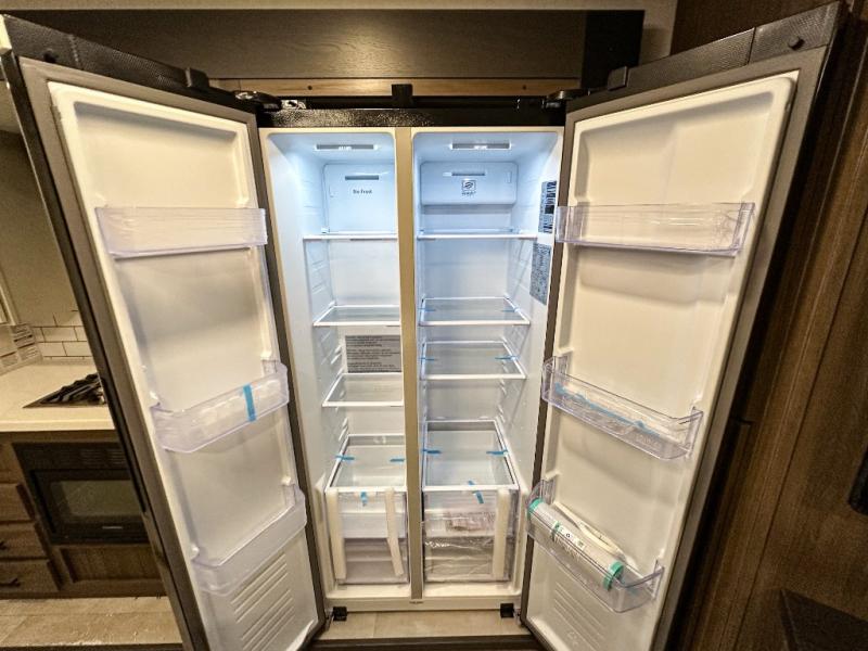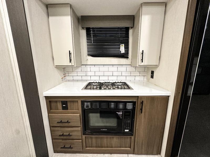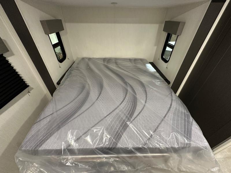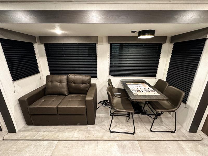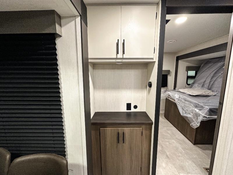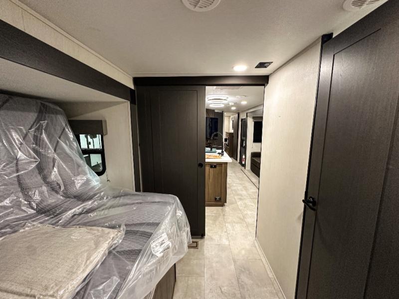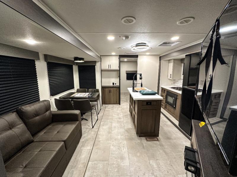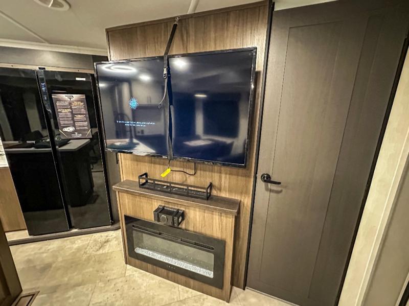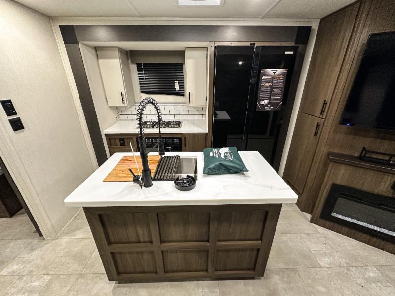 Privacy abounds in this travel trailer with a bedroom at each end! A king bed slide in the front has its own fireplace for cozy nights. Dual wardrobes frame the reading bench which looks out the front window for peaceful moments appreciating the view. At the rear, a second bedroom with queen bed has its own half bath. A pantry closet here also has prep for an optional washer/dryer for convenience on the road. In the center everyone can meet up in the spacious kitchen/living room. A hide-a-bed sofa has even more sleeping space, or relax there and watch the TV which is in the entertainment center along with another fireplace. The kitchen is well-equipped with a three-burner cooktop, microwave, and even an island where the sink is located for easy meal prep. Outside there are not one but two 10' power awnings for extra protection from the elements!
