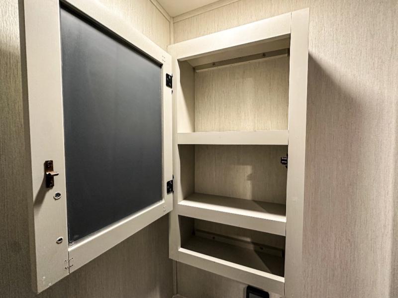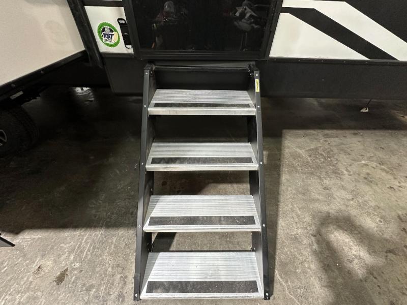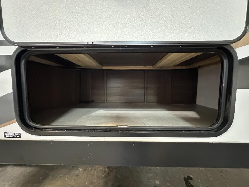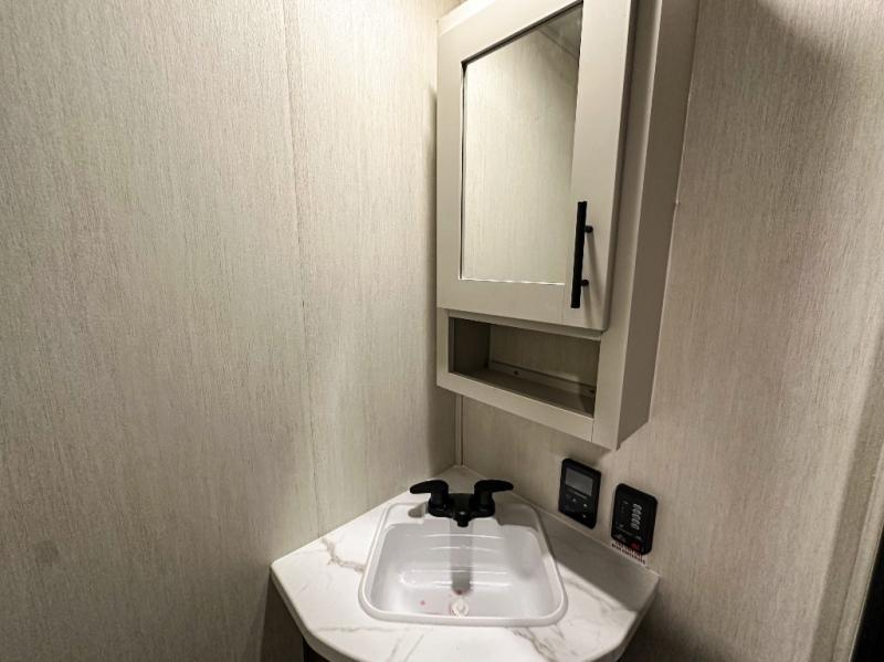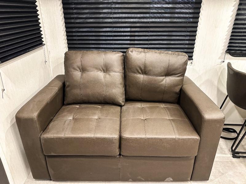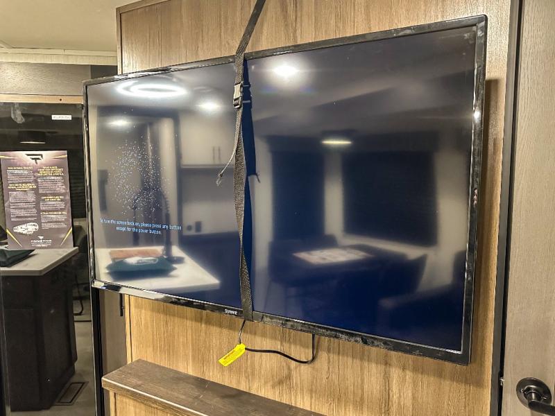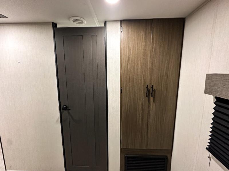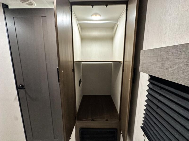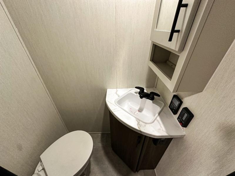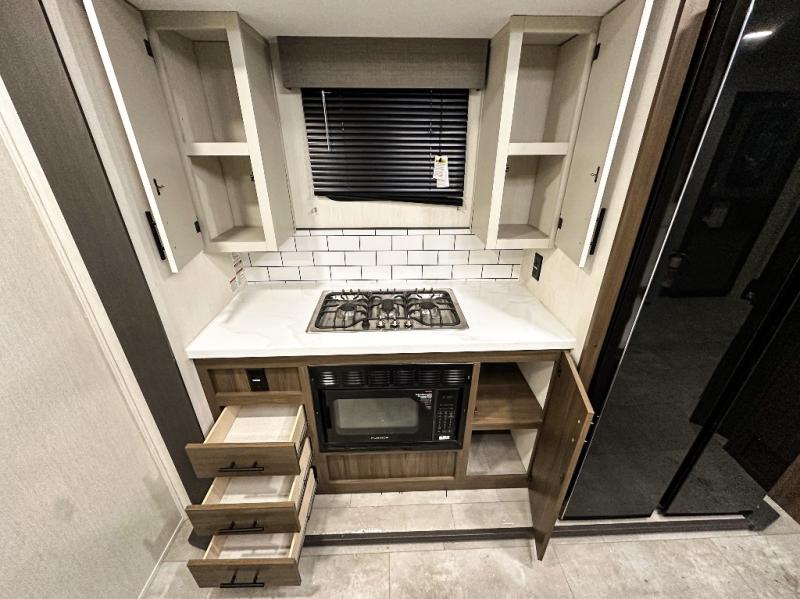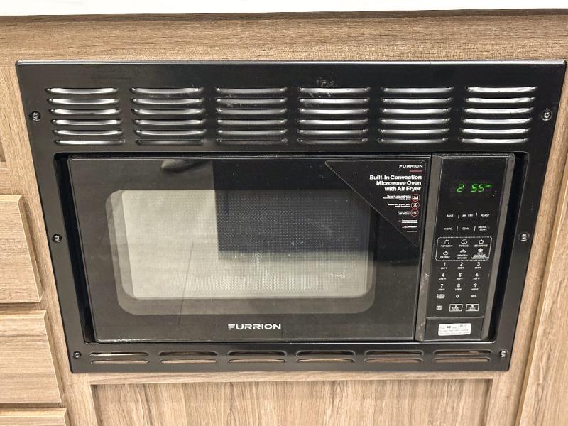 Privacy abounds in this travel trailer with a bedroom at each end! A king bed slide in the front has its own fireplace for cozy nights. Dual wardrobes frame the reading bench which looks out the front window for peaceful moments appreciating the view. At the rear, a second bedroom with queen bed has its own half bath. A pantry closet here also has prep for an optional washer/dryer for convenience on the road. In the center everyone can meet up in the spacious kitchen/living room. A hide-a-bed sofa has even more sleeping space, or relax there and watch the TV which is in the entertainment center along with another fireplace. The kitchen is well-equipped with a three-burner cooktop, microwave, and even an island where the sink is located for easy meal prep. Outside there are not one but two 10' power awnings for extra protection from the elements!