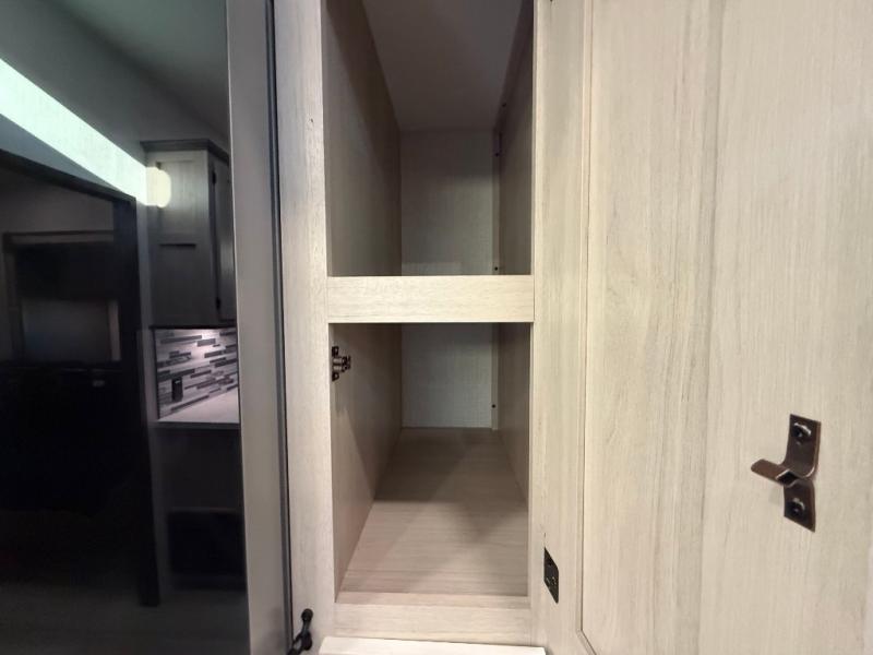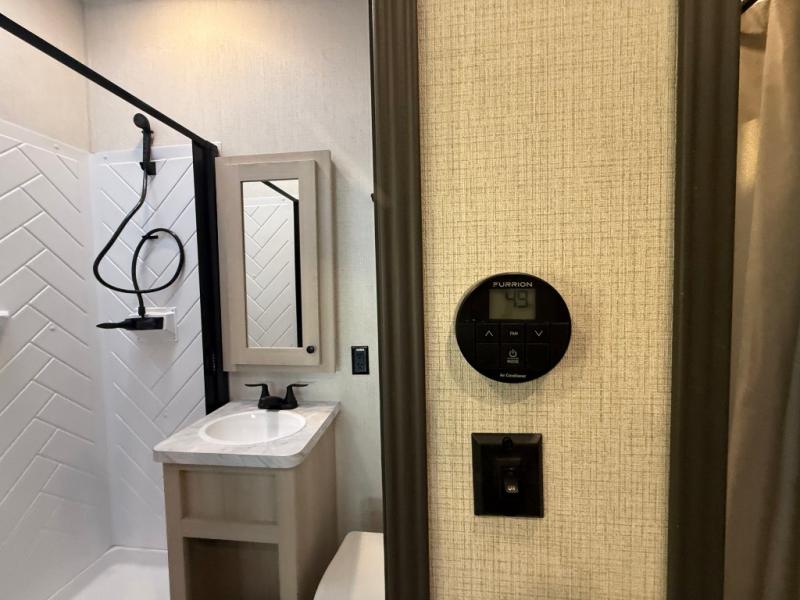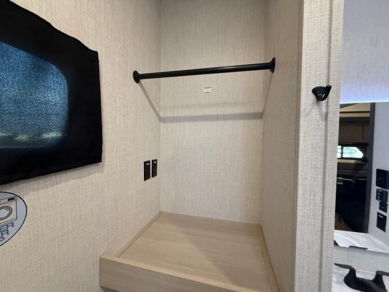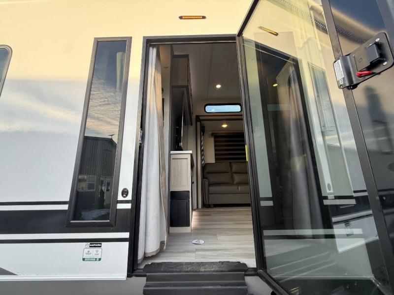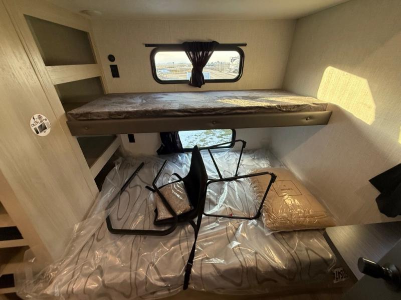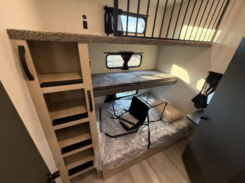 This stunning travel trailer is designed for families and travelers who crave comfort. Two rear bunk beds and a cozy loft above them create a fun and playful sleeping area for kids or guests, perfect for family bonding and sweet dreams. The full bathroom is equipped with everything you need to start your day feeling refreshed and revitalized. In the living area, the entertainment center features a warm fireplace, ideal for chilly evenings and cozy movie nights, while the plush L sofa is the perfect spot to unwind and enjoy quality time with loved ones. The pantry is stocked with storage for your favorite snacks and ingredients, while the fridge keeps everything fresh. There is a well-equipped kitchen with a spacious countertop for added convenience. Plus, the main bedroom is a peaceful sanctuary, featuring a luxurious king bed, spacious wardrobes, a stylish dresser, and the front bathroom is a thoughtful touch, offering privacy for your family or guests.