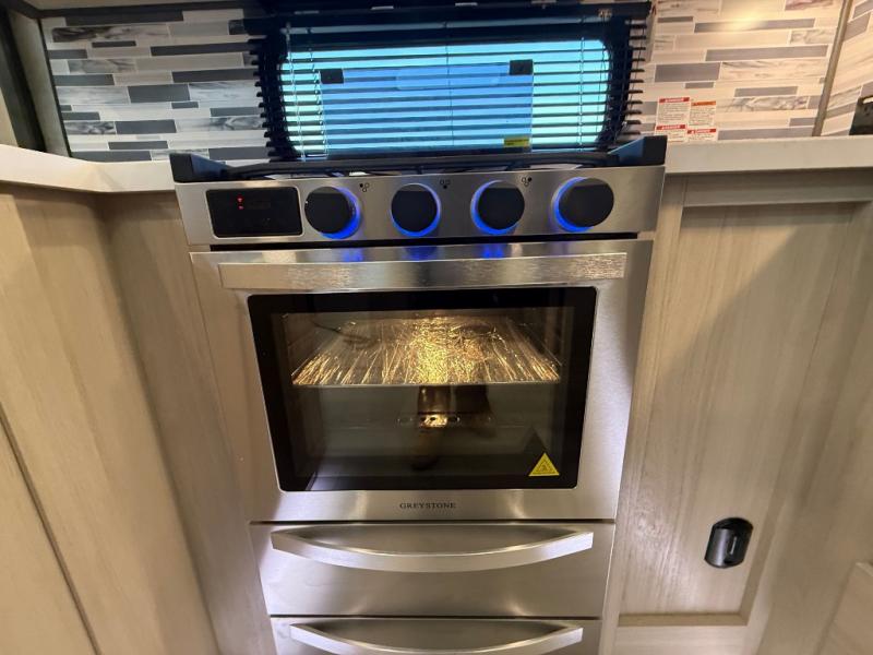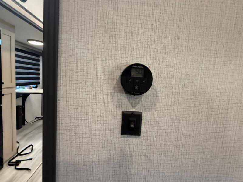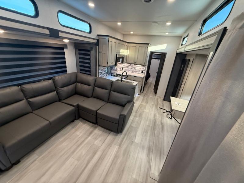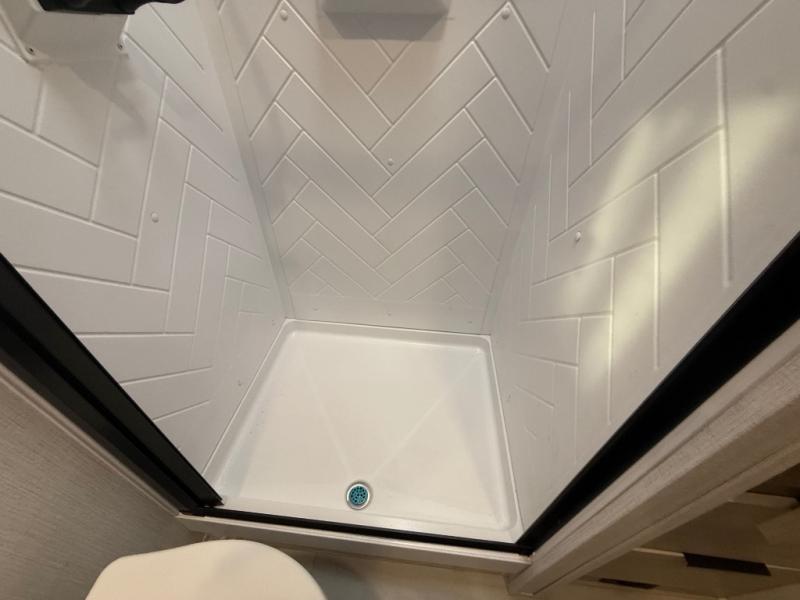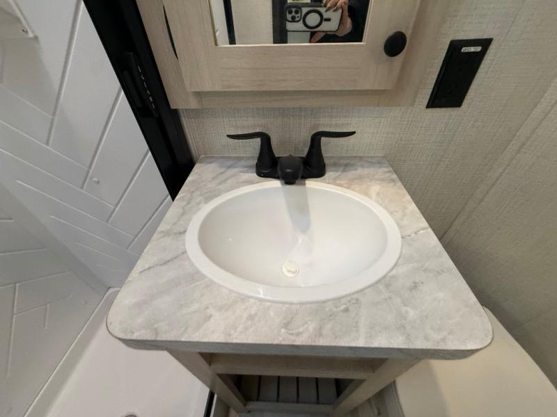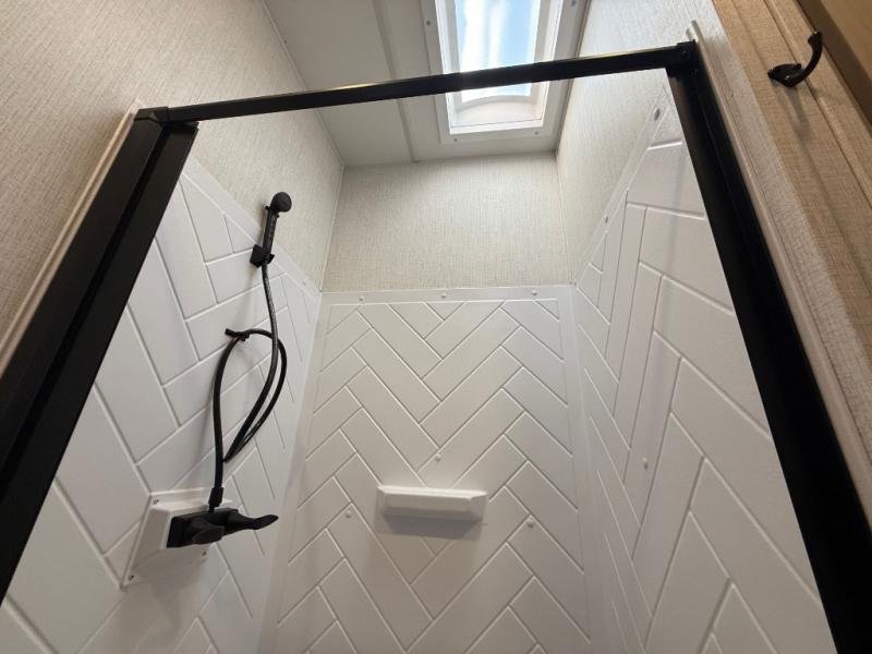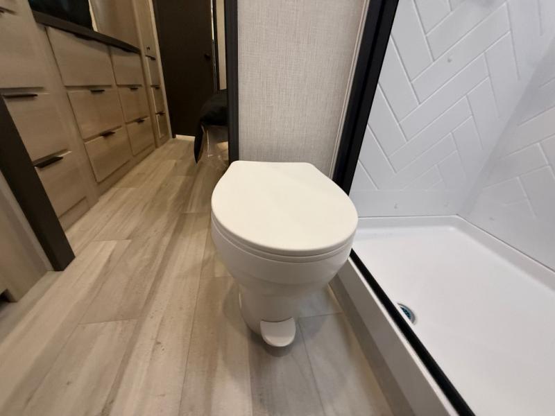 This stunning travel trailer is designed for families and travelers who crave comfort. Two rear bunk beds and a cozy loft above them create a fun and playful sleeping area for kids or guests, perfect for family bonding and sweet dreams. The full bathroom is equipped with everything you need to start your day feeling refreshed and revitalized. In the living area, the entertainment center features a warm fireplace, ideal for chilly evenings and cozy movie nights, while the plush L sofa is the perfect spot to unwind and enjoy quality time with loved ones. The pantry is stocked with storage for your favorite snacks and ingredients, while the fridge keeps everything fresh. There is a well-equipped kitchen with a spacious countertop for added convenience. Plus, the main bedroom is a peaceful sanctuary, featuring a luxurious king bed, spacious wardrobes, a stylish dresser, and the front bathroom is a thoughtful touch, offering privacy for your family or guests.