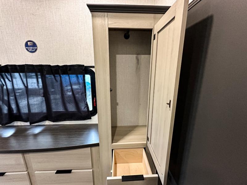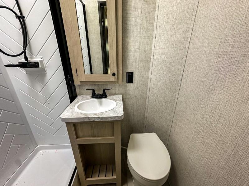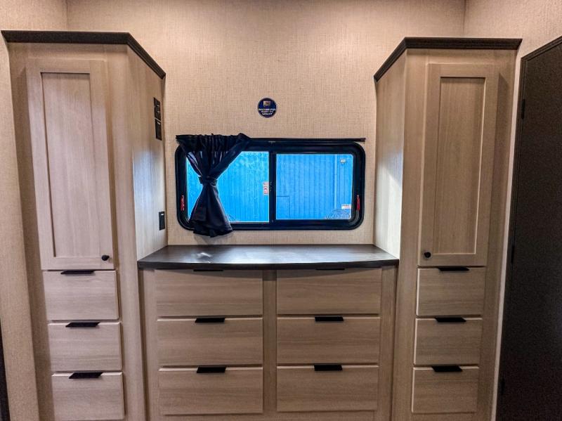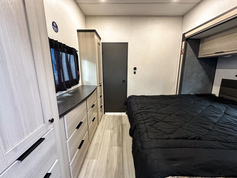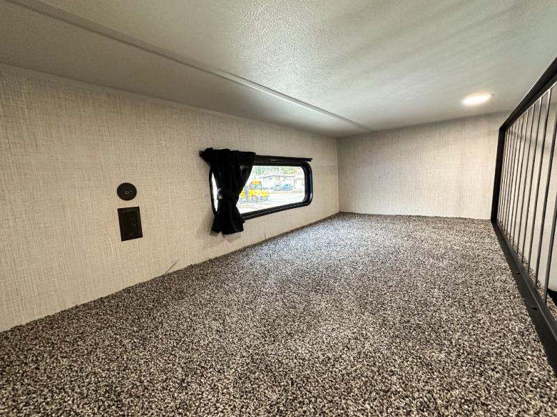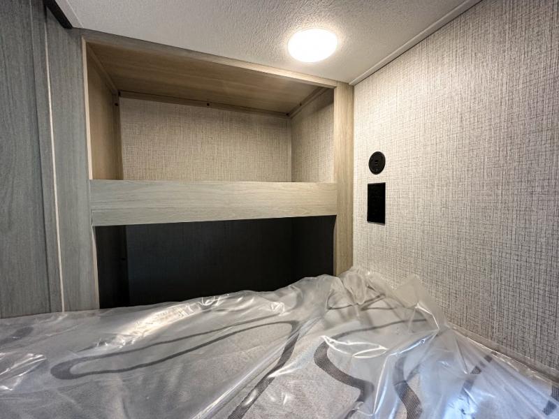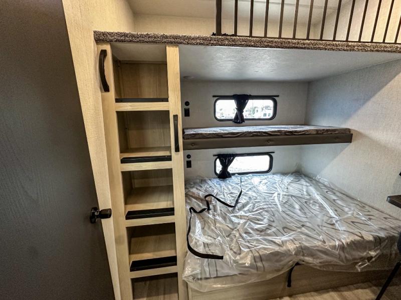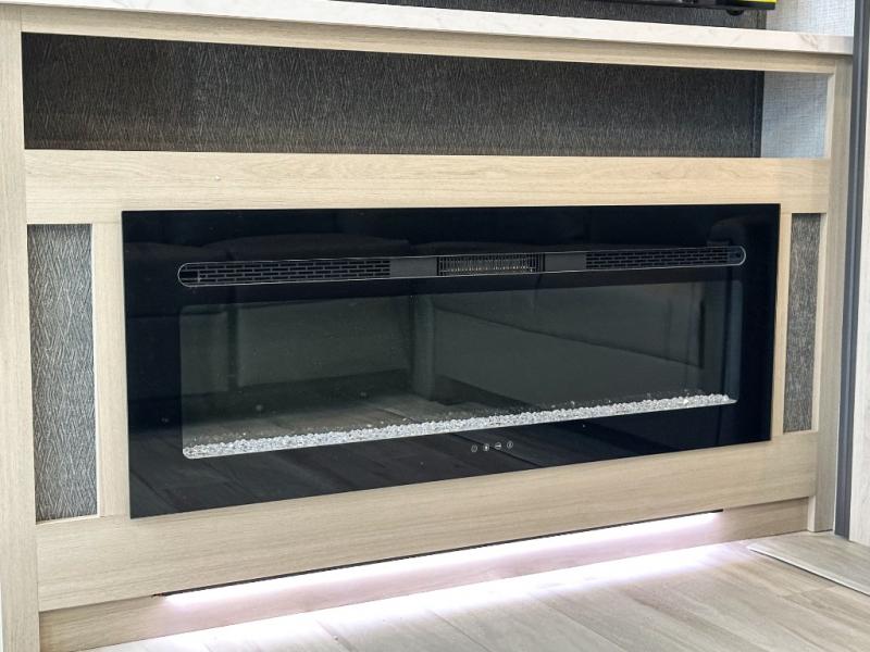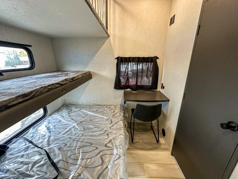 This stunning travel trailer is designed for families and travelers who crave comfort. Two rear bunk beds and a cozy loft above them create a fun and playful sleeping area for kids or guests, perfect for family bonding and sweet dreams. The full bathroom is equipped with everything you need to start your day feeling refreshed and revitalized. In the living area, the entertainment center features a warm fireplace, ideal for chilly evenings and cozy movie nights, while the plush L sofa is the perfect spot to unwind and enjoy quality time with loved ones. The pantry is stocked with storage for your favorite snacks and ingredients, while the fridge keeps everything fresh. There is a well-equipped kitchen with a spacious countertop for added convenience. Plus, the main bedroom is a peaceful sanctuary, featuring a luxurious king bed, spacious wardrobes, a stylish dresser, and the front bathroom is a thoughtful touch, offering privacy for your family or guests.