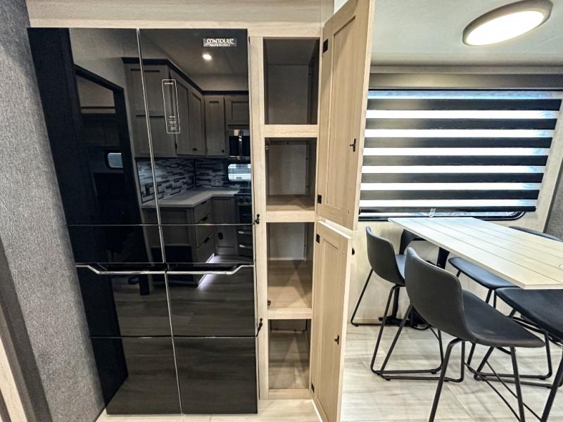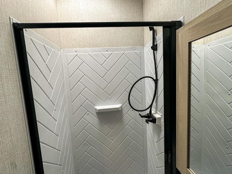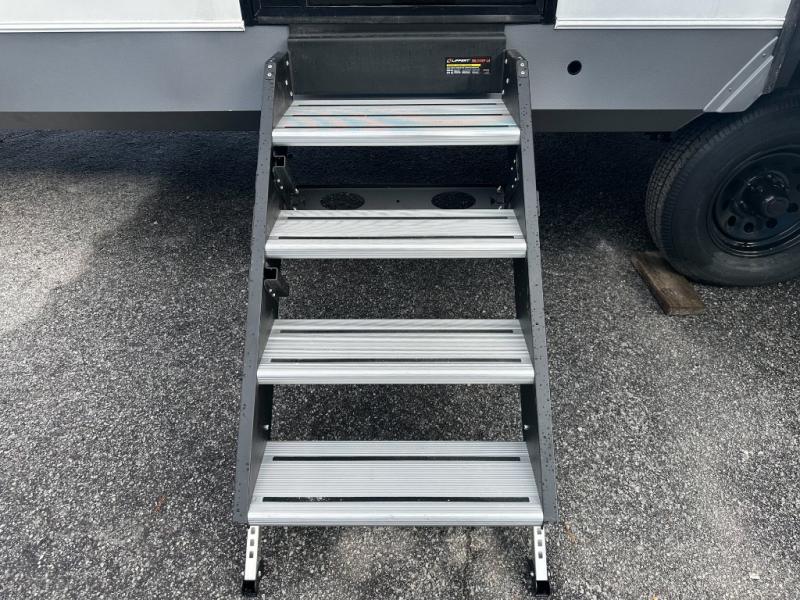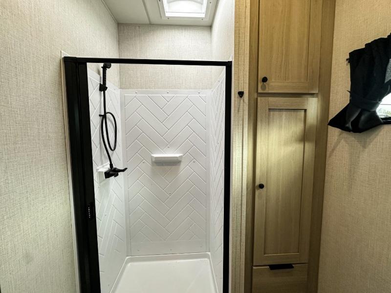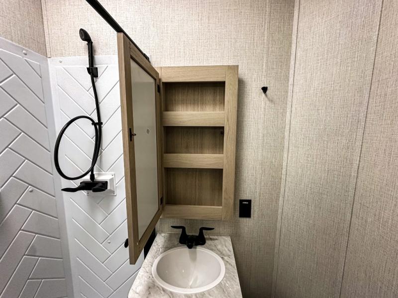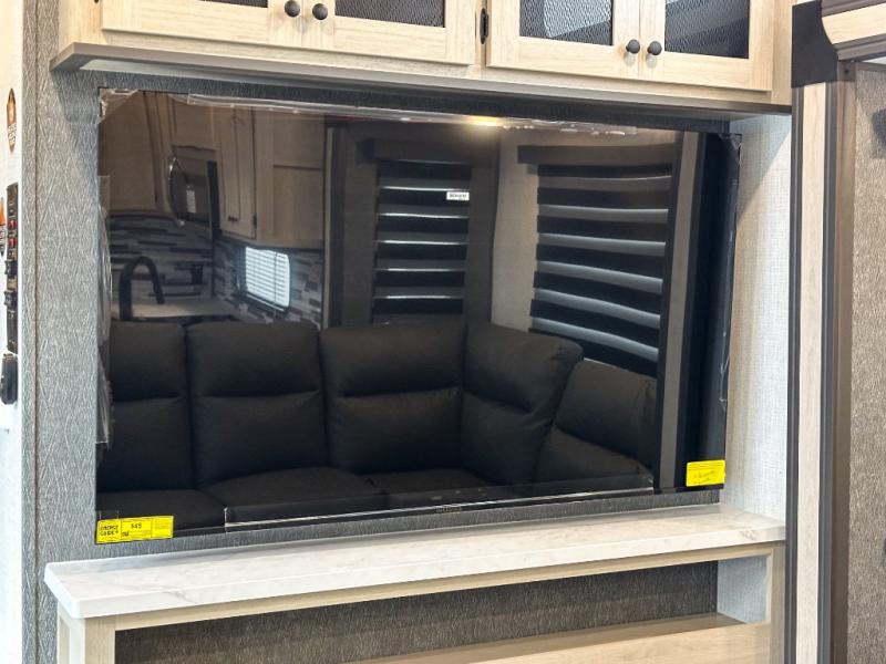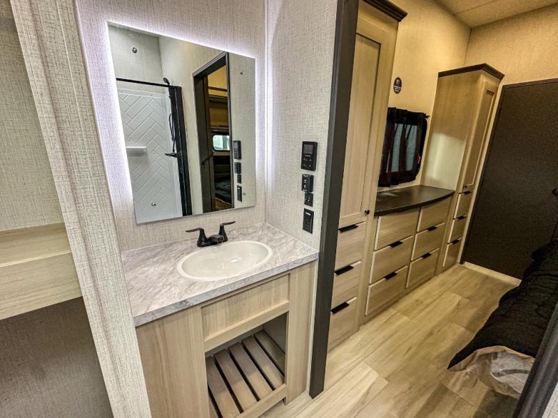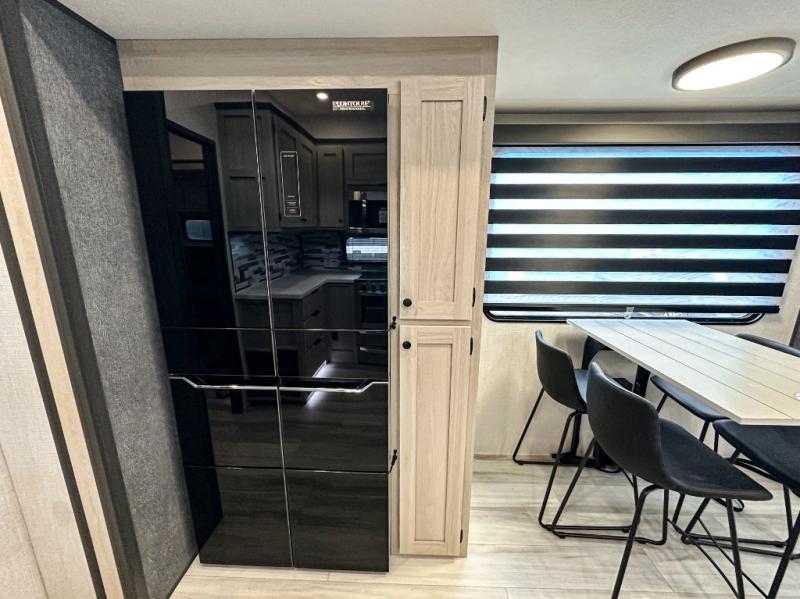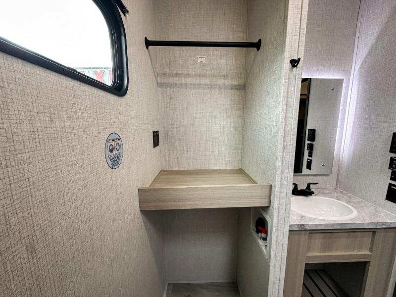 This stunning travel trailer is designed for families and travelers who crave comfort. Two rear bunk beds and a cozy loft above them create a fun and playful sleeping area for kids or guests, perfect for family bonding and sweet dreams. The full bathroom is equipped with everything you need to start your day feeling refreshed and revitalized. In the living area, the entertainment center features a warm fireplace, ideal for chilly evenings and cozy movie nights, while the plush L sofa is the perfect spot to unwind and enjoy quality time with loved ones. The pantry is stocked with storage for your favorite snacks and ingredients, while the fridge keeps everything fresh. There is a well-equipped kitchen with a spacious countertop for added convenience. Plus, the main bedroom is a peaceful sanctuary, featuring a luxurious king bed, spacious wardrobes, a stylish dresser, and the front bathroom is a thoughtful touch, offering privacy for your family or guests.