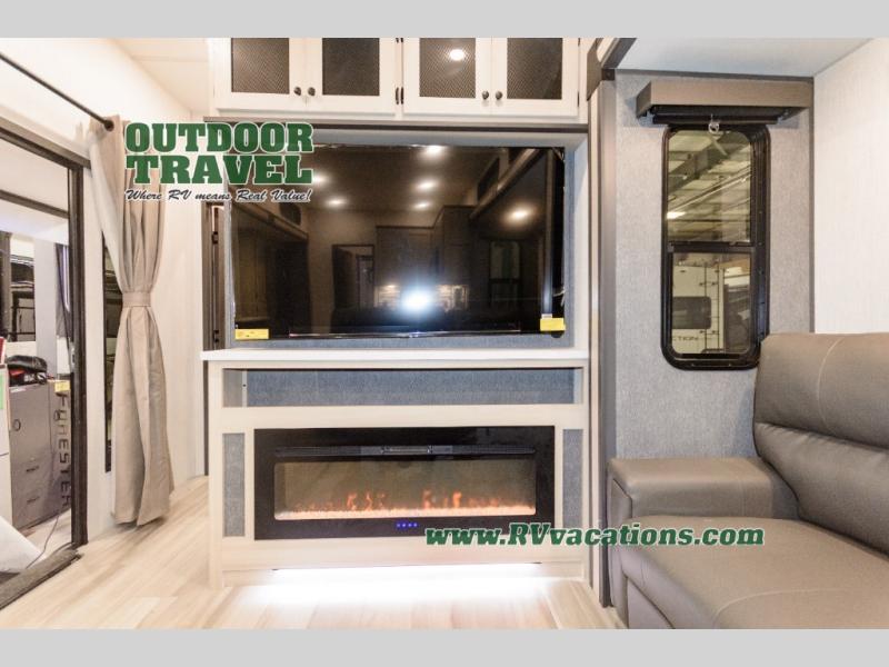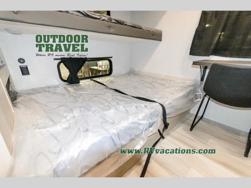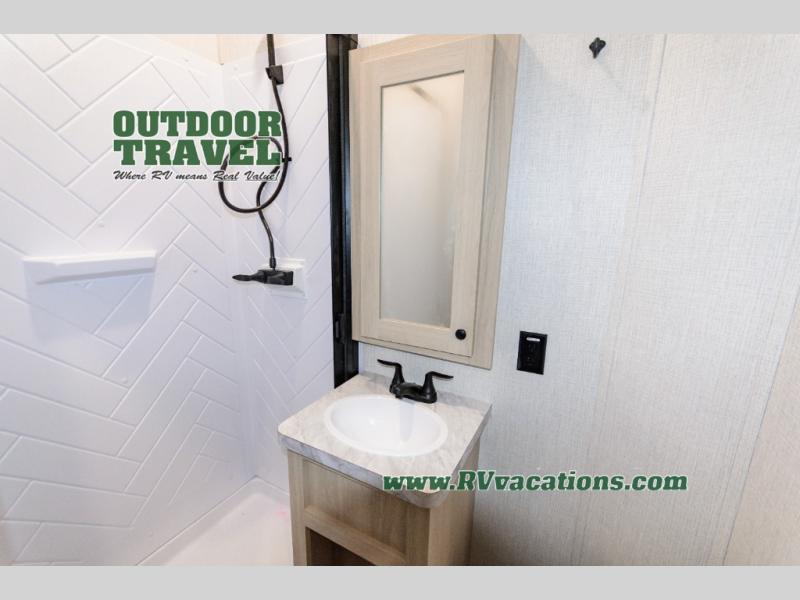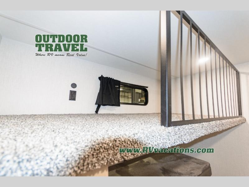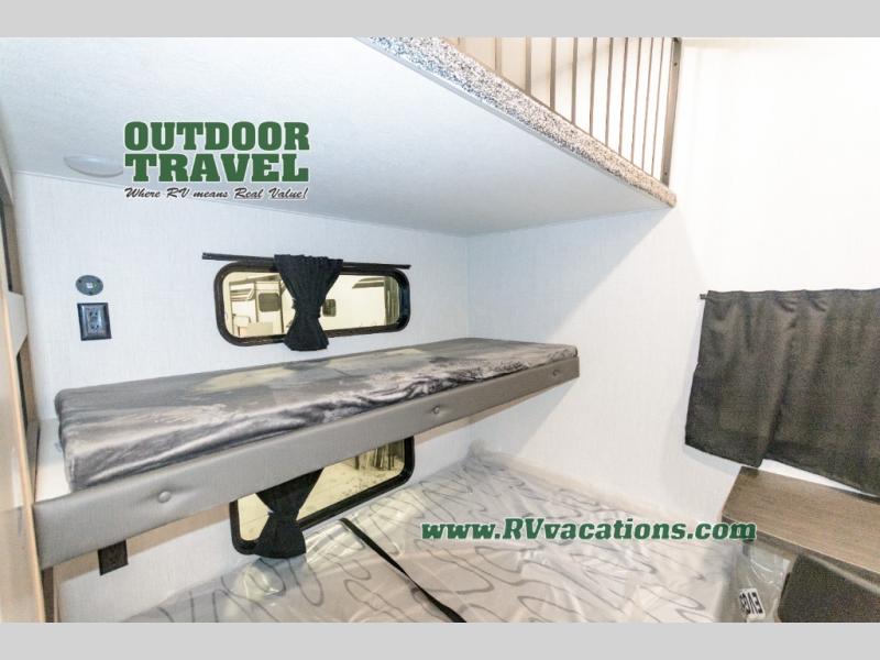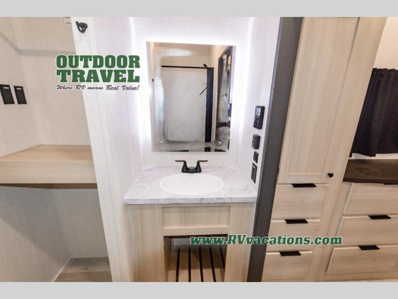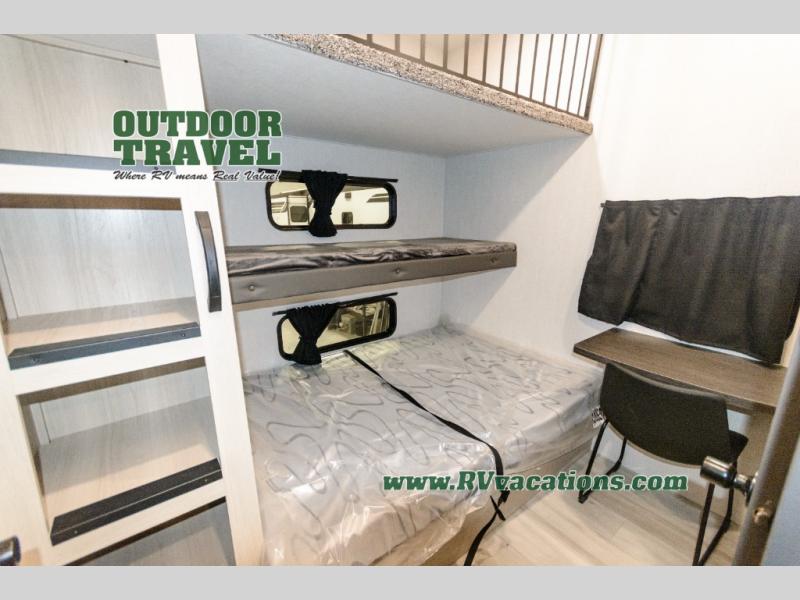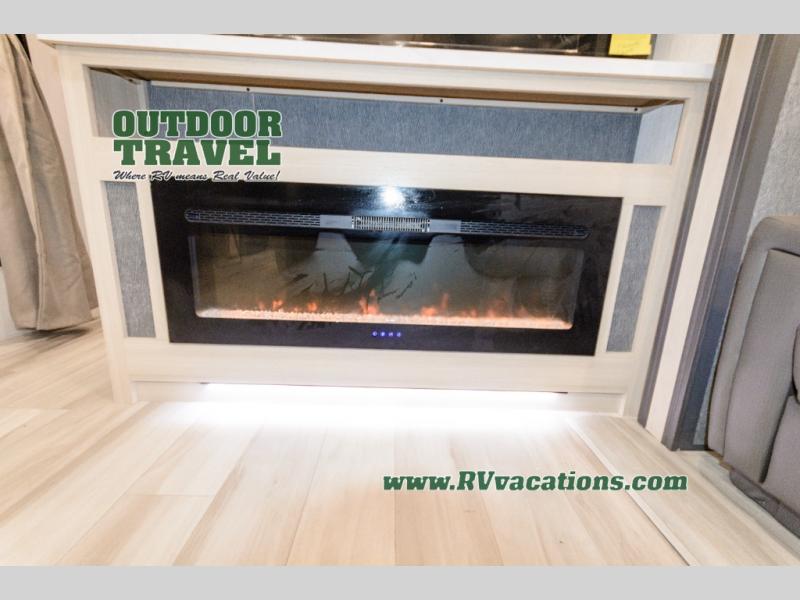 This stunning travel trailer is designed for families and travelers who crave comfort. Two rear bunk beds and a cozy loft above them create a fun and playful sleeping area for kids or guests, perfect for family bonding and sweet dreams. The full bathroom is equipped with everything you need to start your day feeling refreshed and revitalized. In the living area, the entertainment center features a warm fireplace, ideal for chilly evenings and cozy movie nights, while the plush L sofa is the perfect spot to unwind and enjoy quality time with loved ones. The pantry is stocked with storage for your favorite snacks and ingredients, while the fridge keeps everything fresh. There is a well-equipped kitchen with a spacious countertop for added convenience. Plus, the main bedroom is a peaceful sanctuary, featuring a luxurious king bed, spacious wardrobes, a stylish dresser, and the front bathroom is a thoughtful touch, offering privacy for your family or guests.
