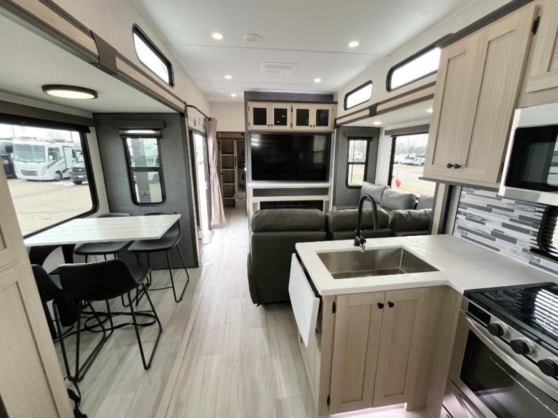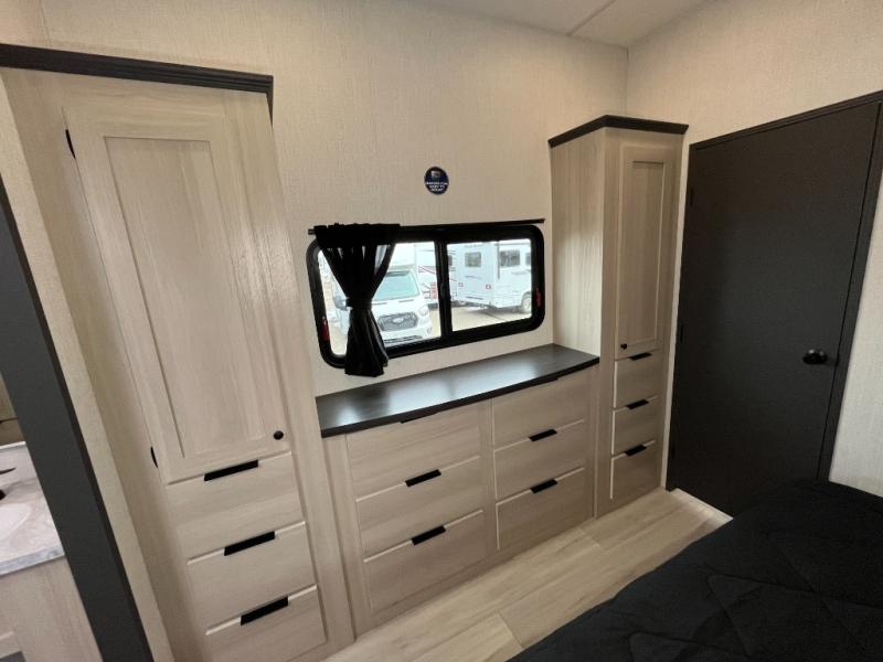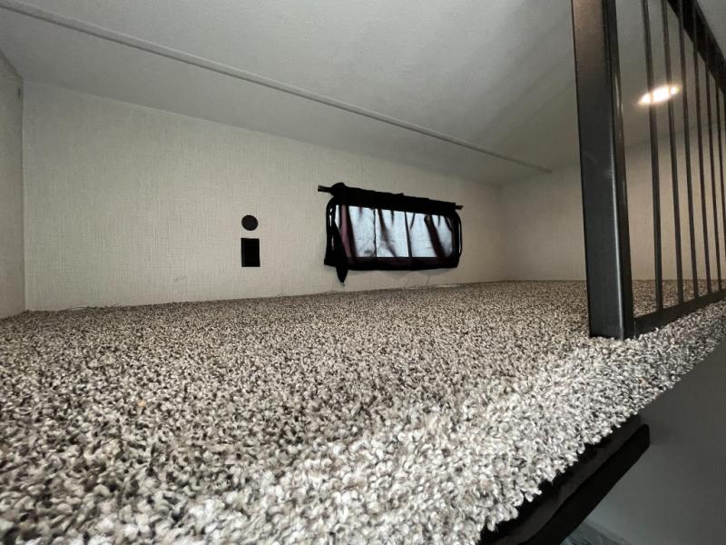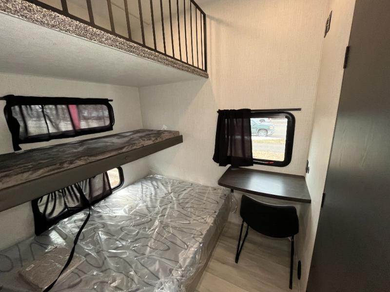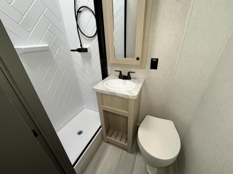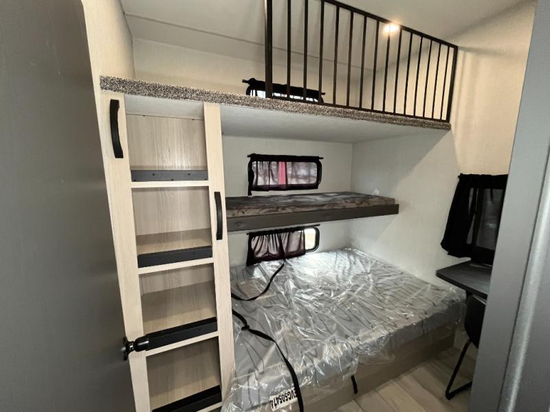 This stunning travel trailer is designed for families and travelers who crave comfort. Two rear bunk beds and a cozy loft above them create a fun and playful sleeping area for kids or guests, perfect for family bonding and sweet dreams. The full bathroom is equipped with everything you need to start your day feeling refreshed and revitalized. In the living area, the entertainment center features a warm fireplace, ideal for chilly evenings and cozy movie nights, while the plush L sofa is the perfect spot to unwind and enjoy quality time with loved ones. The pantry is stocked with storage for your favorite snacks and ingredients, while the fridge keeps everything fresh. There is a well-equipped kitchen with a spacious countertop for added convenience. Plus, the main bedroom is a peaceful sanctuary, featuring a luxurious king bed, spacious wardrobes, a stylish dresser, and the front bathroom is a thoughtful touch, offering privacy for your family or guests.