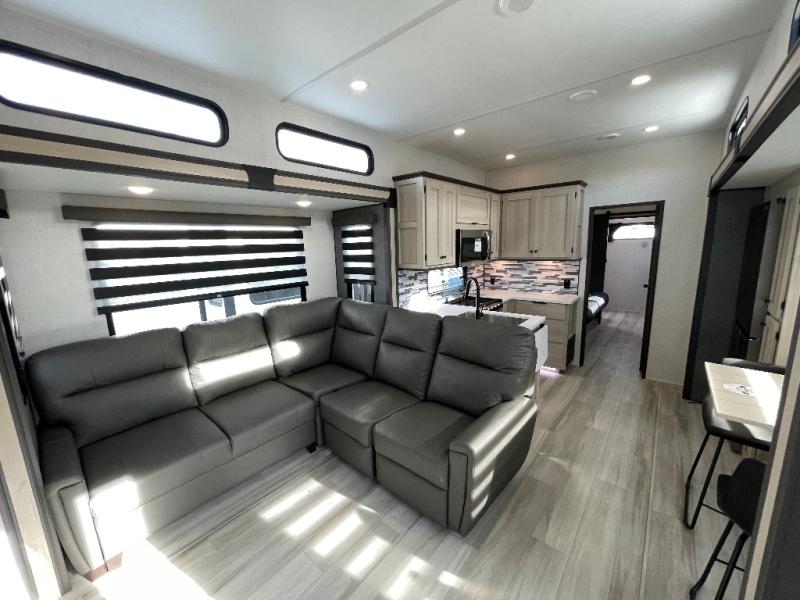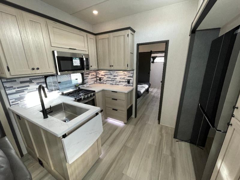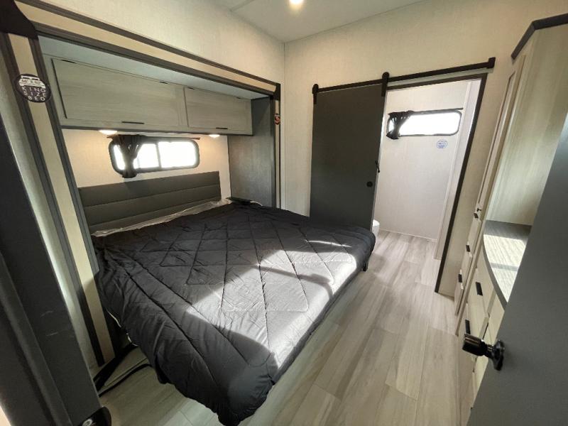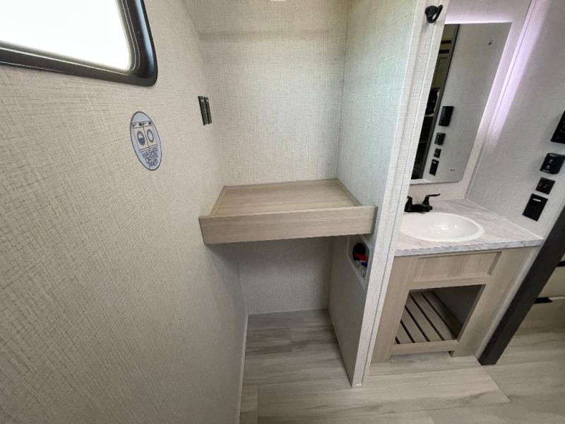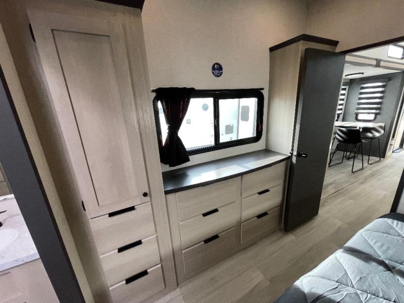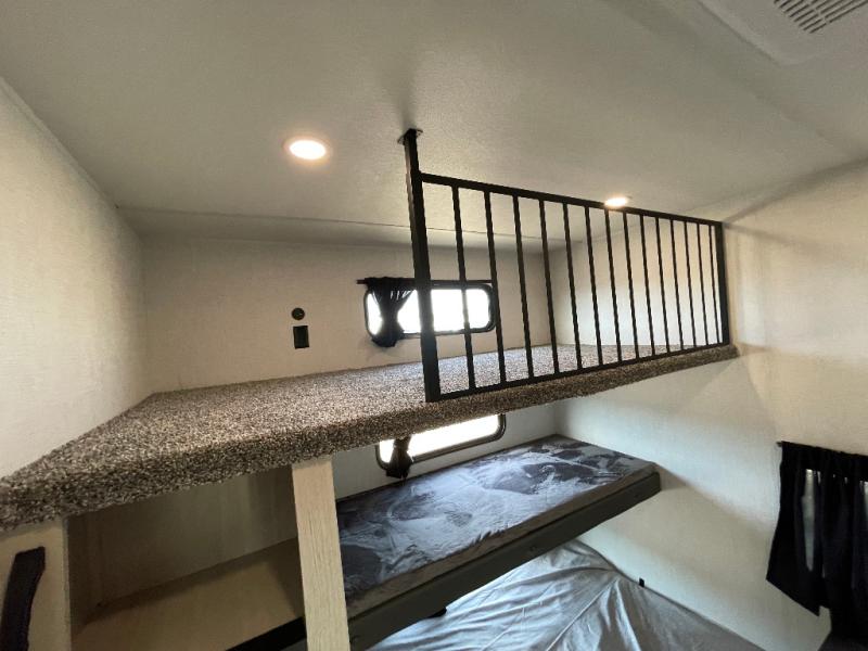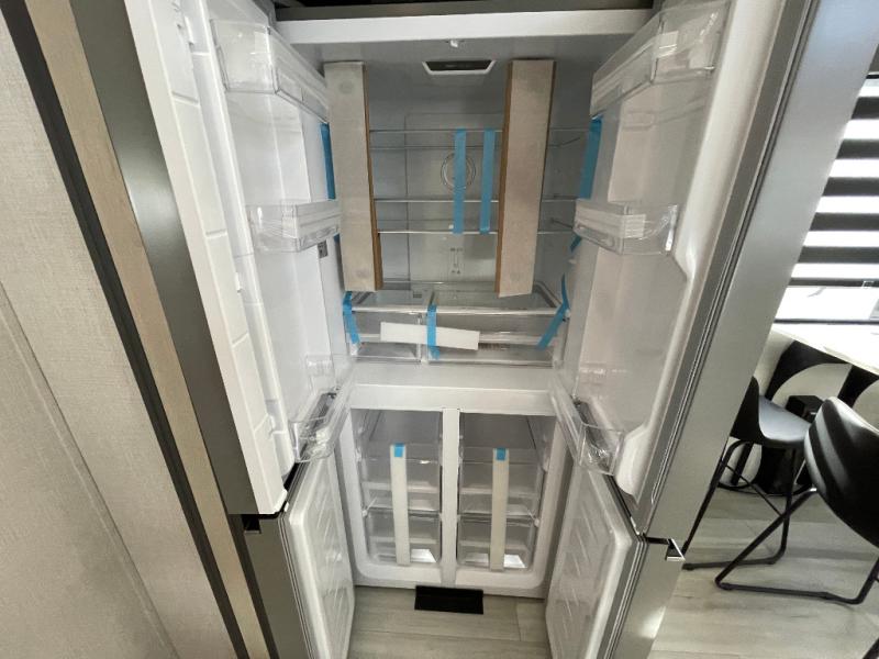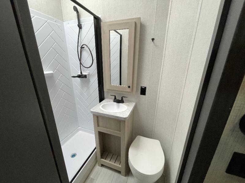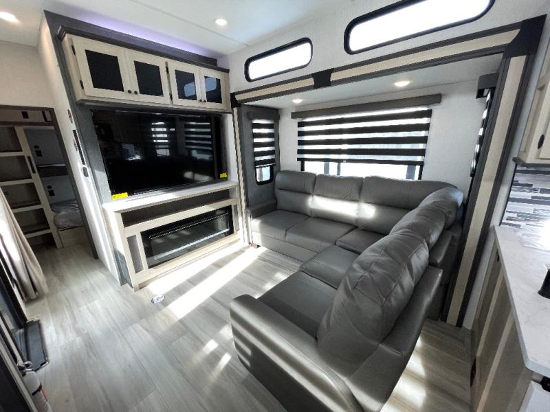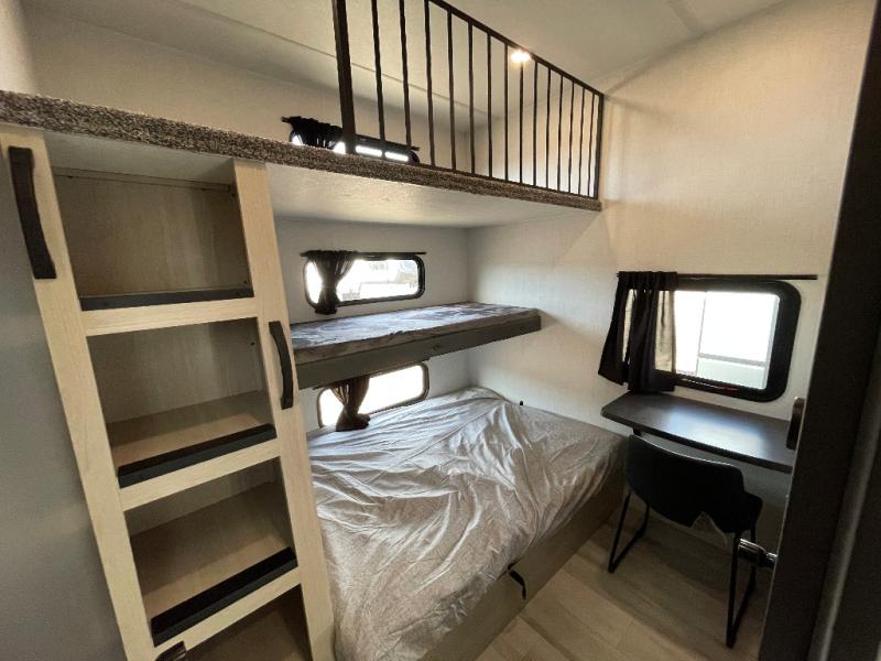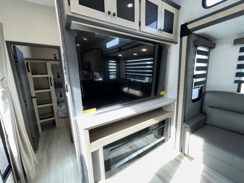 This stunning travel trailer is designed for families and travelers who crave comfort. Two rear bunk beds and a cozy loft above them create a fun and playful sleeping area for kids or guests, perfect for family bonding and sweet dreams. The full bathroom is equipped with everything you need to start your day feeling refreshed and revitalized. In the living area, the entertainment center features a warm fireplace, ideal for chilly evenings and cozy movie nights, while the plush L sofa is the perfect spot to unwind and enjoy quality time with loved ones. The pantry is stocked with storage for your favorite snacks and ingredients, while the fridge keeps everything fresh. There is a well-equipped kitchen with a spacious countertop for added convenience. Plus, the main bedroom is a peaceful sanctuary, featuring a luxurious king bed, spacious wardrobes, a stylish dresser, and the front bathroom is a thoughtful touch, offering privacy for your family or guests.