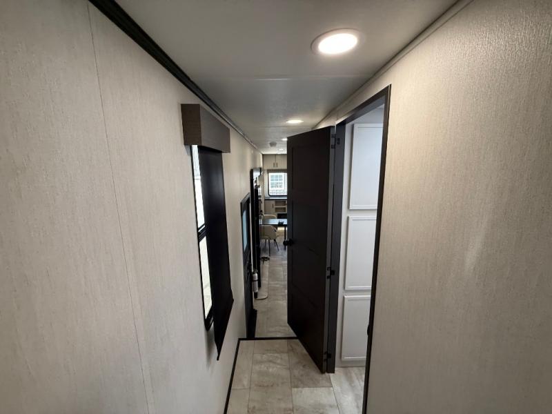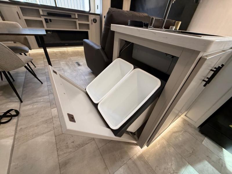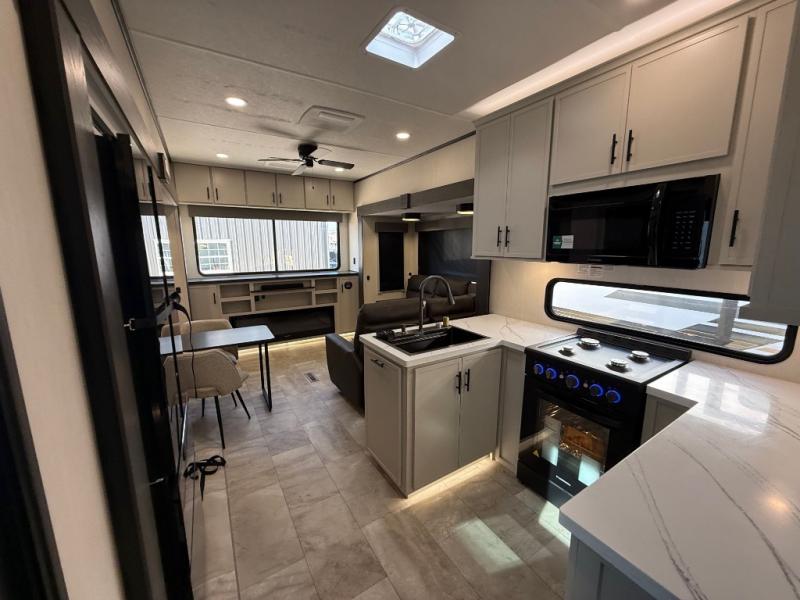 This fifth wheel is designed for comfort and making memories. The main living area is the perfect spot to relax and unwind, featuring a spacious sleeper sectional sofa with two recliners great for movie nights or just lounging around. A massive 70-inch 4K smart TV on a Televator lets you catch your favorite shows or stream the latest movies, the cozy 60-inch fireplace adds the perfect ambiance after a day full of adventure. Whether you're gathering for a meal or checking emails, the space-saving desk/dinette offers versatility for your activities. The middle U-shaped kitchen provides plenty of prep space and includes a pull-out pantry to keep all your snacks organized and within reach. Moving forward, the full bathroom features a dual vanity, allowing for two people to get ready at the same time. At the front, the private bedroom includes a spacious king-size bed, a generous closet for all your essentials, and stackable washer/dryer prep for added convenience on longer trips.
