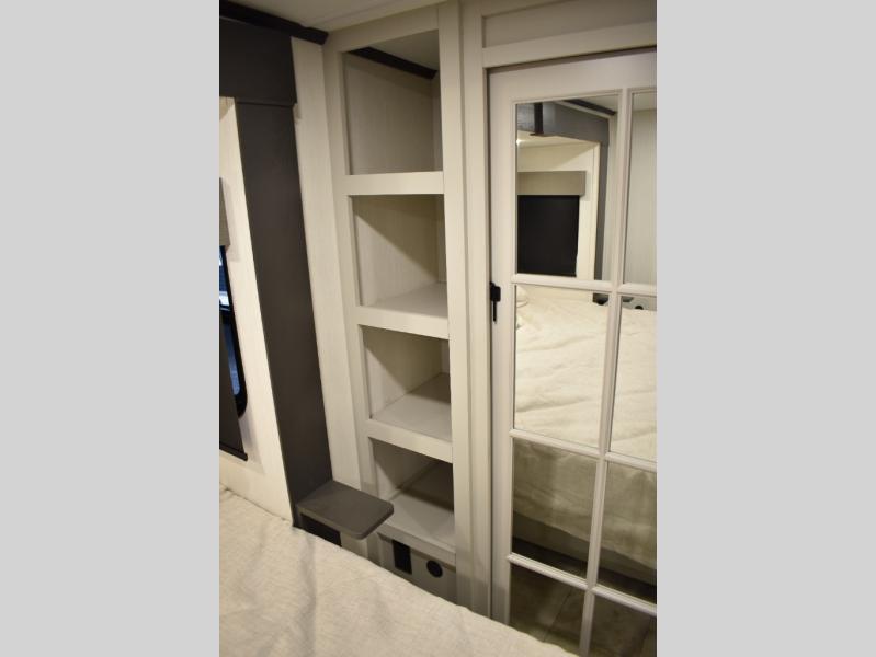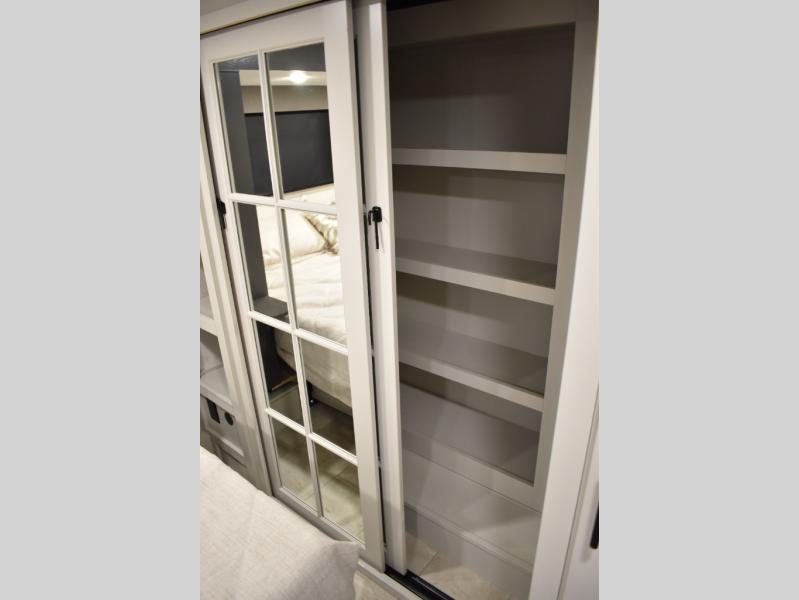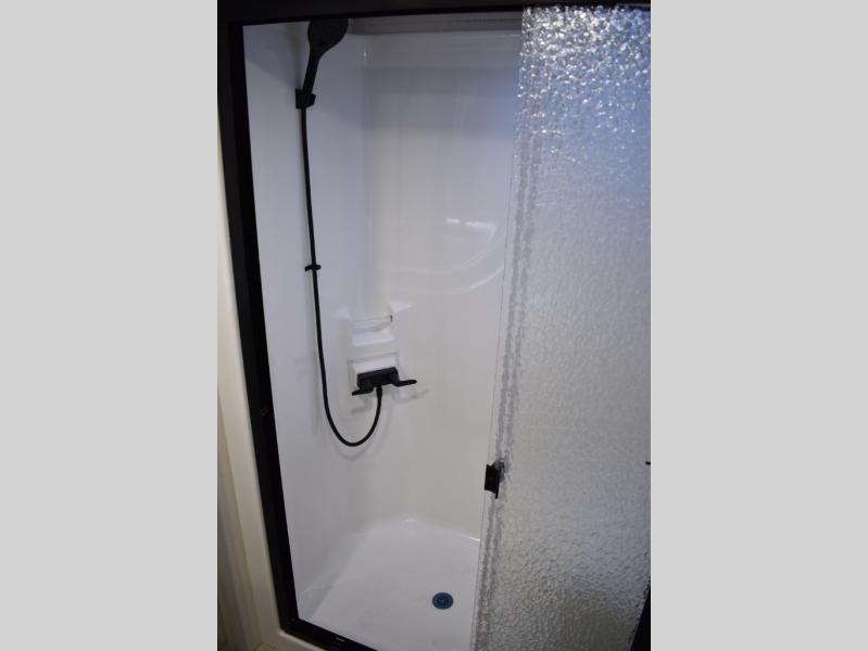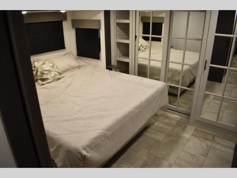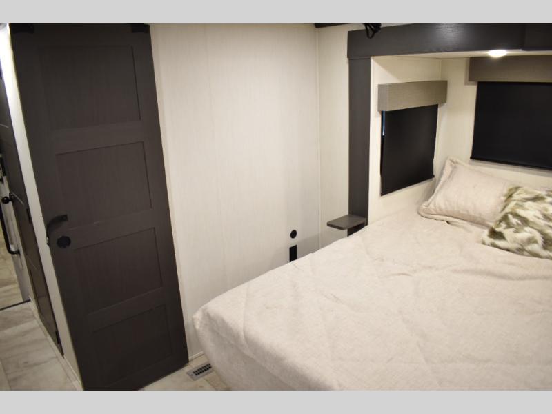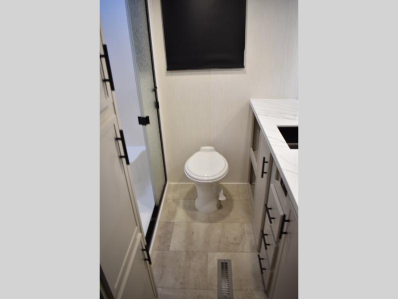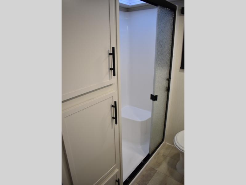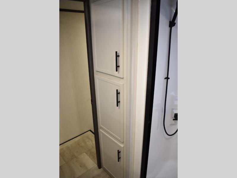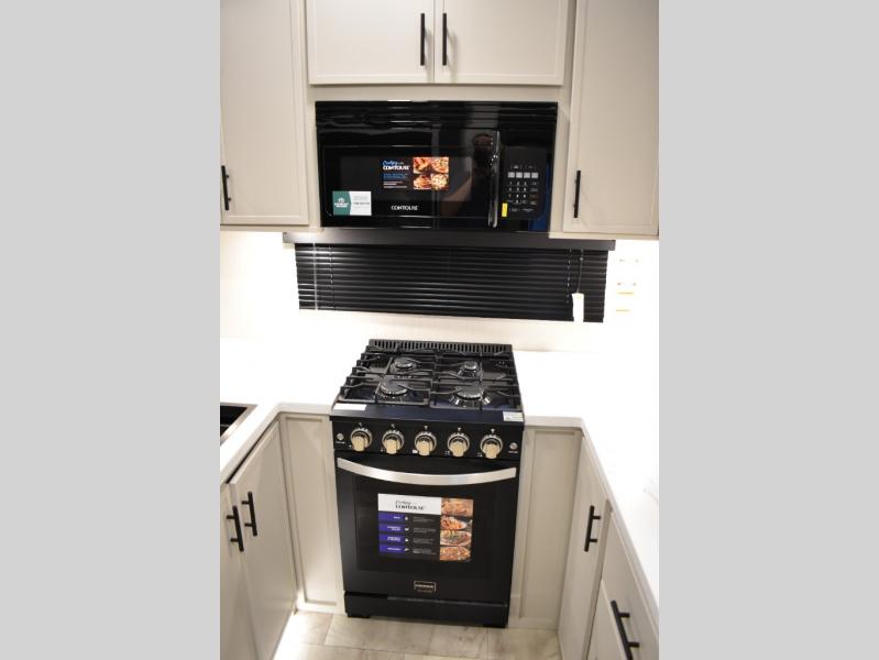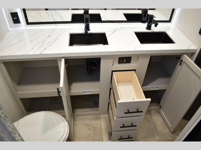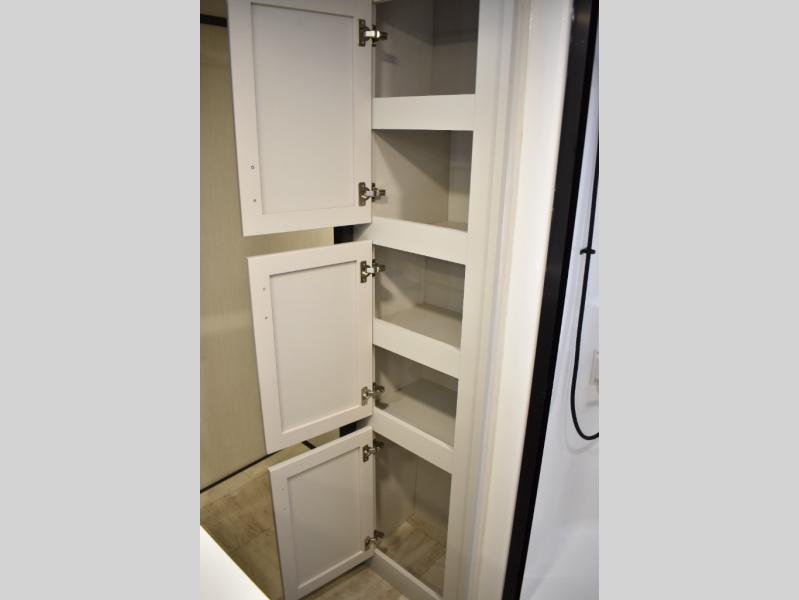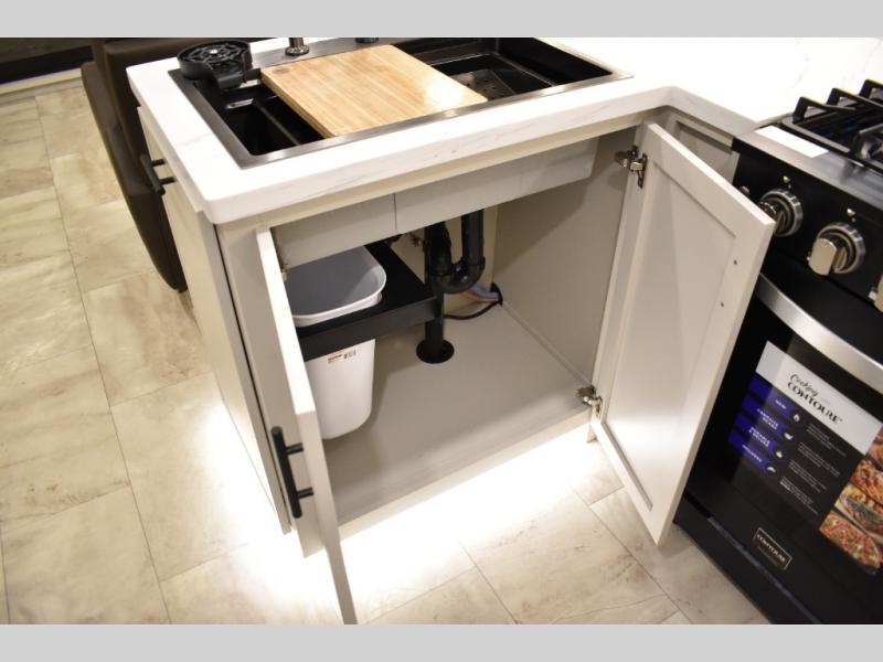The Sanibel series stands out with a combination of unique and highly functional exterior and interior features designed for both convenience and durability. On the outside, a drop-frame pass-through storage area with a rubberized liner offers ample space while protecting your gear from moisture and wear. Setting up camp is effortless thanks to the one-touch auto-leveling system and rubberized suspension equalizer, which provide a smooth and stable foundation. Inside, comfort meets practicality with carpet less slides for easy cleaning and blackout roller shades for privacy and temperature control. The real wood cabinet doors and solid surface countertops add a touch of elegance, no matter where the road takes you.