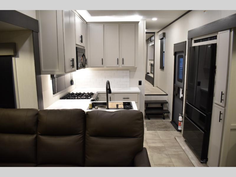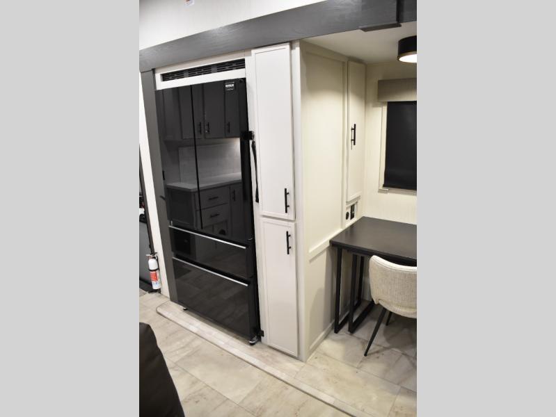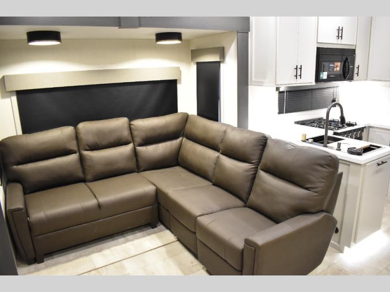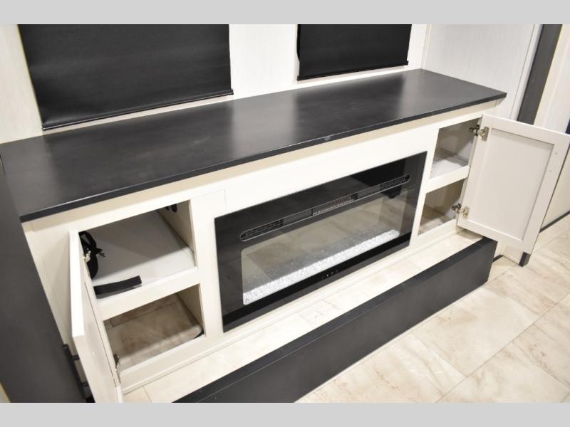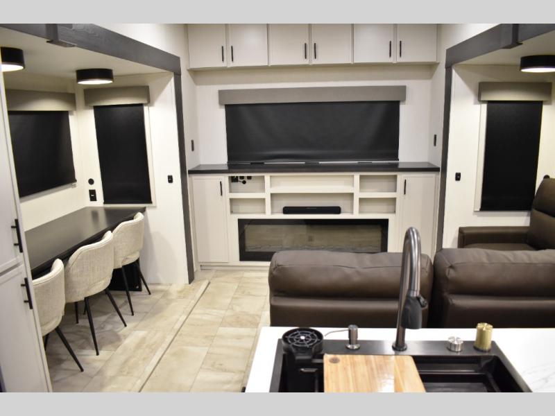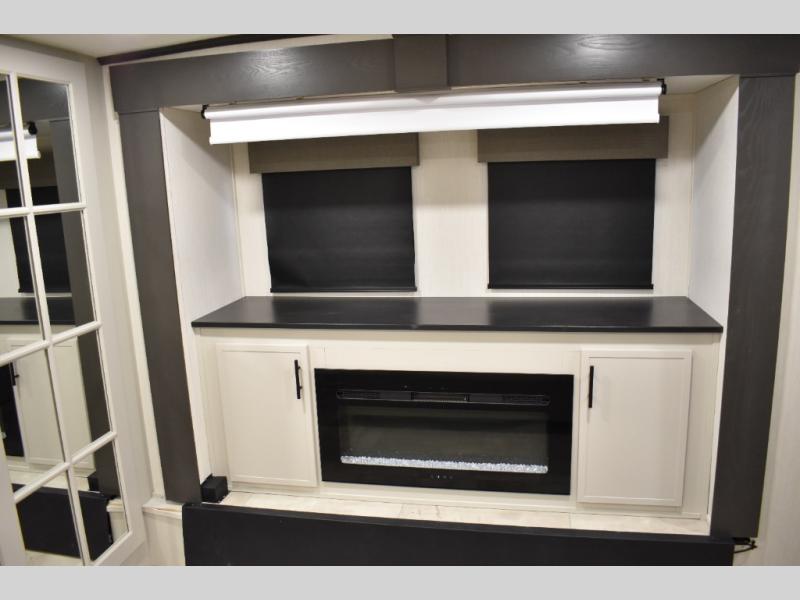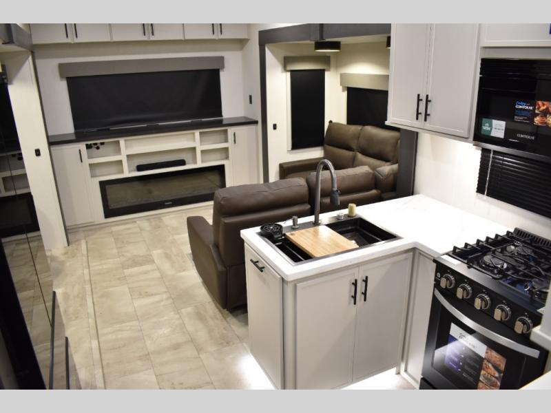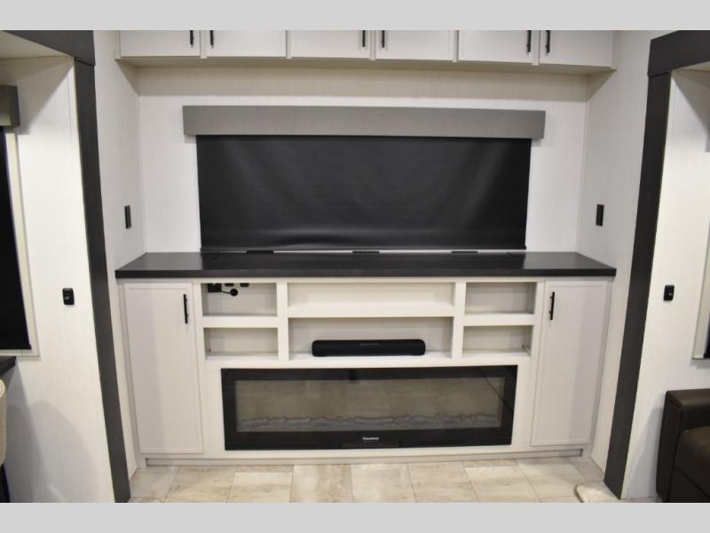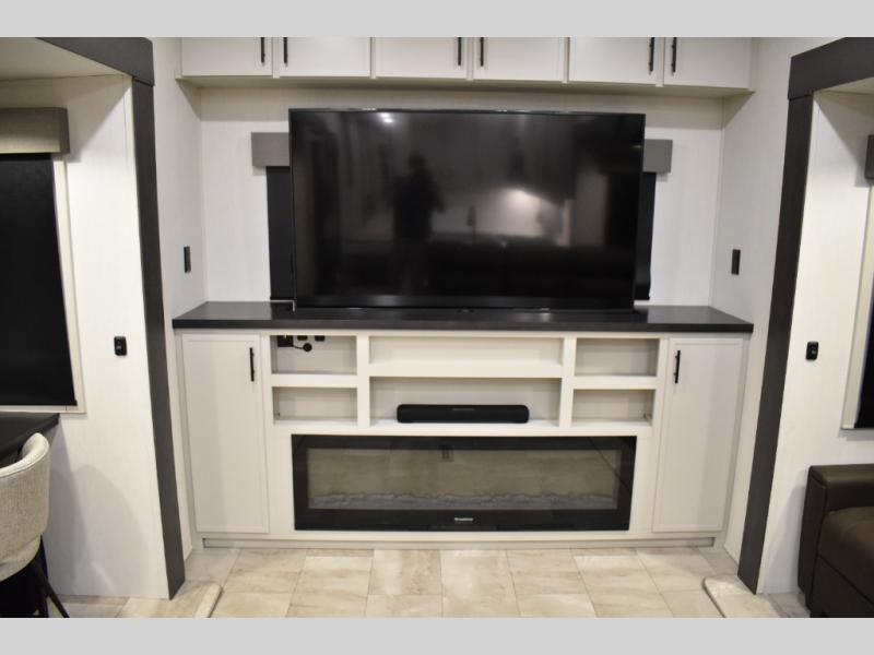 This fifth wheel is designed for comfort and making memories. The main living area is the perfect spot to relax and unwind, featuring a spacious sleeper sectional sofa with two recliners great for movie nights or just lounging around. A massive 70-inch 4K smart TV on a Televator lets you catch your favorite shows or stream the latest movies, the cozy 60-inch fireplace adds the perfect ambiance after a day full of adventure. Whether you're gathering for a meal or checking emails, the space-saving desk/dinette offers versatility for your activities. The middle U-shaped kitchen provides plenty of prep space and includes a pull-out pantry to keep all your snacks organized and within reach. Moving forward, the full bathroom features a dual vanity, allowing for two people to get ready at the same time. At the front, the private bedroom includes a spacious king-size bed, a generous closet for all your essentials, and stackable washer/dryer prep for added convenience on longer trips.