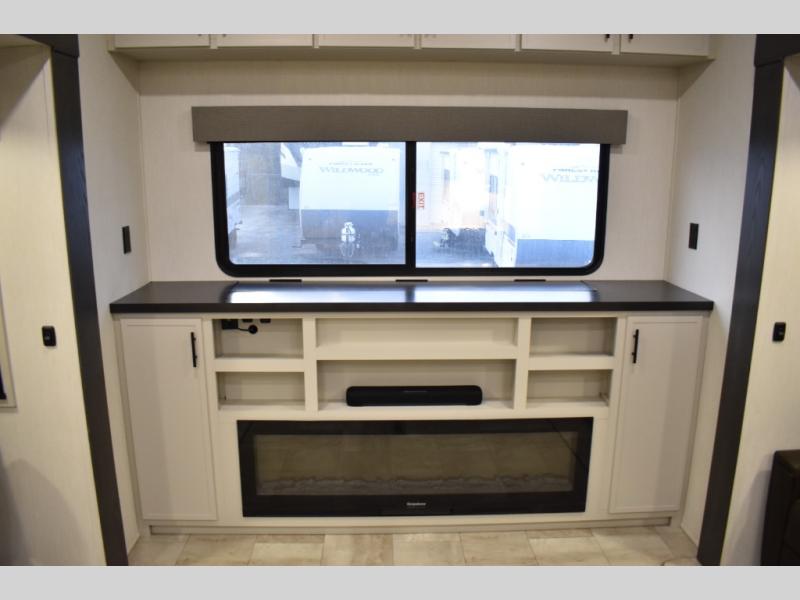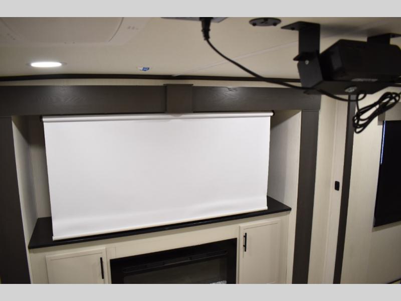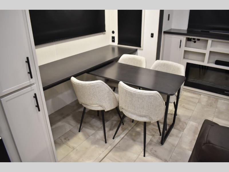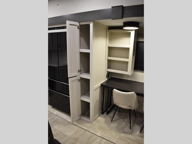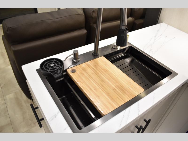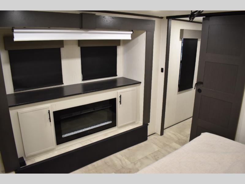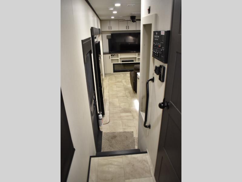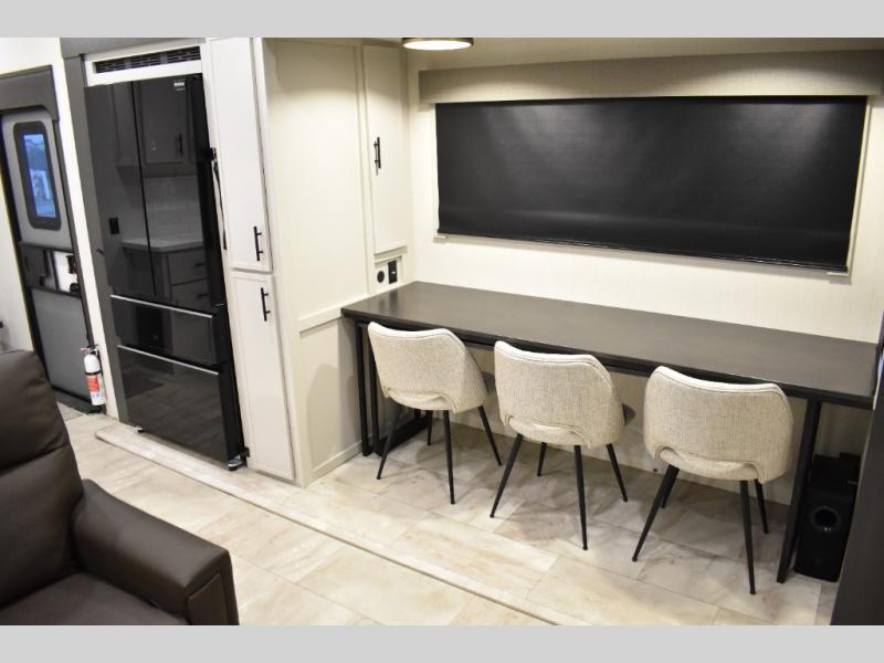 This fifth wheel is designed for comfort and making memories. The main living area is the perfect spot to relax and unwind, featuring a spacious sleeper sectional sofa with two recliners great for movie nights or just lounging around. A massive 70-inch 4K smart TV on a Televator lets you catch your favorite shows or stream the latest movies, the cozy 60-inch fireplace adds the perfect ambiance after a day full of adventure. Whether you're gathering for a meal or checking emails, the space-saving desk/dinette offers versatility for your activities. The middle U-shaped kitchen provides plenty of prep space and includes a pull-out pantry to keep all your snacks organized and within reach. Moving forward, the full bathroom features a dual vanity, allowing for two people to get ready at the same time. At the front, the private bedroom includes a spacious king-size bed, a generous closet for all your essentials, and stackable washer/dryer prep for added convenience on longer trips.