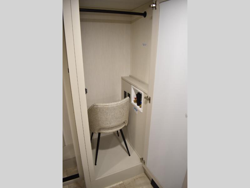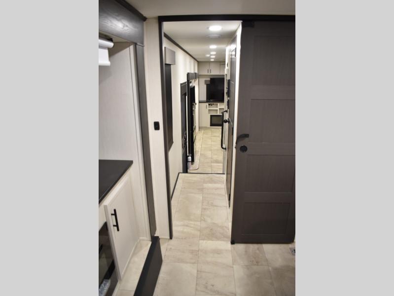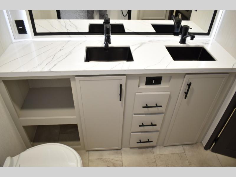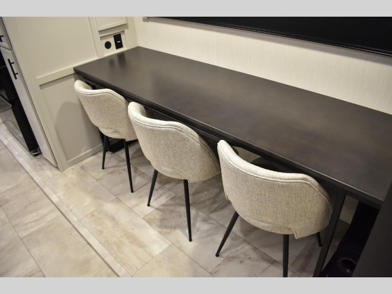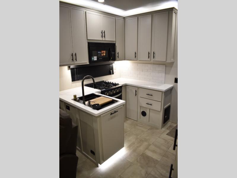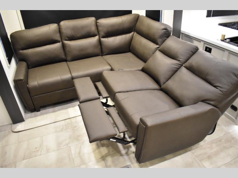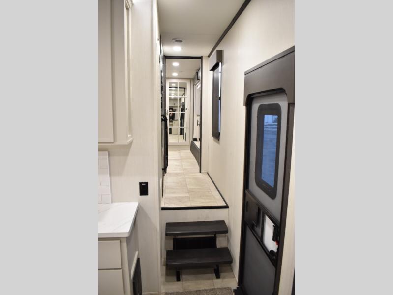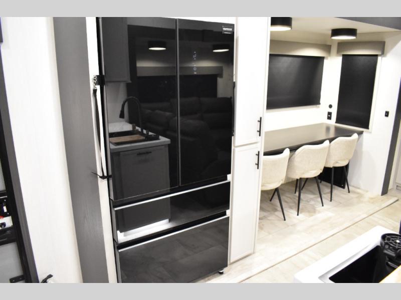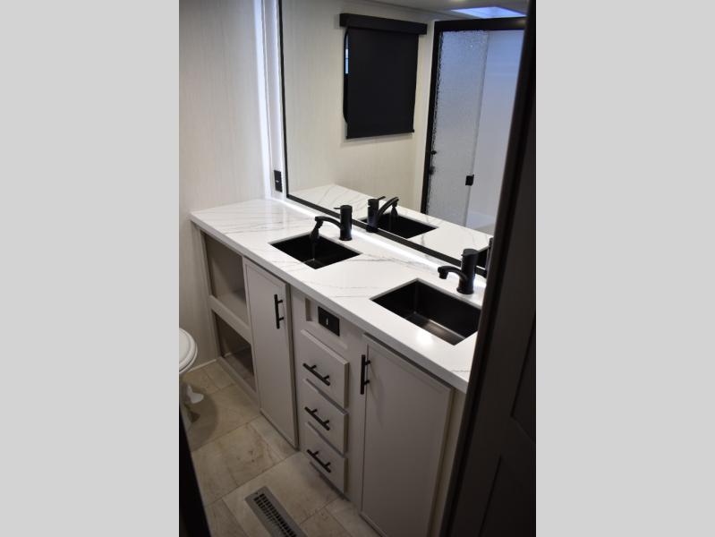 This fifth wheel is designed for comfort and making memories. The main living area is the perfect spot to relax and unwind, featuring a spacious sleeper sectional sofa with two recliners great for movie nights or just lounging around. A massive 70-inch 4K smart TV on a Televator lets you catch your favorite shows or stream the latest movies, the cozy 60-inch fireplace adds the perfect ambiance after a day full of adventure. Whether you're gathering for a meal or checking emails, the space-saving desk/dinette offers versatility for your activities. The middle U-shaped kitchen provides plenty of prep space and includes a pull-out pantry to keep all your snacks organized and within reach. Moving forward, the full bathroom features a dual vanity, allowing for two people to get ready at the same time. At the front, the private bedroom includes a spacious king-size bed, a generous closet for all your essentials, and stackable washer/dryer prep for added convenience on longer trips.