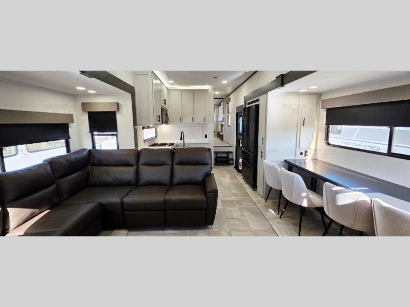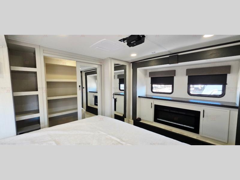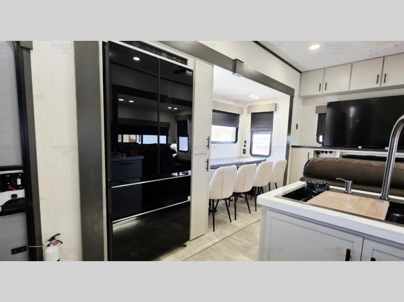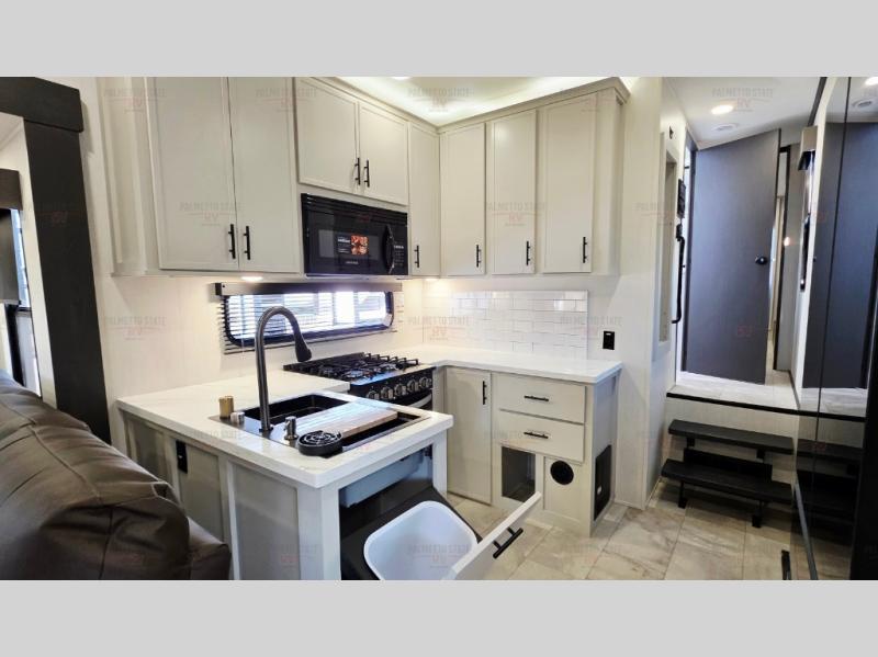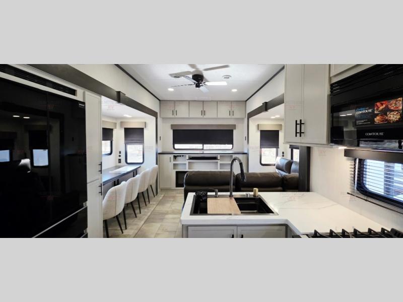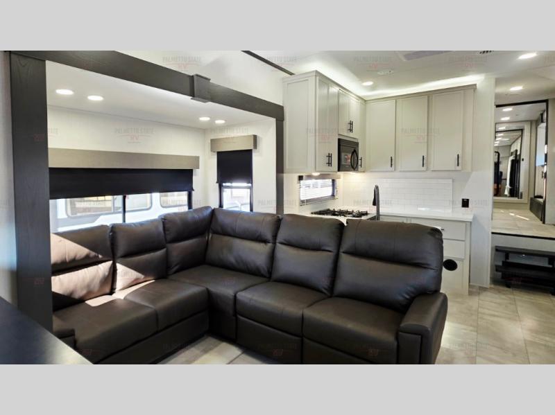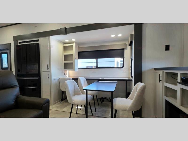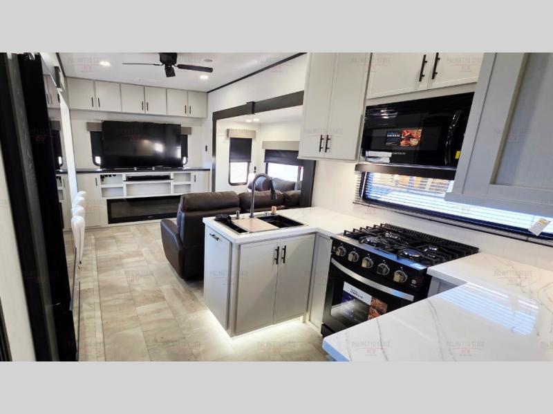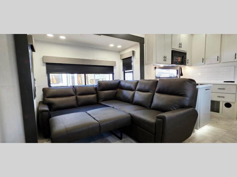 This fifth wheel is designed for comfort and making memories. The main living area is the perfect spot to relax and unwind, featuring a spacious sleeper sectional sofa with two recliners great for movie nights or just lounging around. A massive 70-inch 4K smart TV on a Televator lets you catch your favorite shows or stream the latest movies, the cozy 60-inch fireplace adds the perfect ambiance after a day full of adventure. Whether you're gathering for a meal or checking emails, the space-saving desk/dinette offers versatility for your activities. The middle U-shaped kitchen provides plenty of prep space and includes a pull-out pantry to keep all your snacks organized and within reach. Moving forward, the full bathroom features a dual vanity, allowing for two people to get ready at the same time. At the front, the private bedroom includes a spacious king-size bed, a generous closet for all your essentials, and stackable washer/dryer prep for added convenience on longer trips.