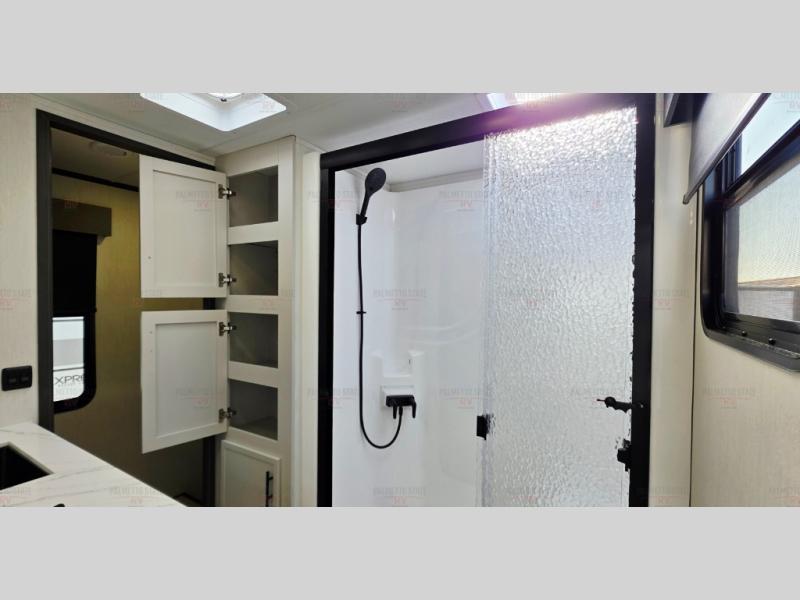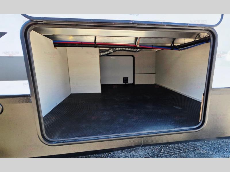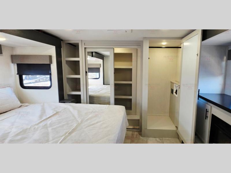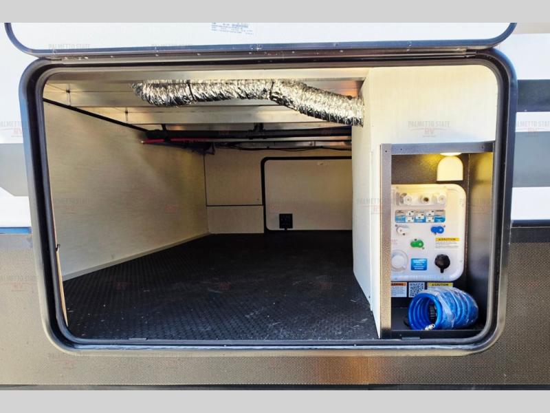 The Sanibel series stands out with a combination of unique and highly functional exterior and interior features designed for both convenience and durability. On the outside, a drop-frame pass-through storage area with a rubberized liner offers ample space while protecting your gear from moisture and wear. Setting up camp is effortless thanks to the one-touch auto-leveling system and rubberized suspension equalizer, which provide a smooth and stable foundation. Inside, comfort meets practicality with carpet less slides for easy cleaning and blackout roller shades for privacy and temperature control. The real wood cabinet doors and solid surface countertops add a touch of elegance, no matter where the road takes you.