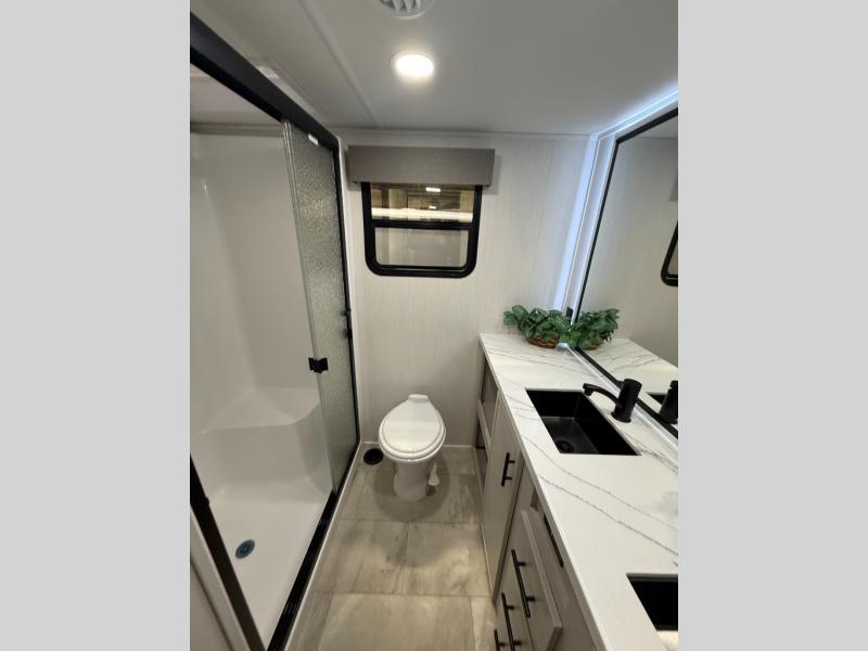 The Sanibel series stands out with a combination of unique and highly functional exterior and interior features designed for both convenience and durability. On the outside, a drop-frame pass-through storage area with a rubberized liner offers ample space while protecting your gear from moisture and wear. Setting up camp is effortless thanks to the one-touch auto-leveling system and rubberized suspension equalizer, which provide a smooth and stable foundation. Inside, comfort meets practicality with carpet less slides for easy cleaning and blackout roller shades for privacy and temperature control. The real wood cabinet doors and solid surface countertops add a touch of elegance, no matter where the road takes you.